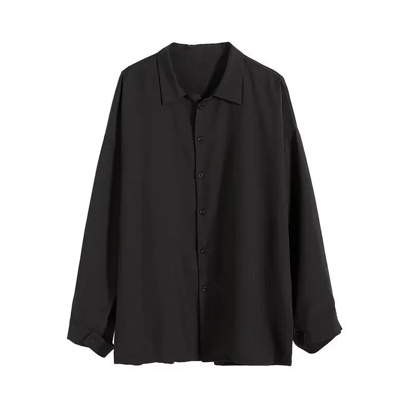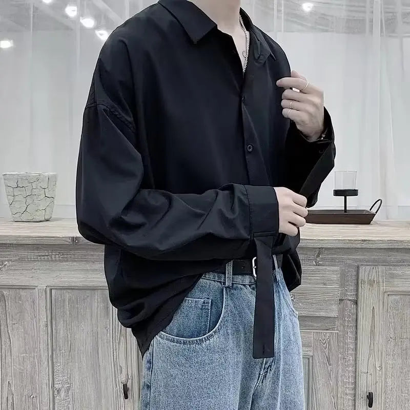 WIAOFELLAS - Fashion Men's Solid Color Ribbon Design Loose Shirts Trendy Long Sleeves Turn Down Collar Tops Male 2025 Summer