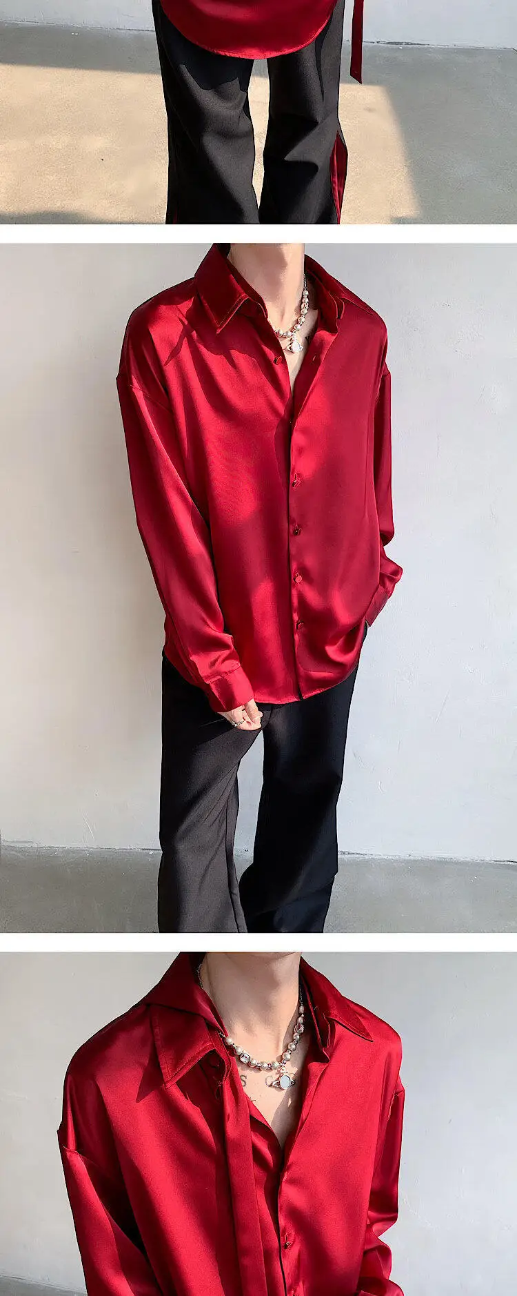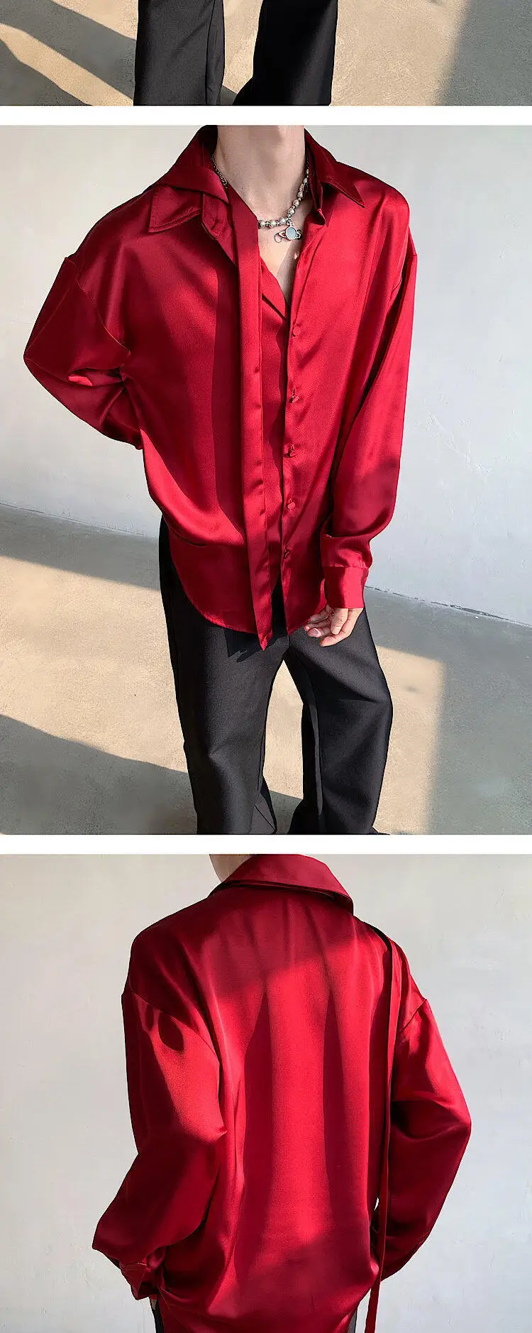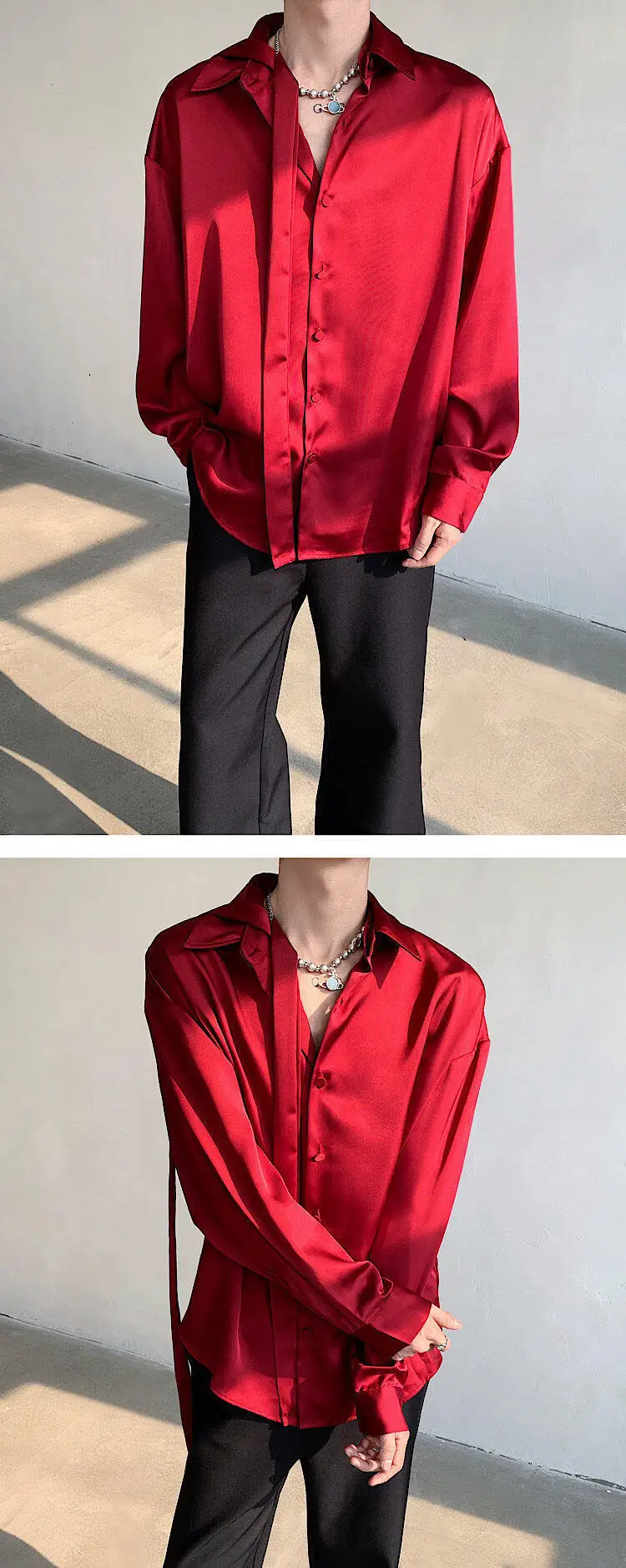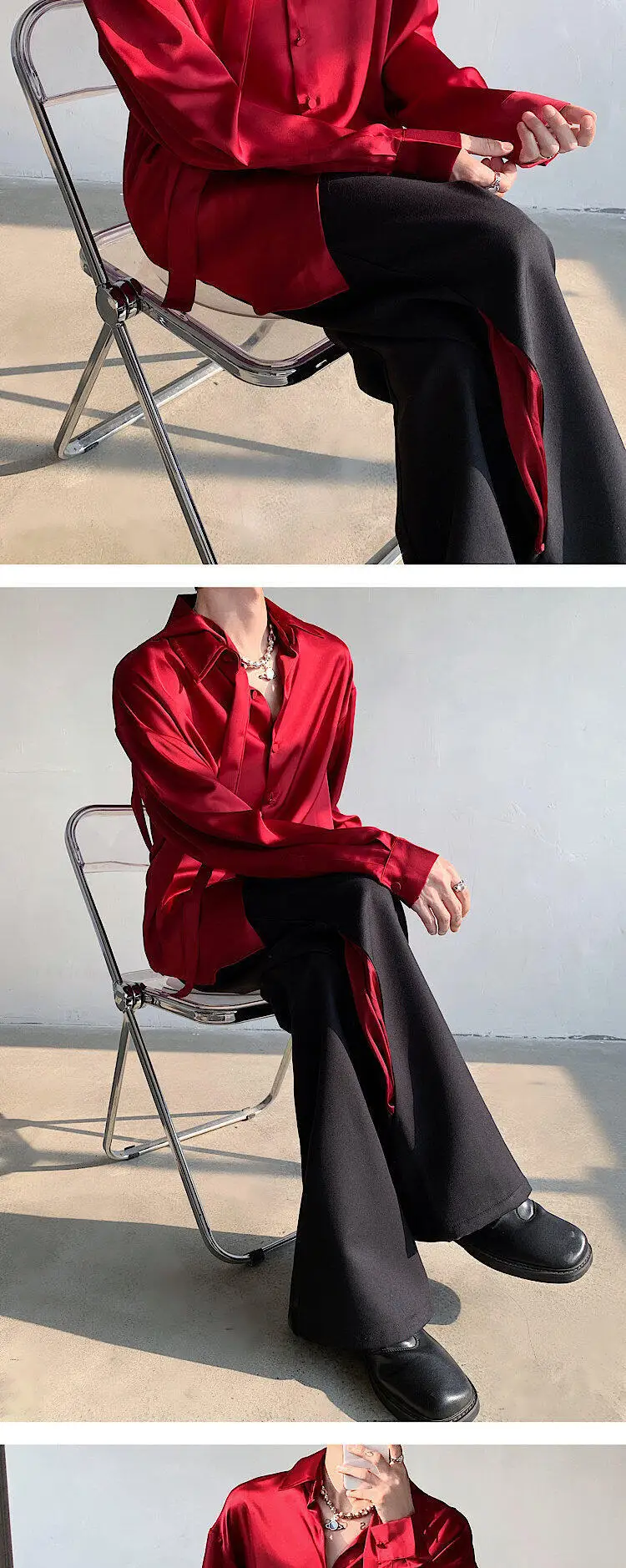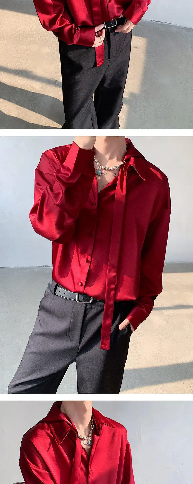 WIAOFELLAS  -  Fashion Men's Solid Color Ribbon Turn Down Collar Shirts Trendy Long Sleeves Single-breasted Tops Male Summer