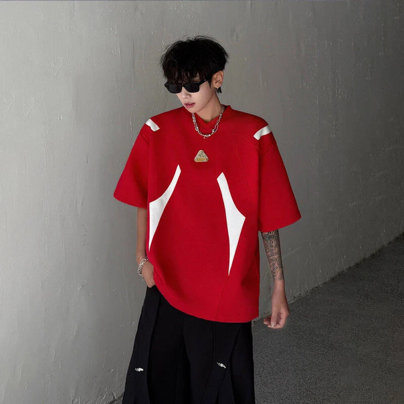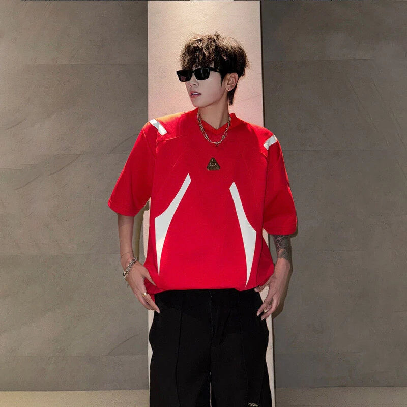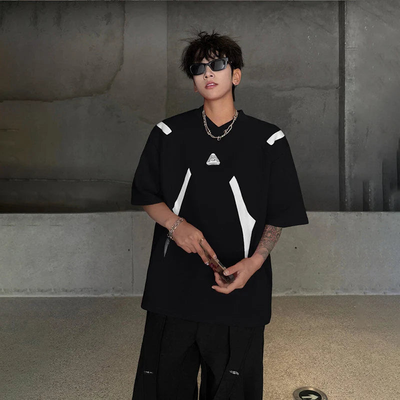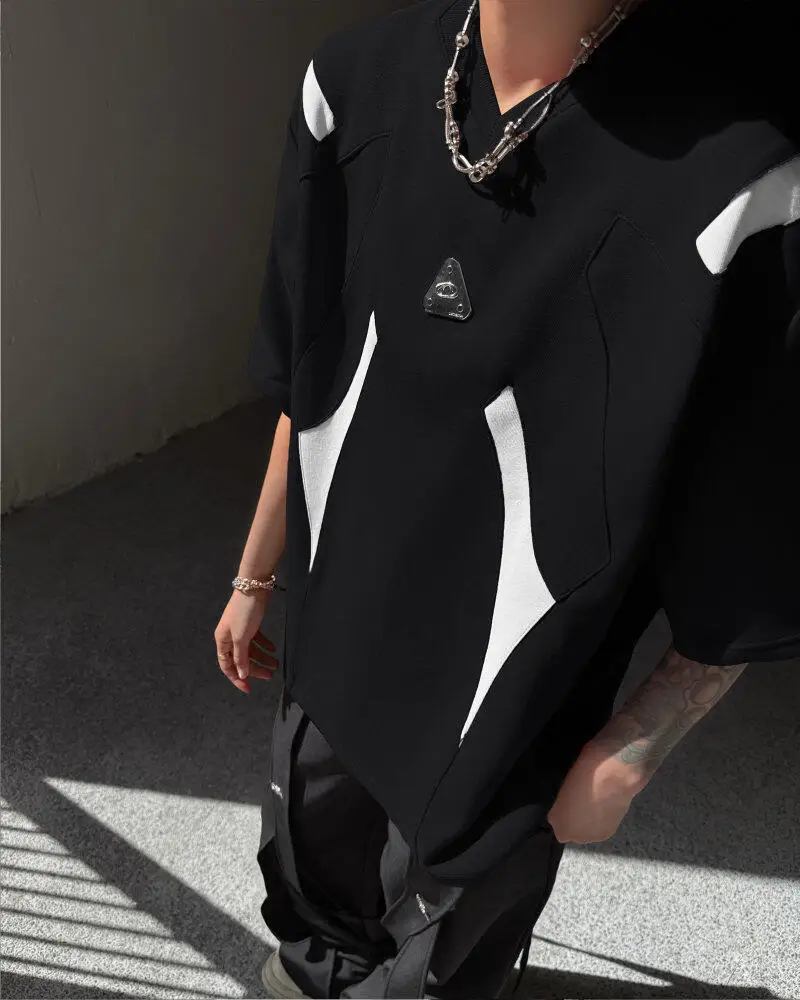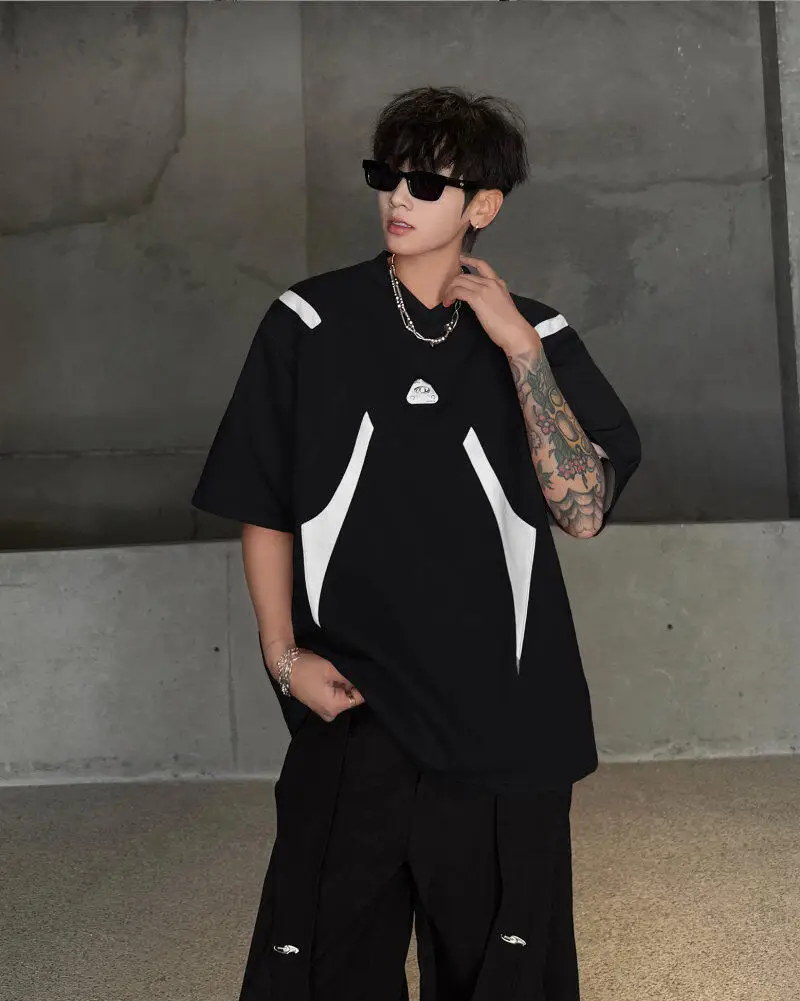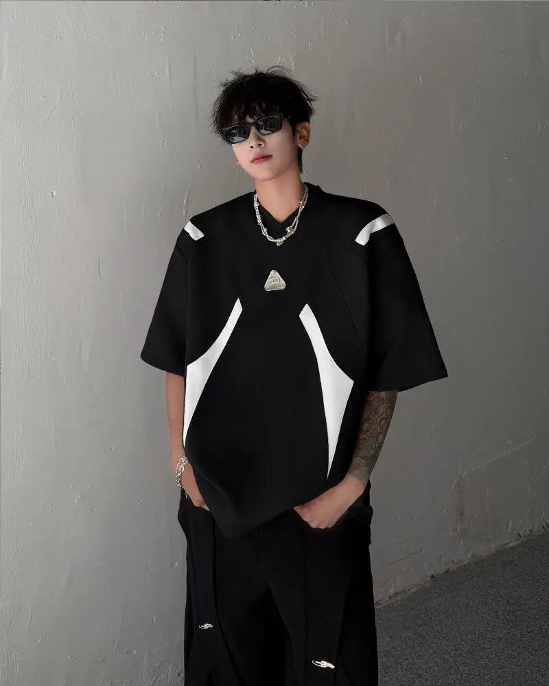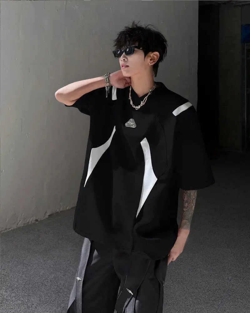 WIAOFELLAS  -  Fashion Men's Spliced Metal Contrast Color Shoulder Pads T-shirts Trendy Short Sleeves O-neck Tops Male 2025 Summer