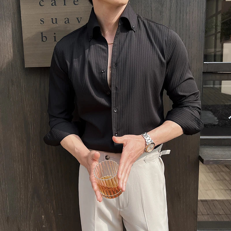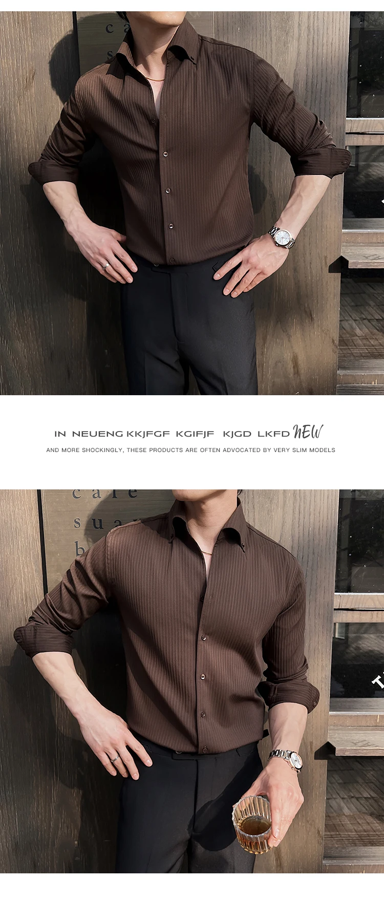 WIAOFELLAS  -  High End Business Formal Long Sleeve Striped Shirt for Men Casual V-Neck Slim Men's Dress Shirts Resistant Wrinkle Versatile Top