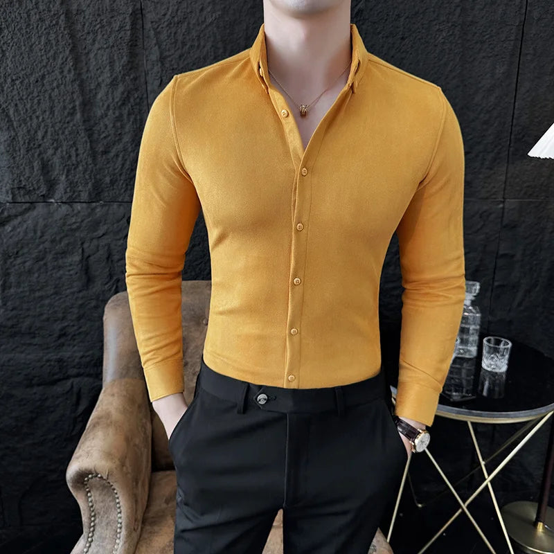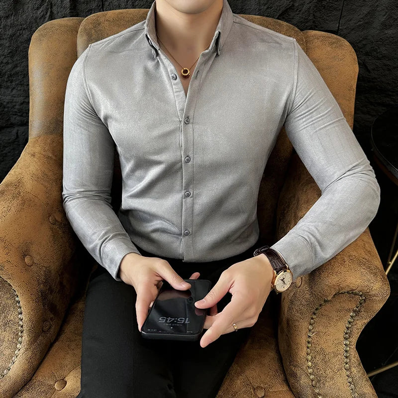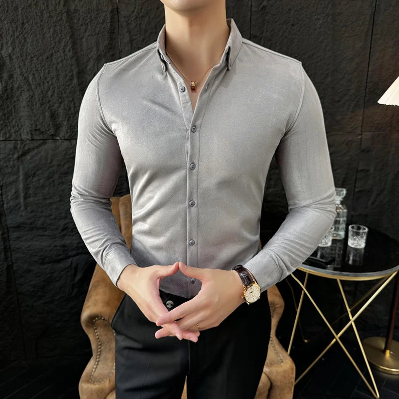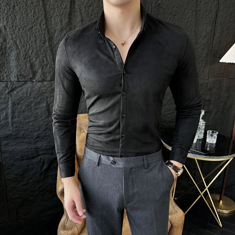 WIAOFELLAS - High-end Velvet Shirts for Men Long Sleeved Slim Lapel Social Camisas De Hombre Luxury Handsome Autumn Mens Clothing Plus Size