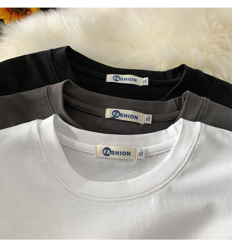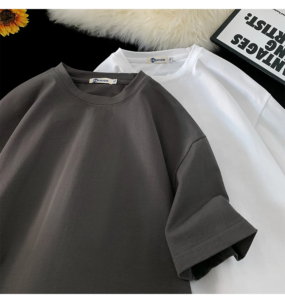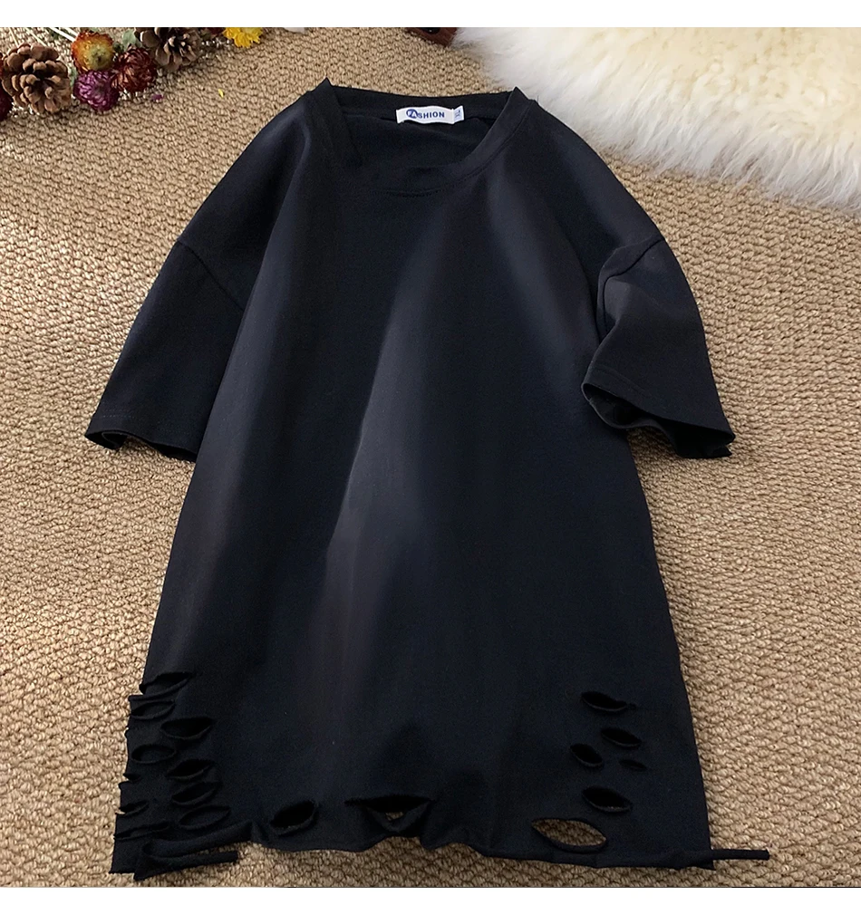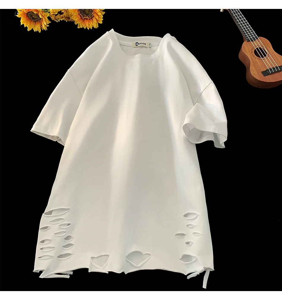 WIAOFELLAS - Hip-hop Street Mens T-Shirt Broken Hole Design T-Shirt Basic Solid Colour Round Neck Short Sleeve Top Casual Loose T-Shirt
