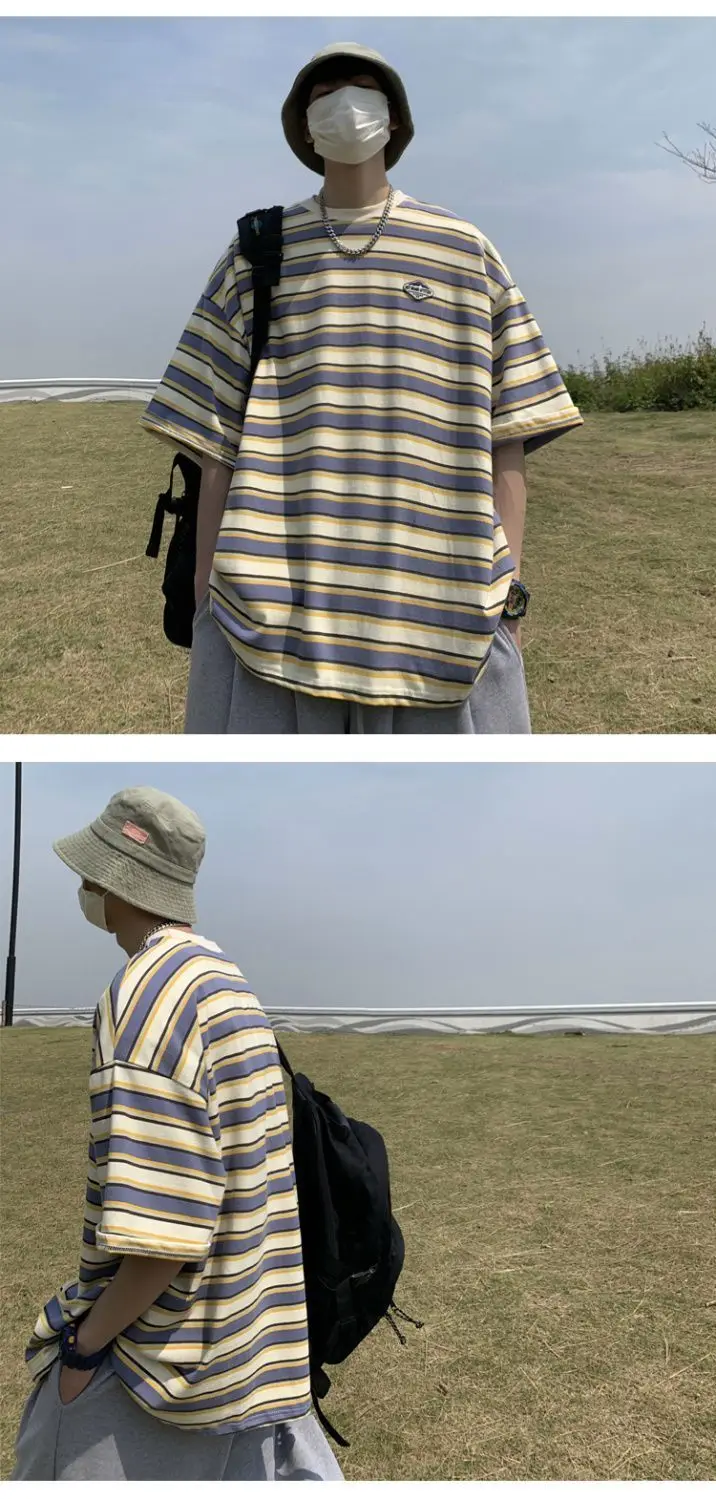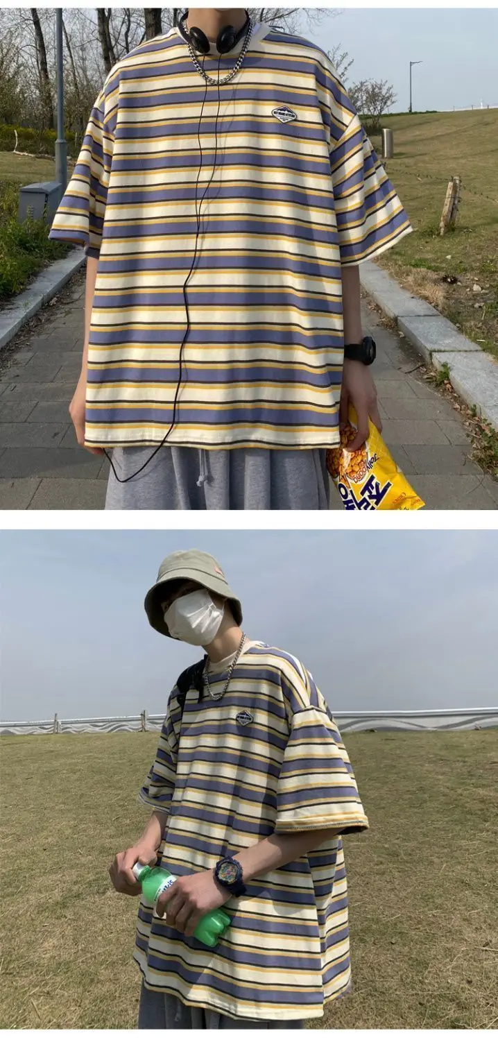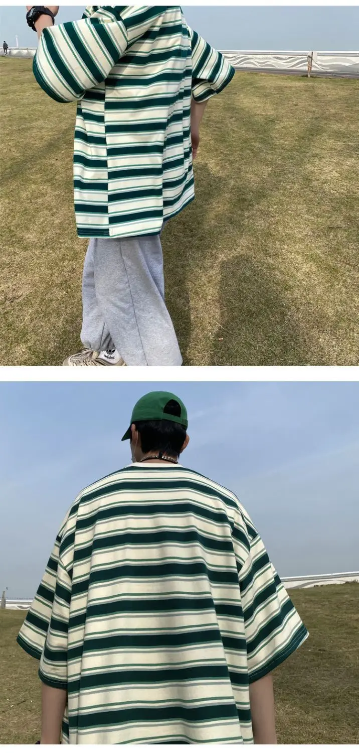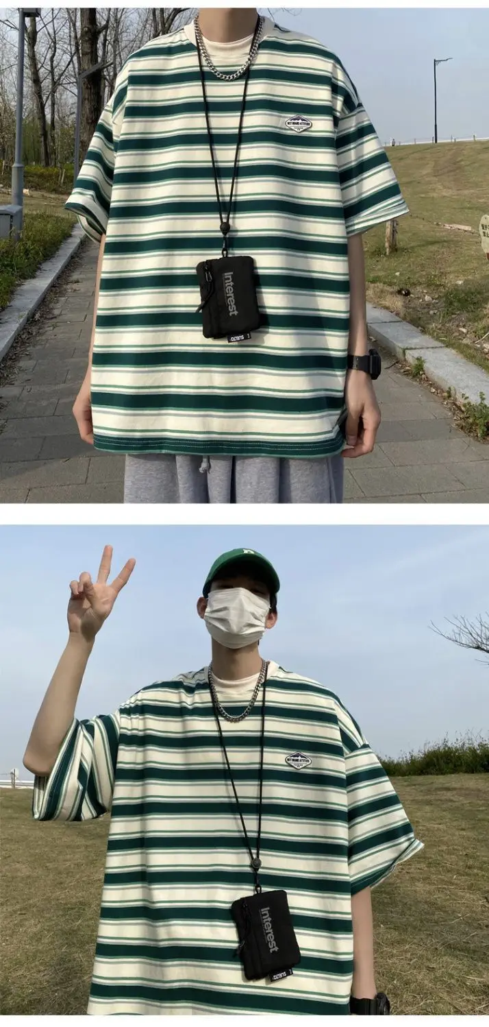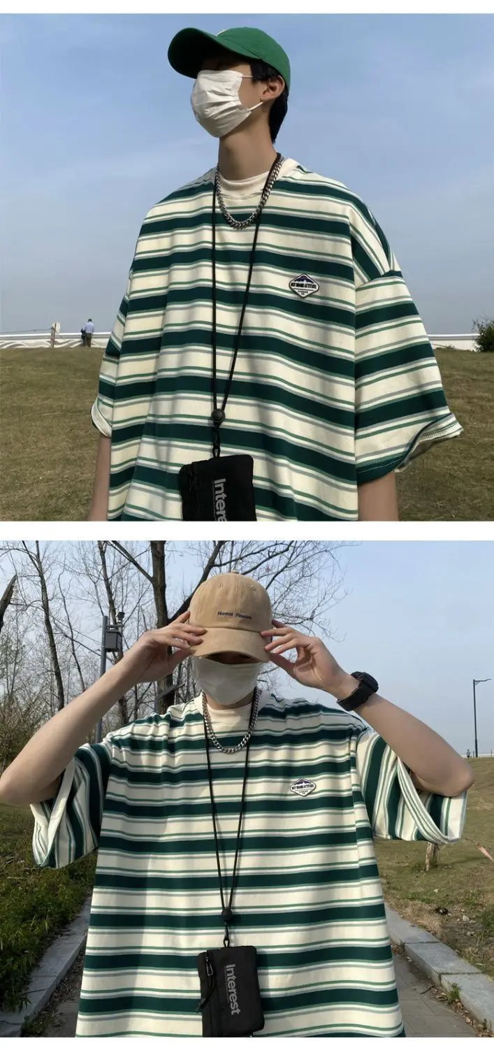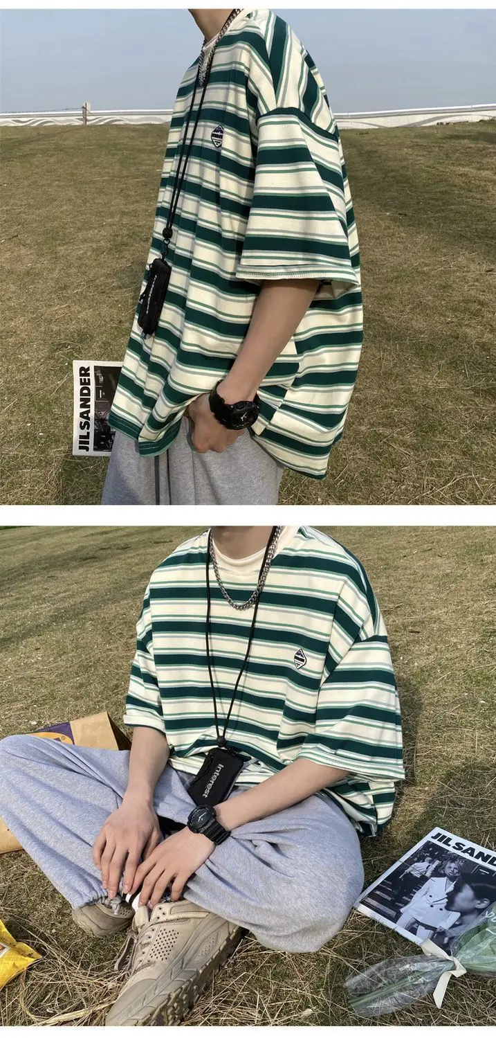 WIAOFELLAS  -  Japanese Striped Spliced Short-sleeved Shirt Summer Cityboy O-Neck T-shirt Oversize Pure Cotton Green Shirt Preppy Streetwear