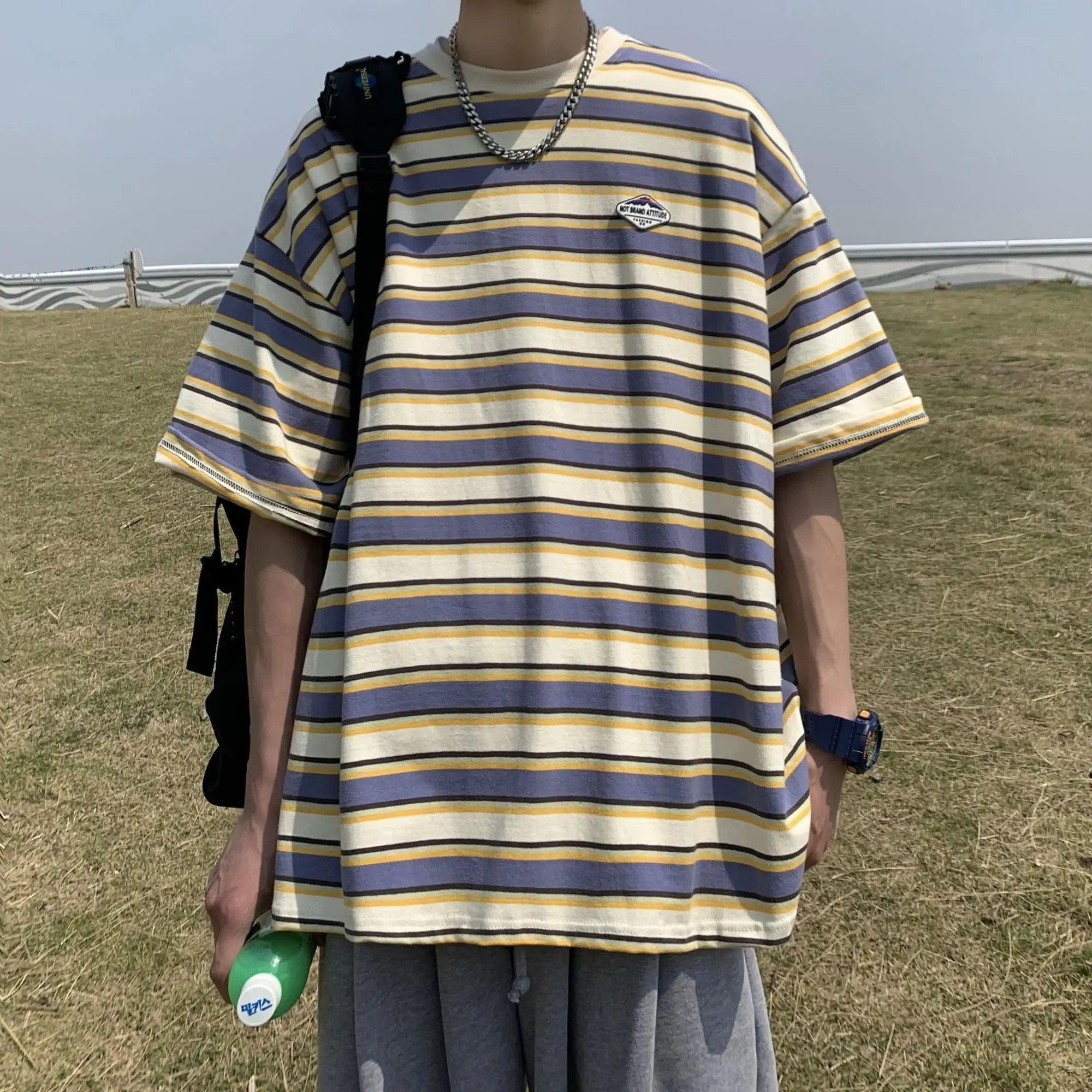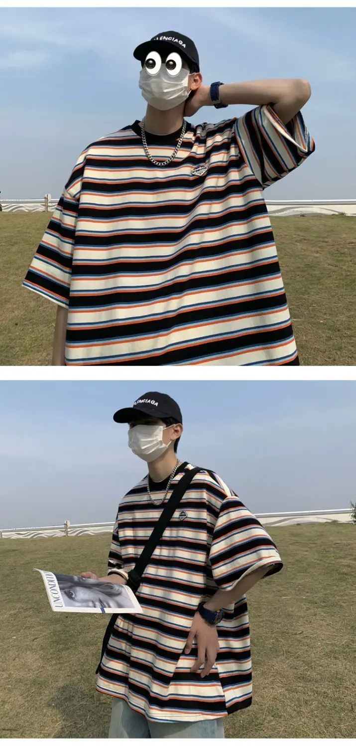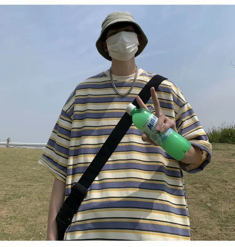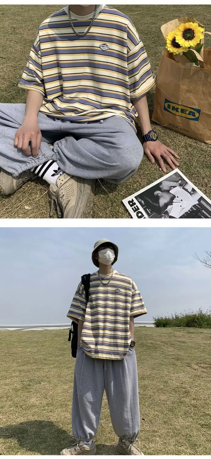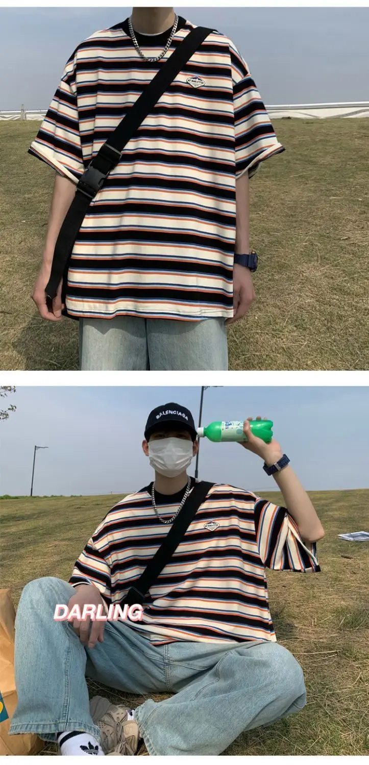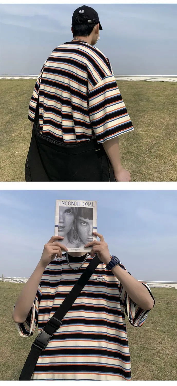 WIAOFELLAS  -  Japanese Striped Spliced Short-sleeved Shirt Summer Cityboy O-Neck T-shirt Oversize Pure Cotton Green Shirt Preppy Streetwear