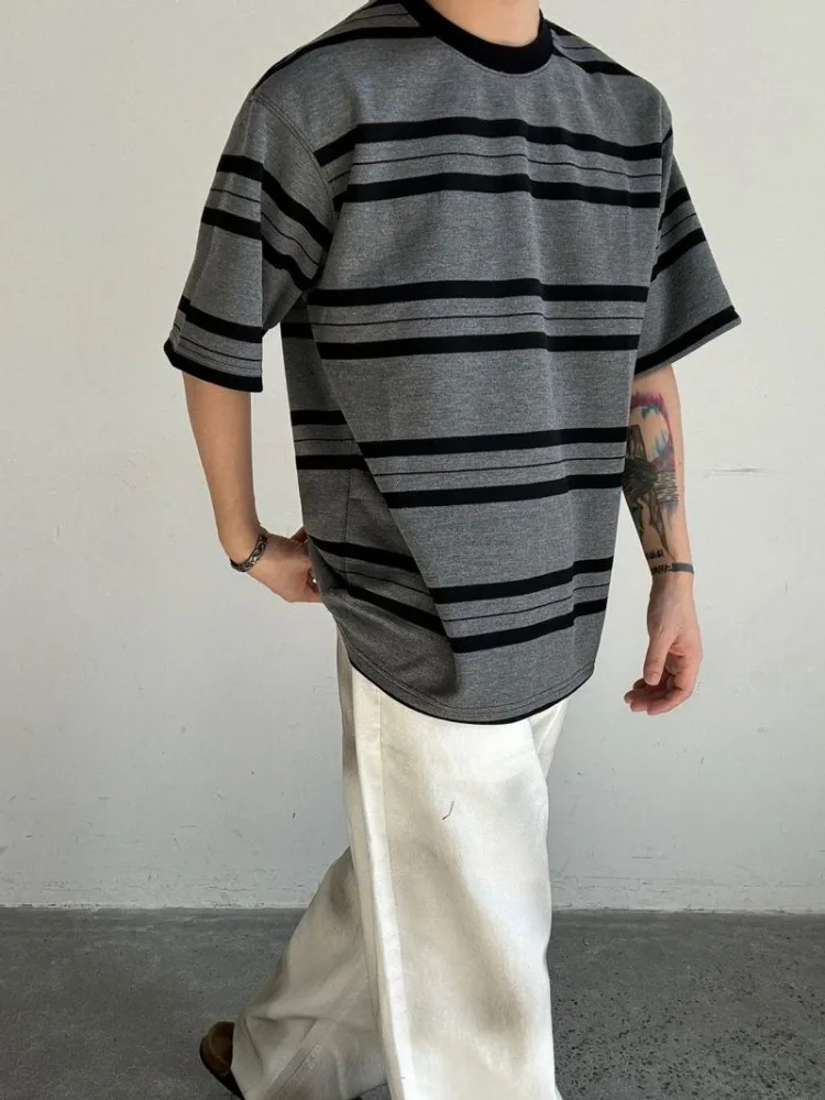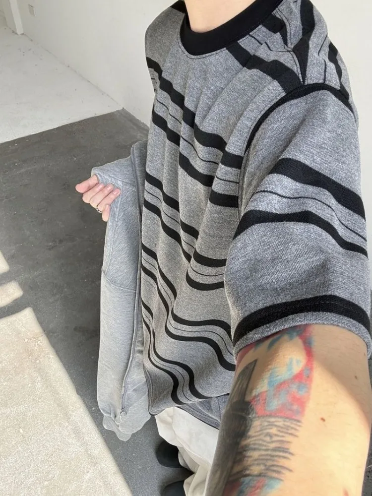 WIAOFELLAS - Korean Boyfriend Summer New Patchwork T Shirts Printing Stripes Fashion Loose Minimalist Casual Short Sleeved Tops Men Clothing