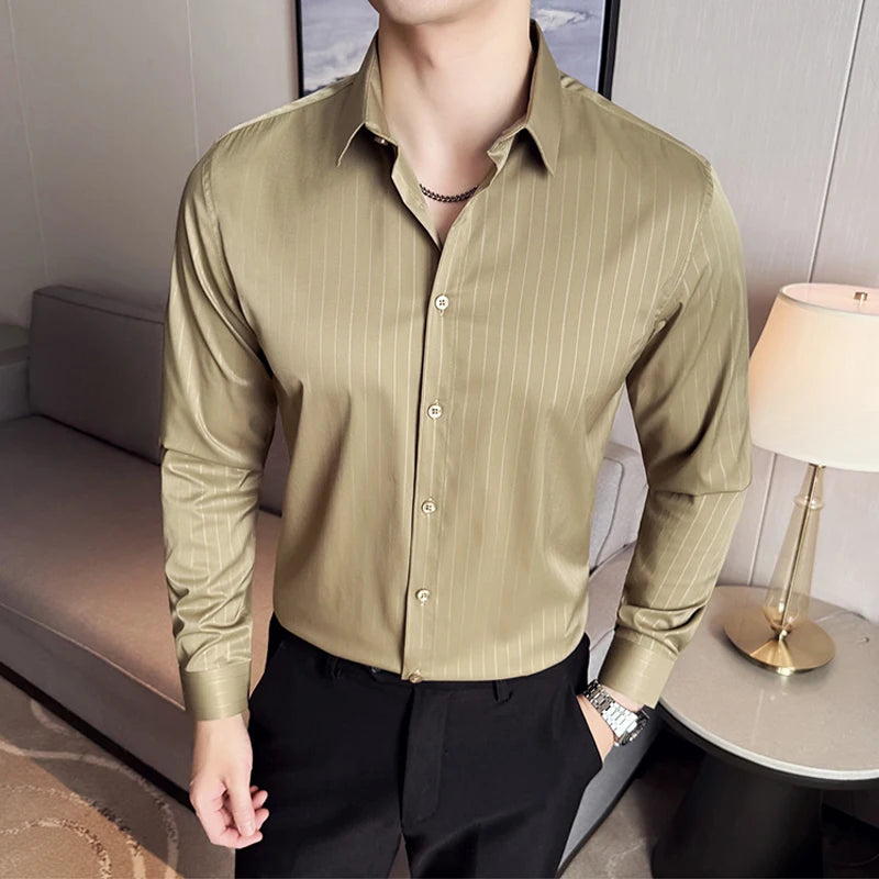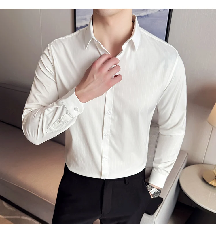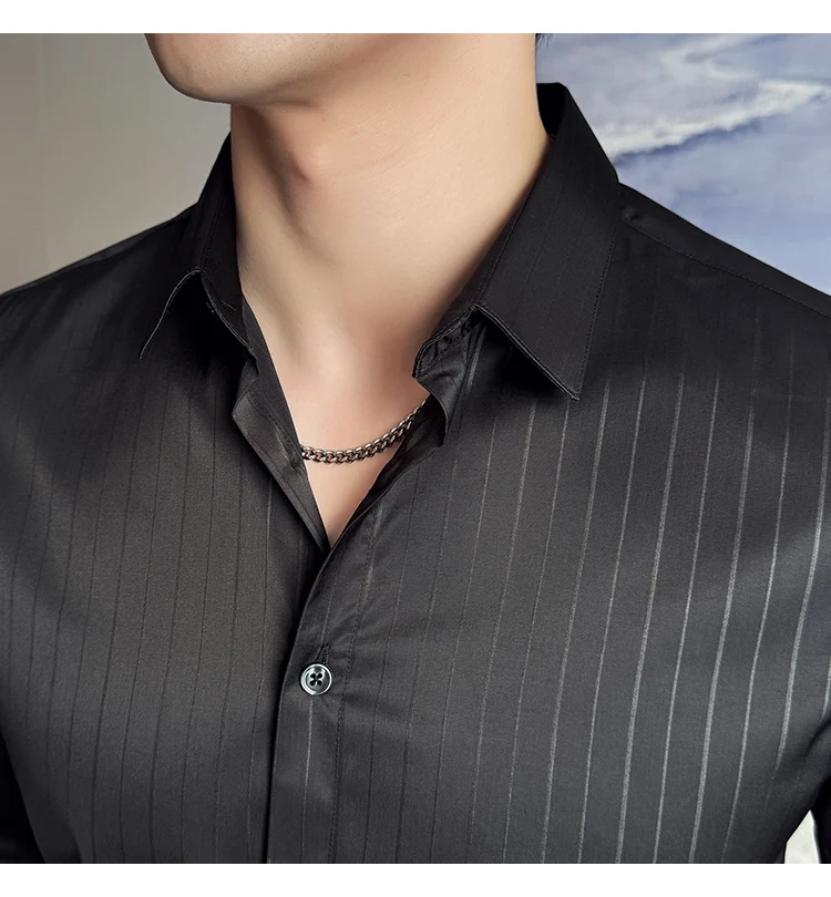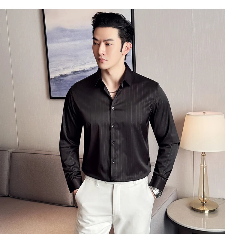 WIAOFELLAS - Long-sleeved Striped Silk Shirts for Men High End British Style Slim Fit Men's Dress Shirt Lapel Business Formal Mens Clothing