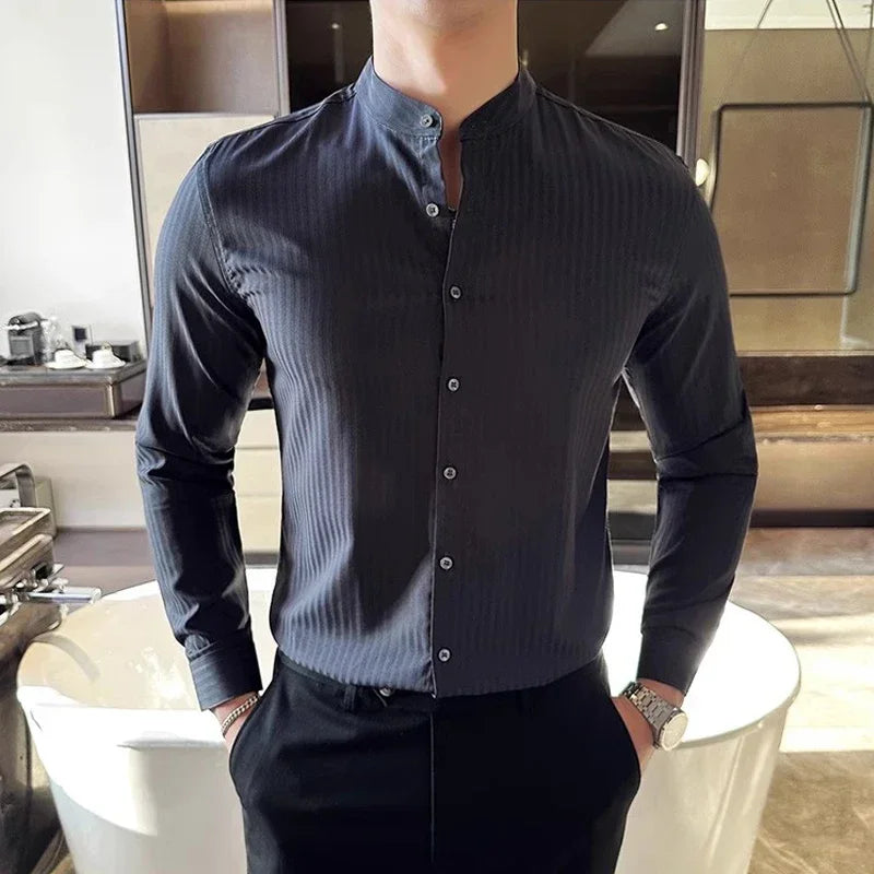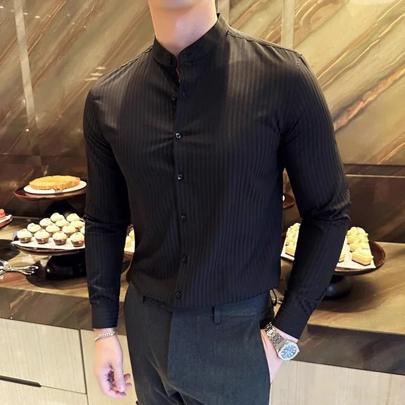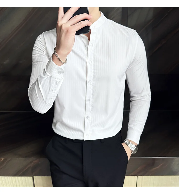 WIAOFELLAS - Luxury Long Sleeved Striped Men's Dress Shirt Stylish Business Stand Collar Slim Men Shirts Party Social Formal Mens Clothing