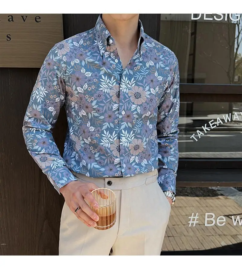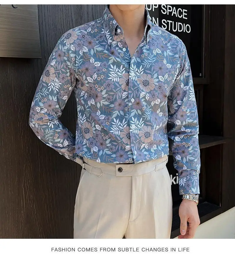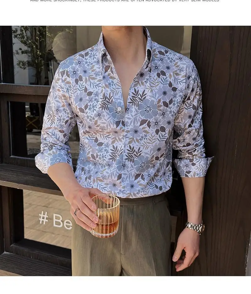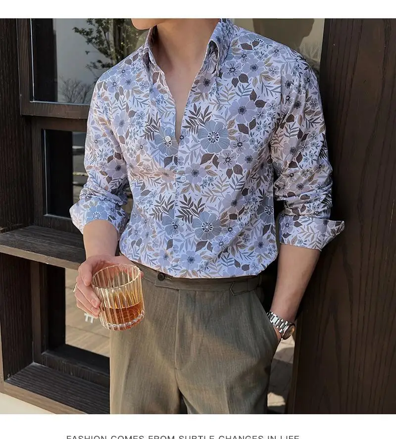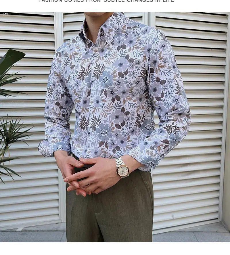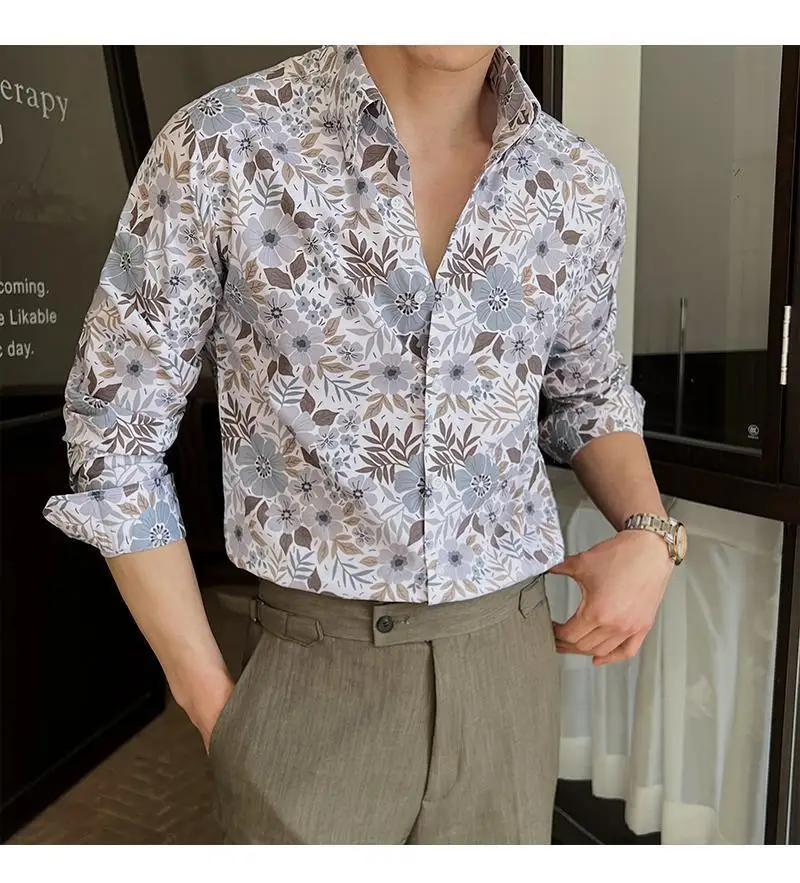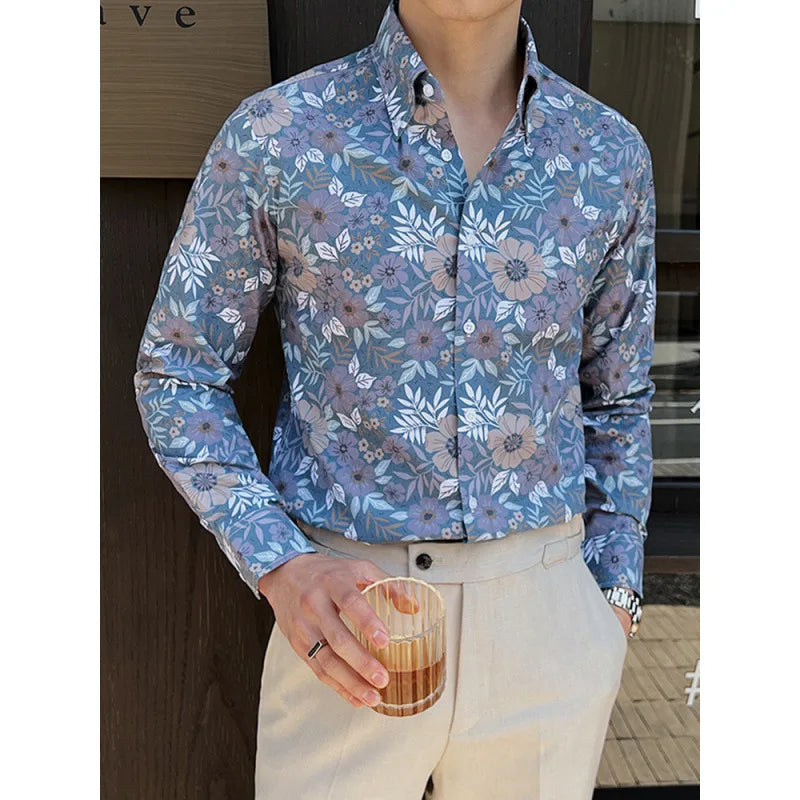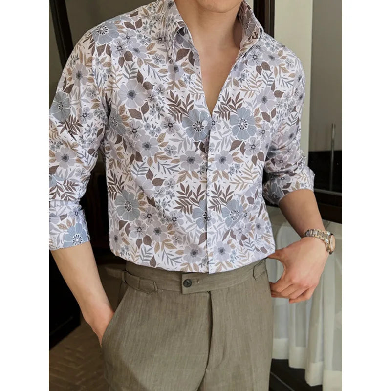 WIAOFELLAS - Men Clothing British Style Floral Shirt for Men Long Sleeve Slim Fit Casual Business Dress Shirts Hawaiian Vacation Beach Shirt