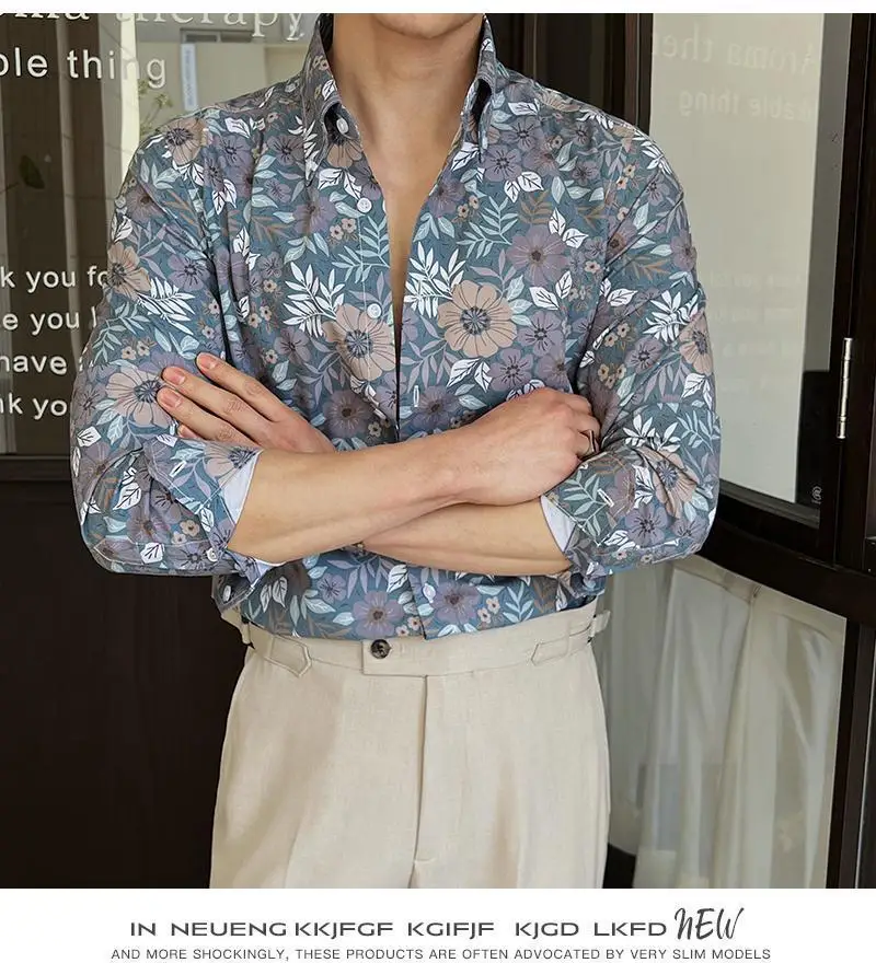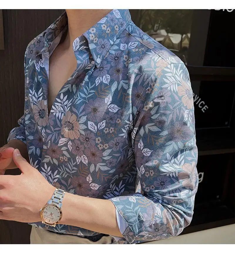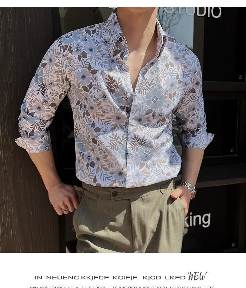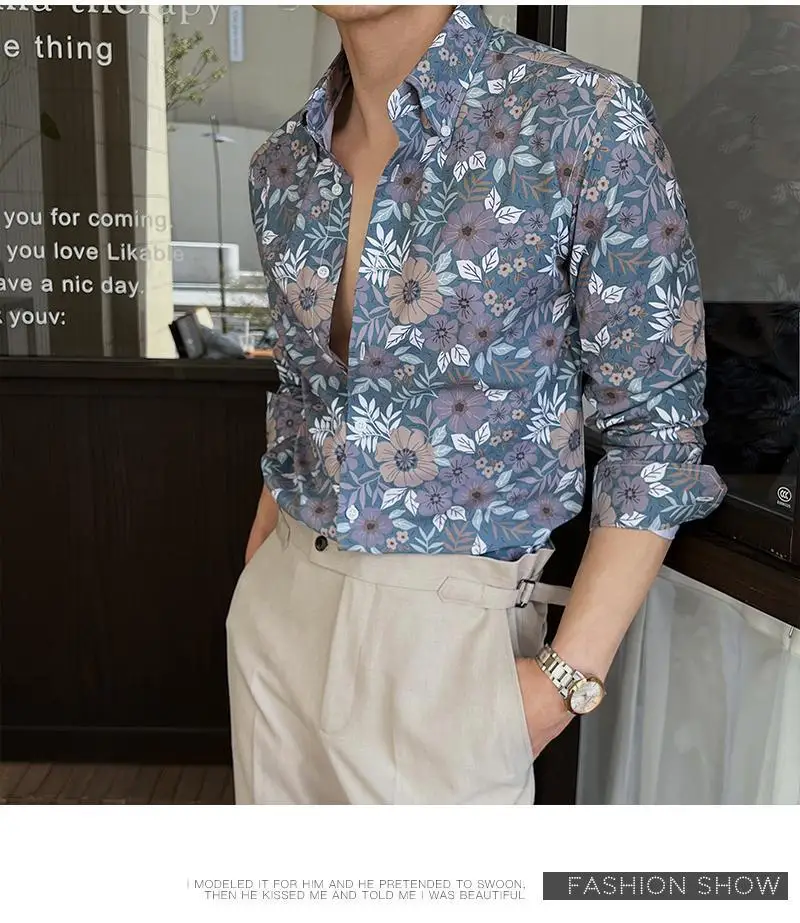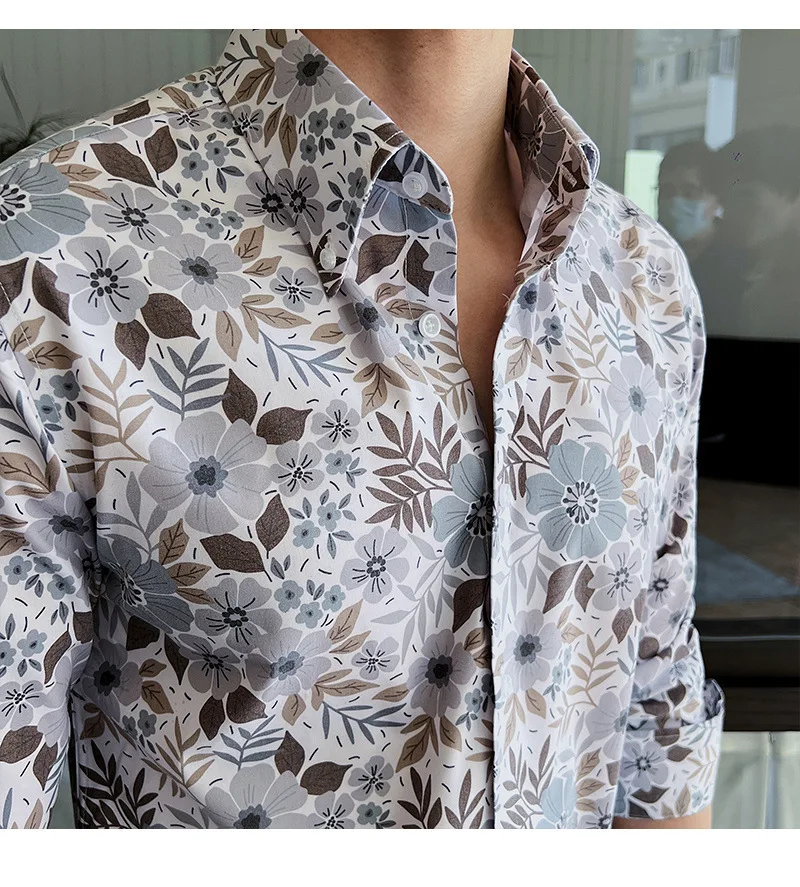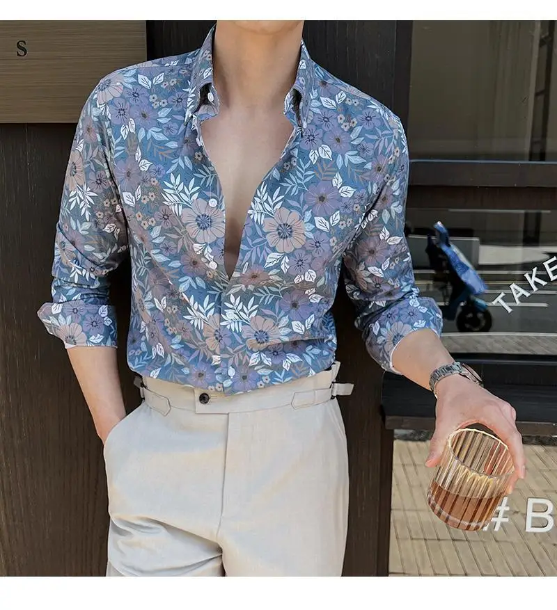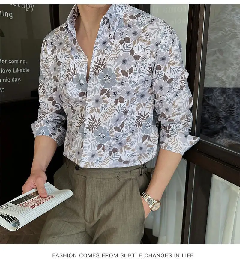 WIAOFELLAS - Men Clothing British Style Floral Shirt for Men Long Sleeve Slim Fit Casual Business Dress Shirts Hawaiian Vacation Beach Shirt