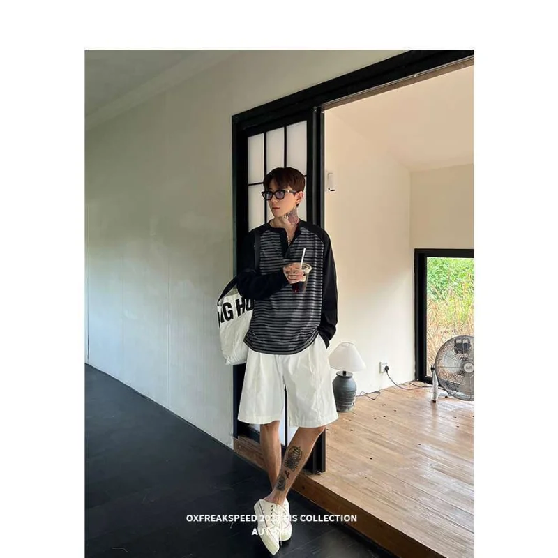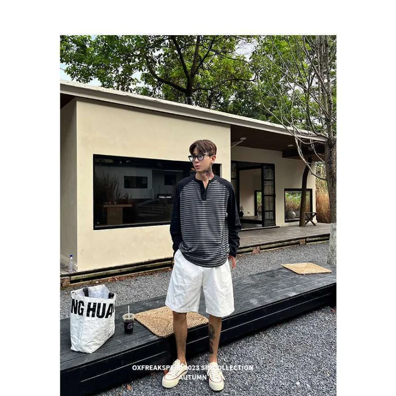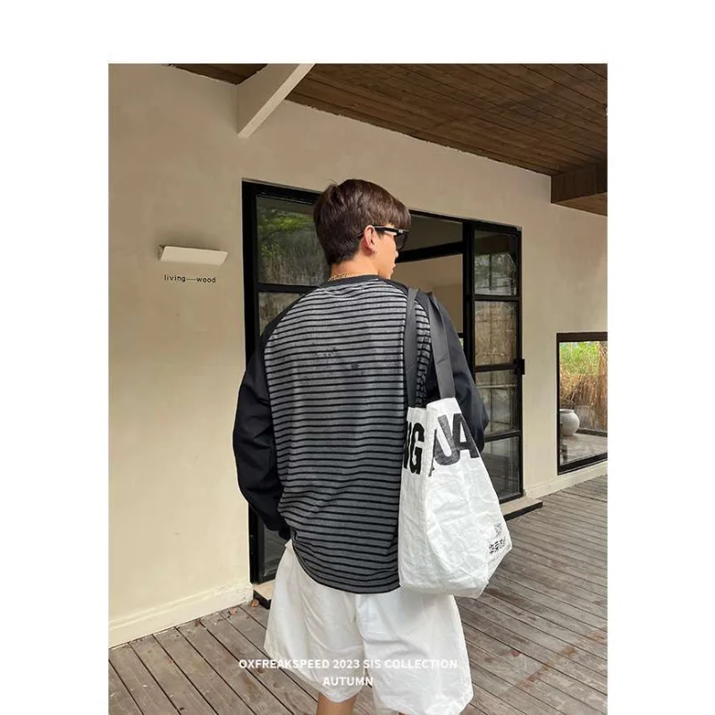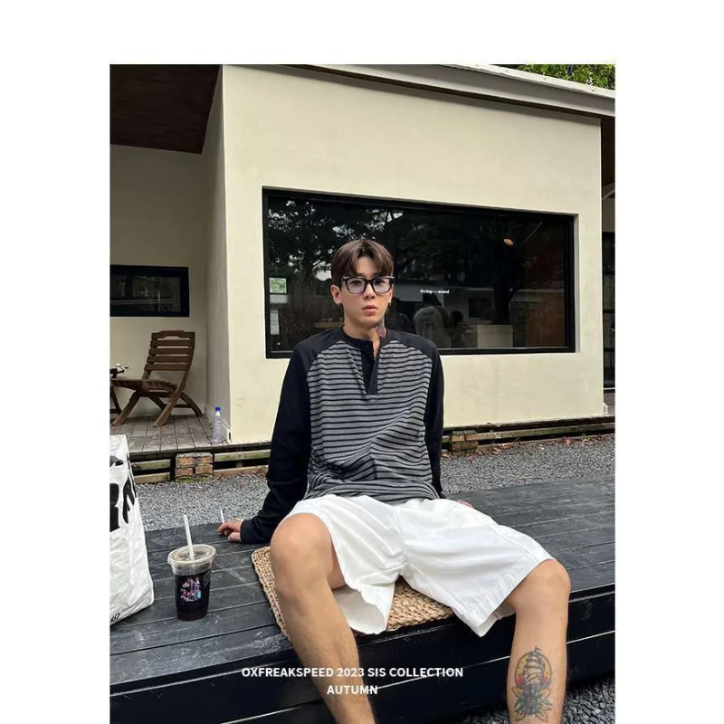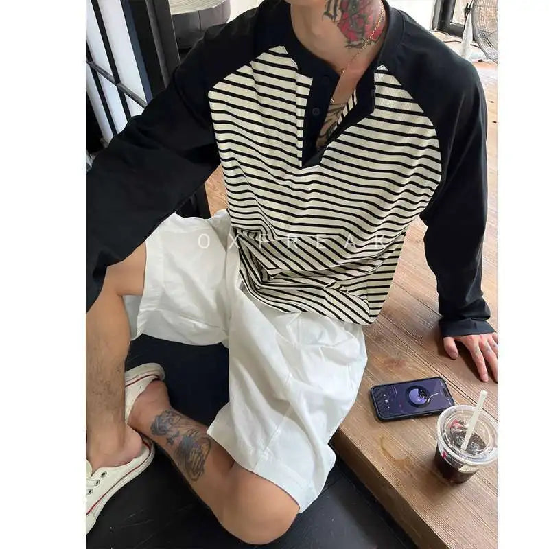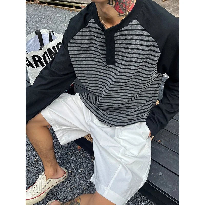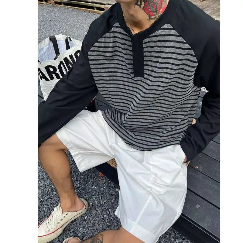 WIAOFELLAS - Men Color Block Raglan Sleeve Striped Long Sleeve T-Shirt Loose Fit Casual Top