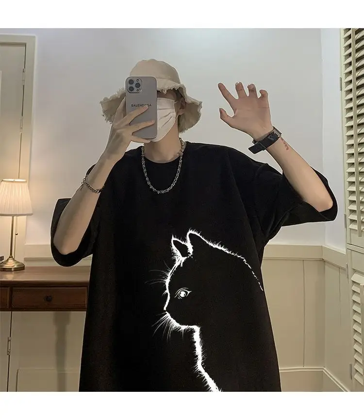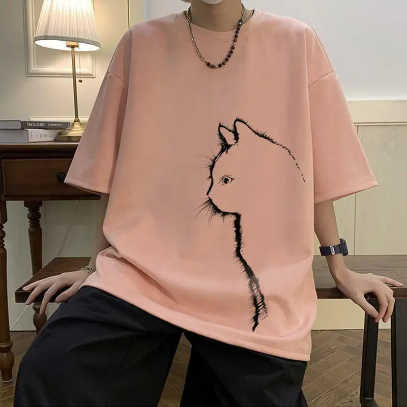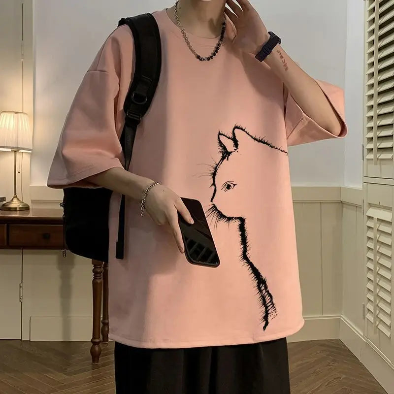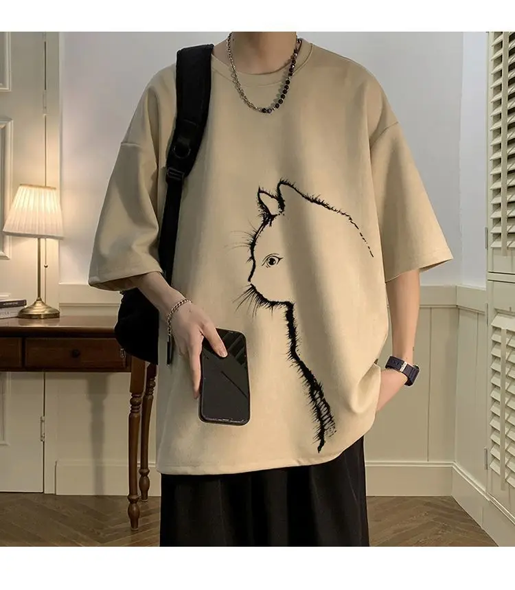 WIAOFELLAS - Men Short Sleeved T-shirt Suede Velvet Summer Cartoon Print Tops Loose Fitting Quarter Sleeves Leisure Time Cat Printing Hatless