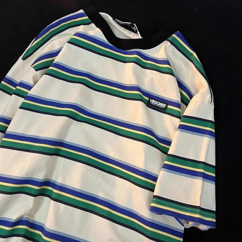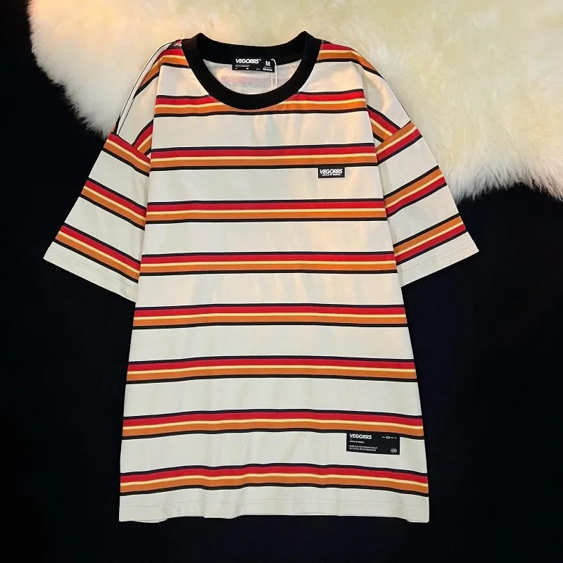 WIAOFELLAS - Men T Shirts Street Retro Striped Short-sleeved T-shirt Women Cotton Summer Loose Ovesize Round Neck Daily Tops Tees