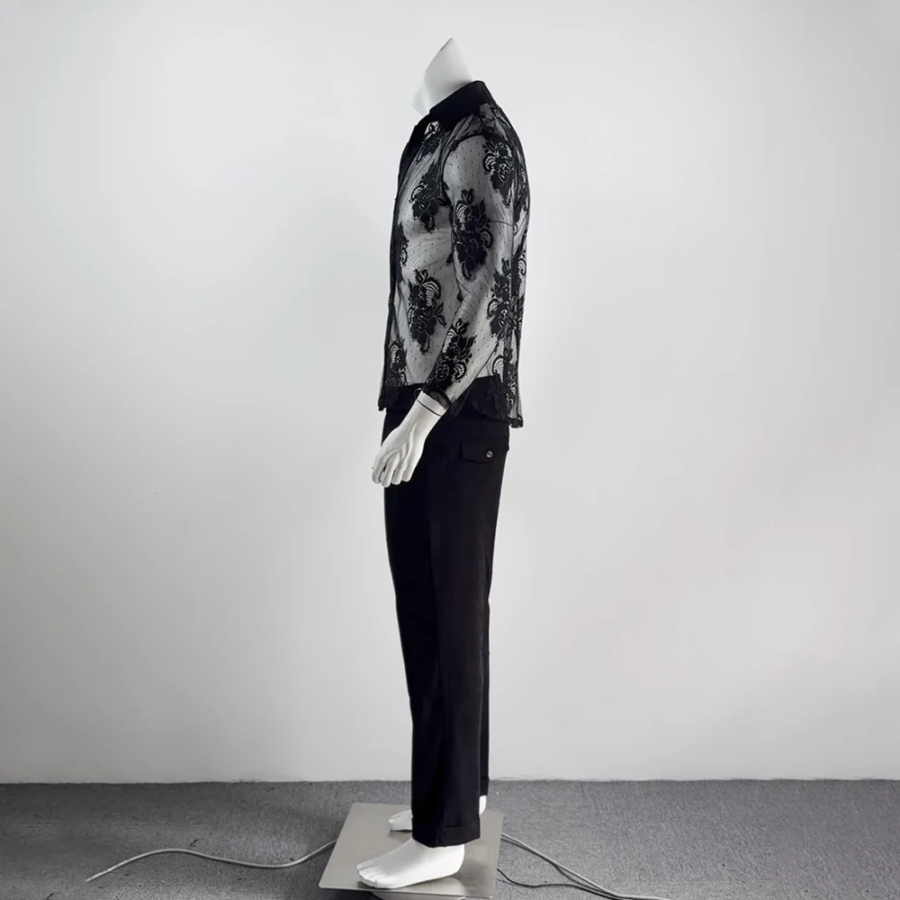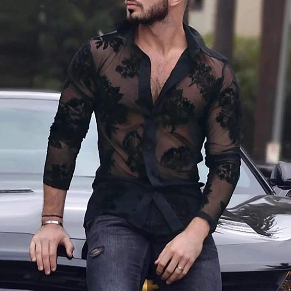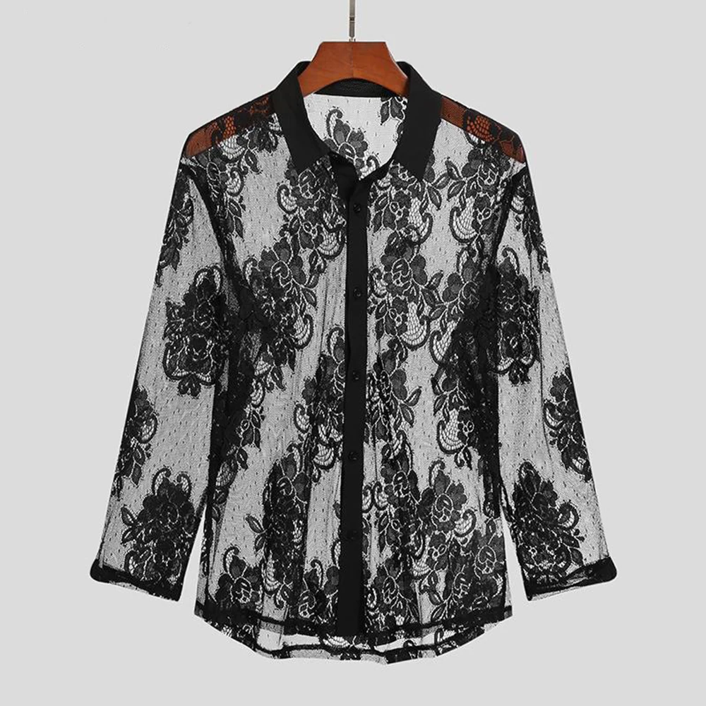 WIAOFELLAS - Mens Breathable Lace Casual Long-Sleeved Mesh Shirt Autumn New Transparent Fashion Trend Stage Party Sexy Mesh Shirt Mens Wear