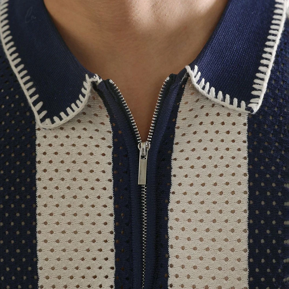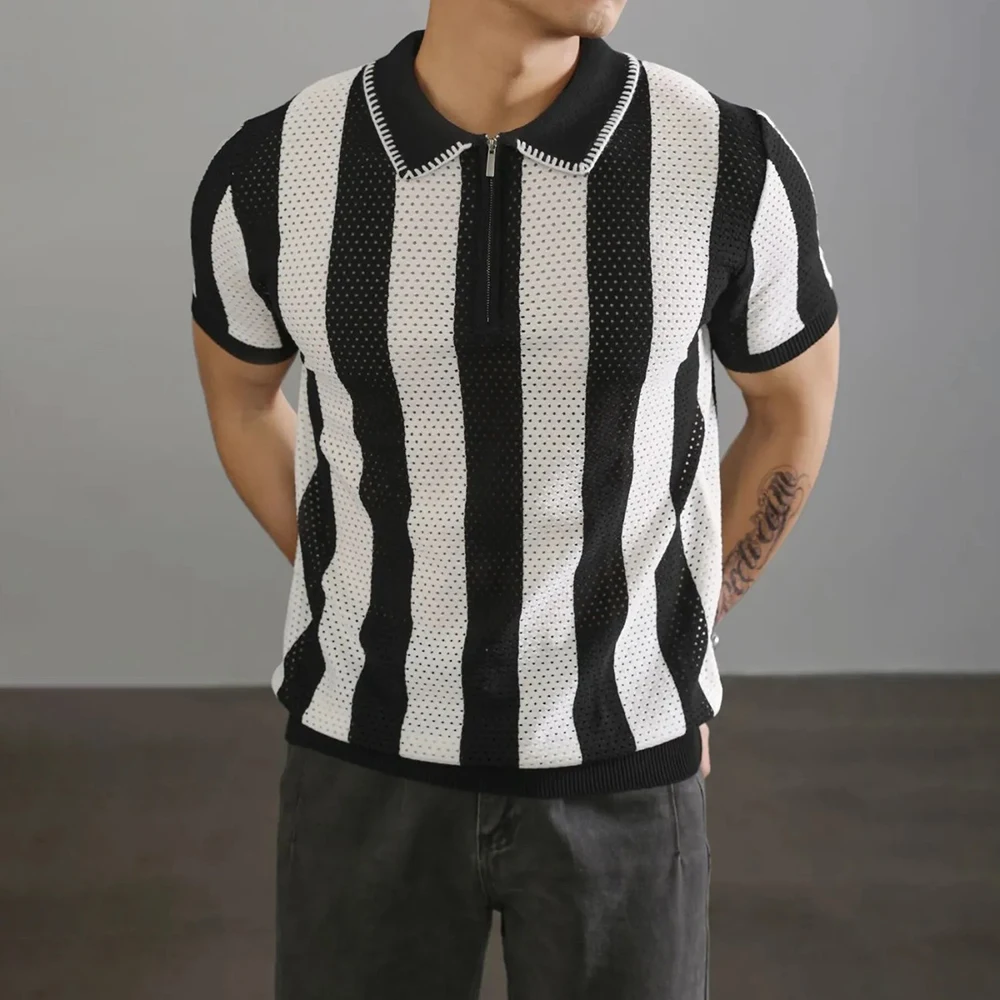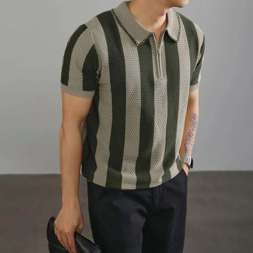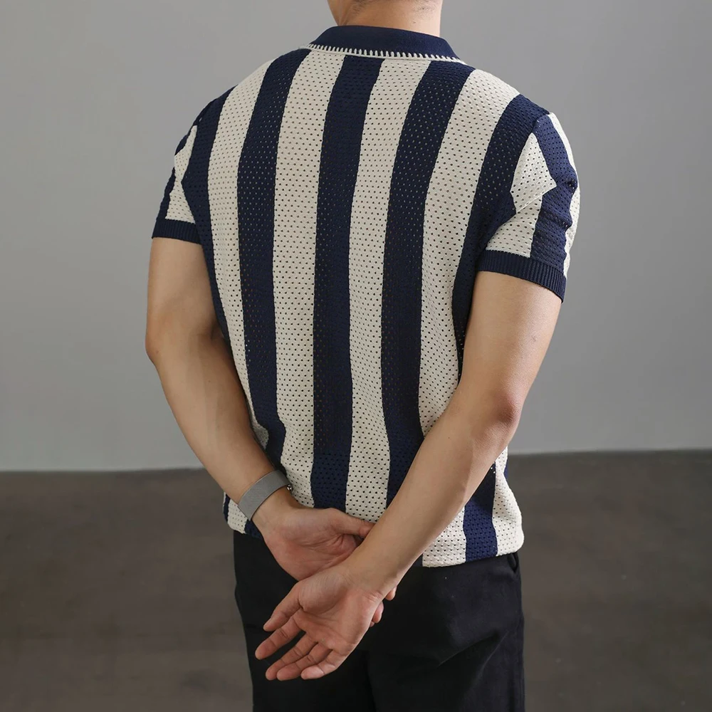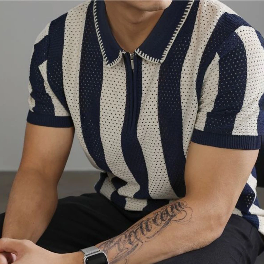 WIAOFELLAS - Men's Half-Zip Striped Knitted Short-Sleeved Polo Shirt American Retro Fashion Trend Casual Simple Loose Breathable Men's Tops