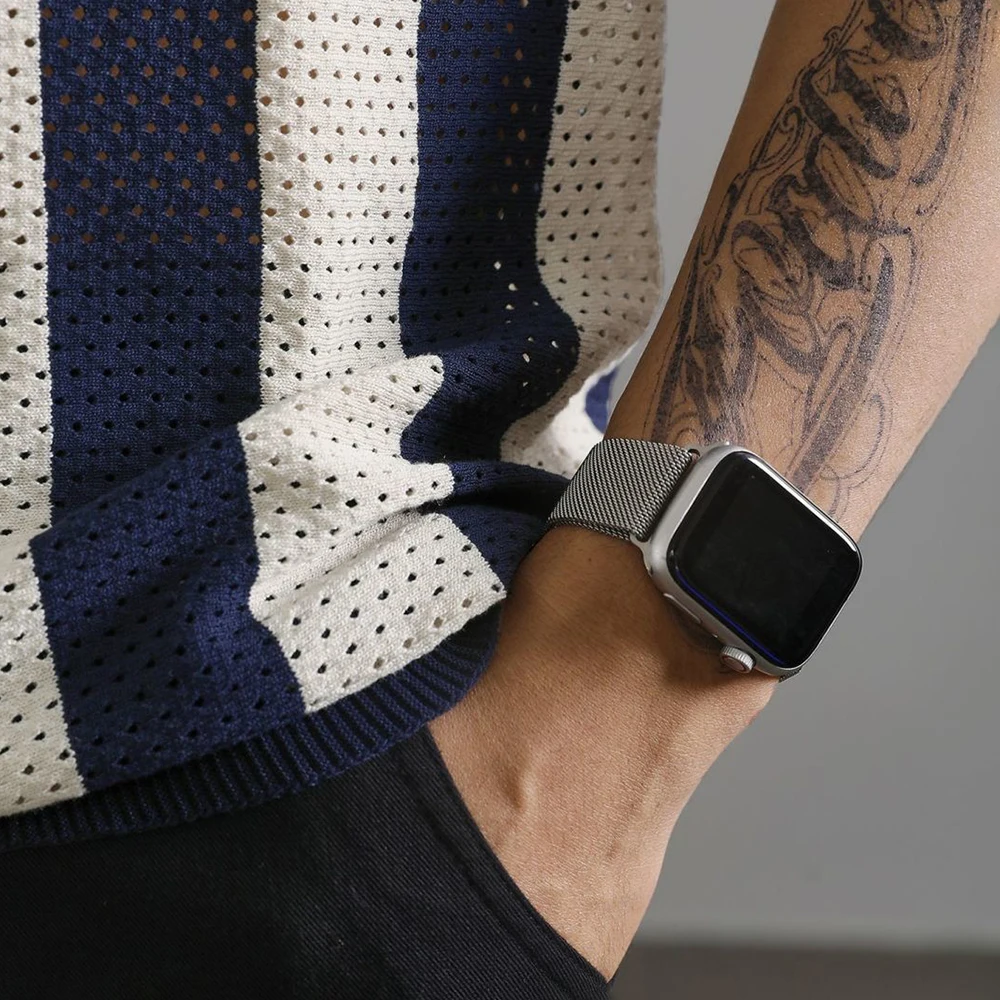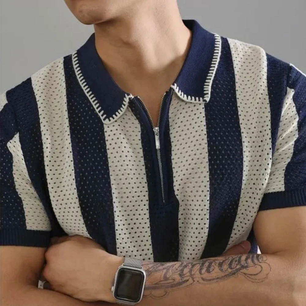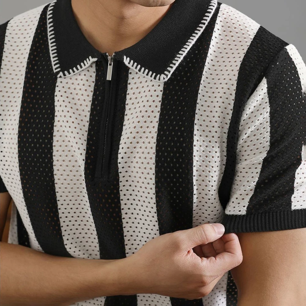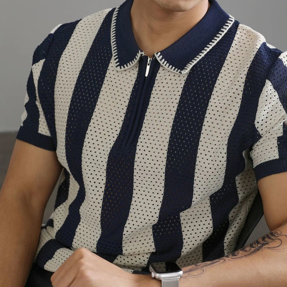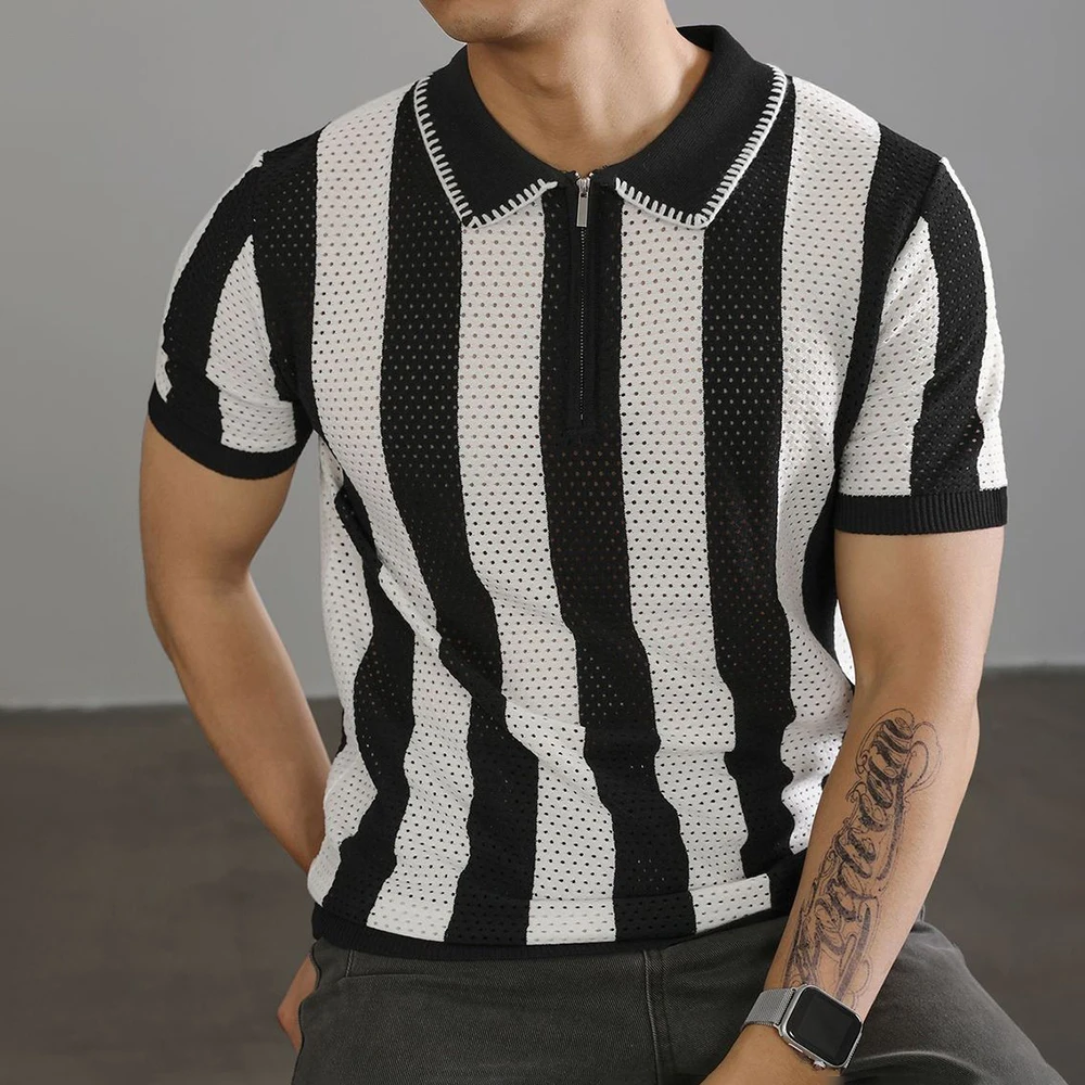 WIAOFELLAS - Men's Half-Zip Striped Knitted Short-Sleeved Polo Shirt American Retro Fashion Trend Casual Simple Loose Breathable Men's Tops