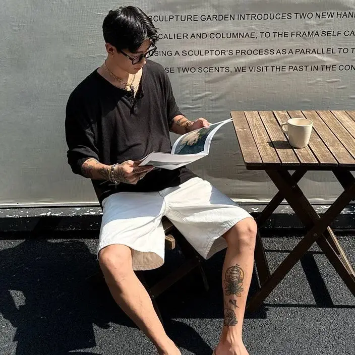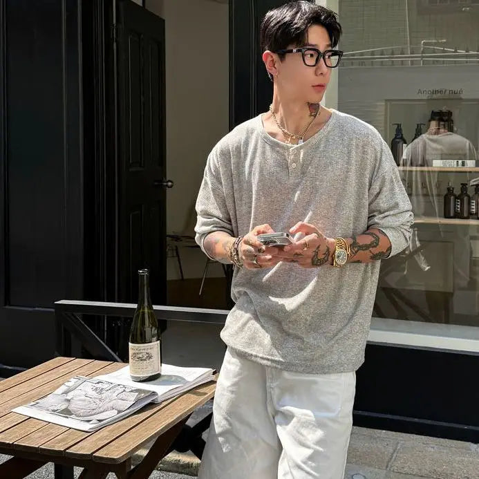 WIAOFELLAS - Men's Husband Sex Old Qian Style Pink Henry Collar Long Sleeve T-shirt Summer Thin Sunscreen Top