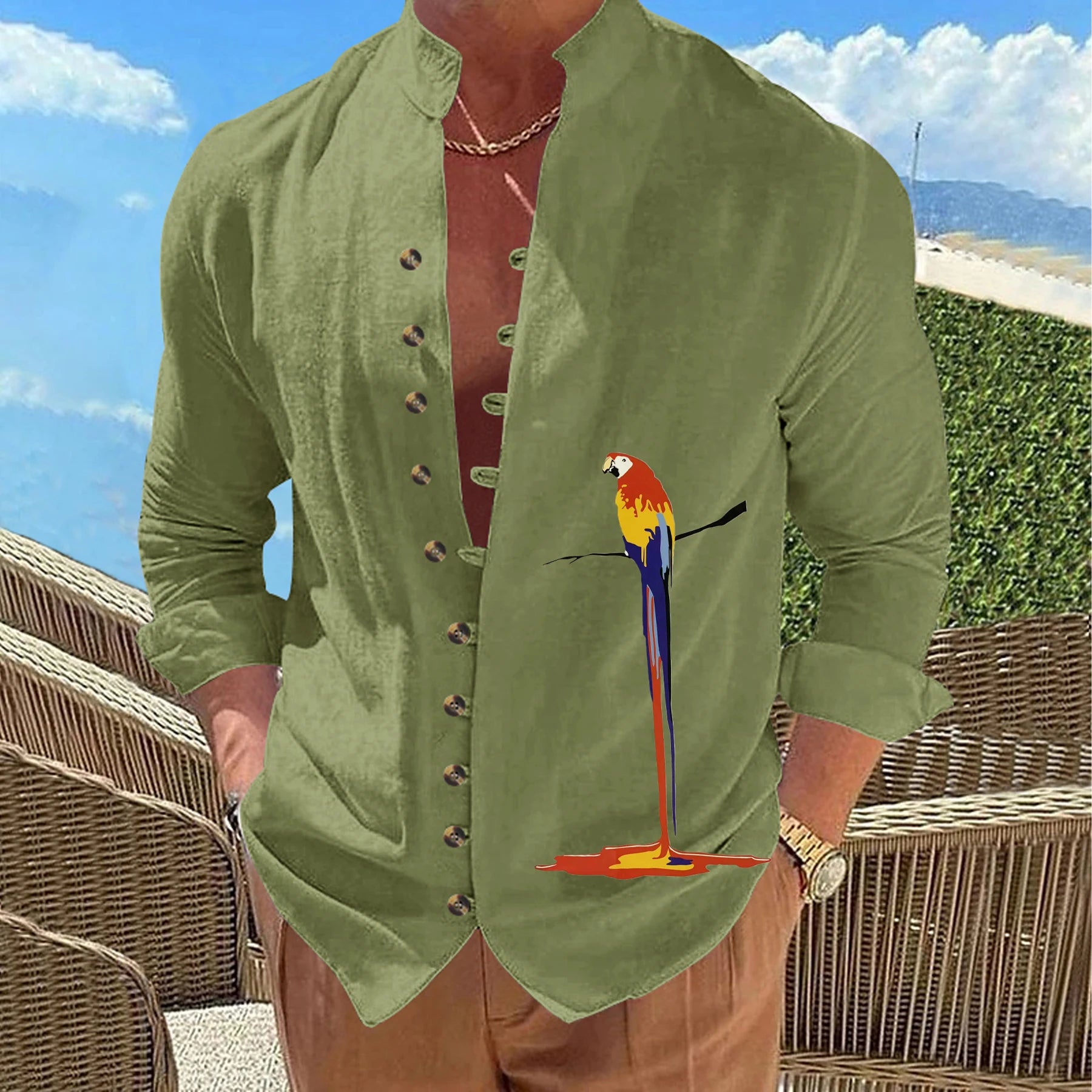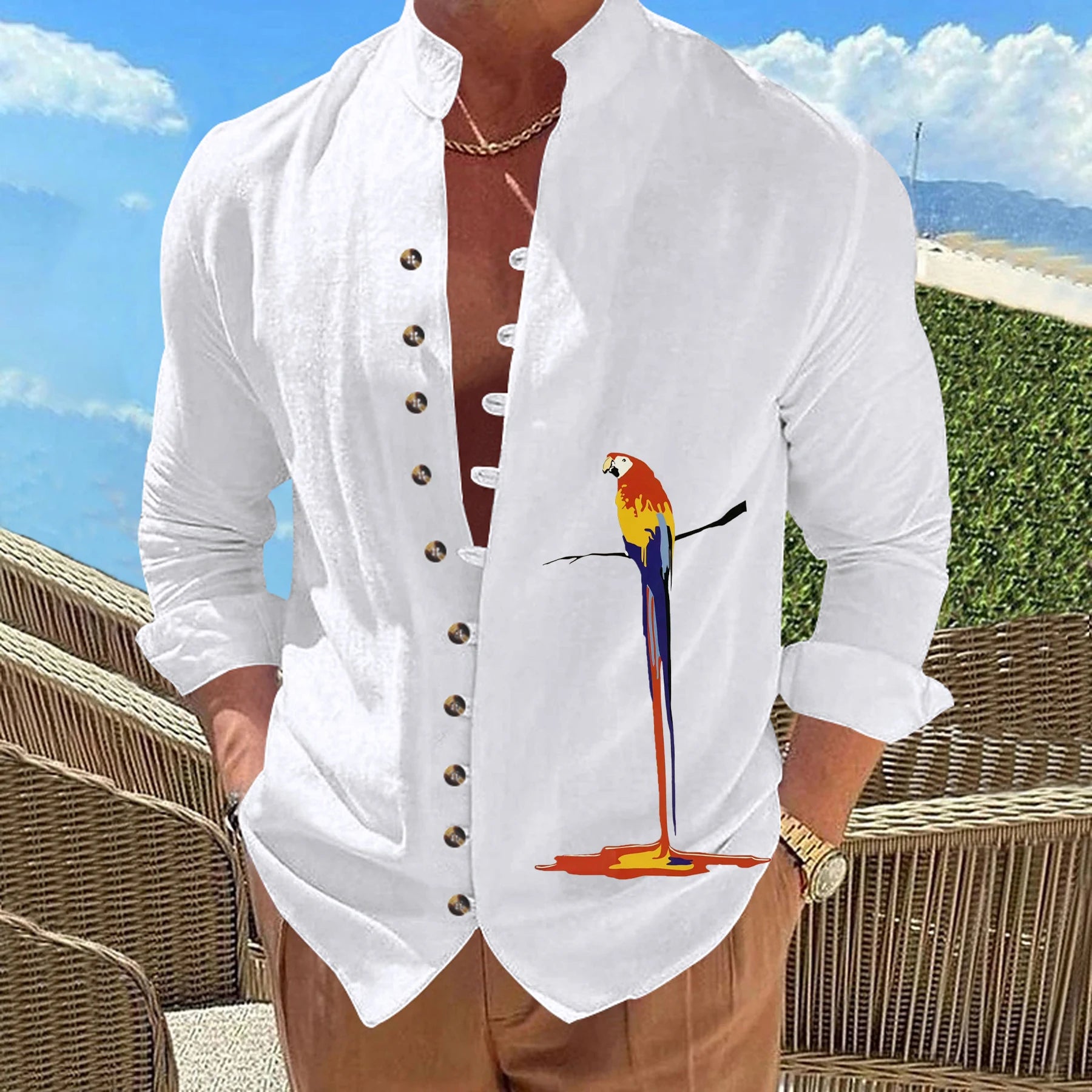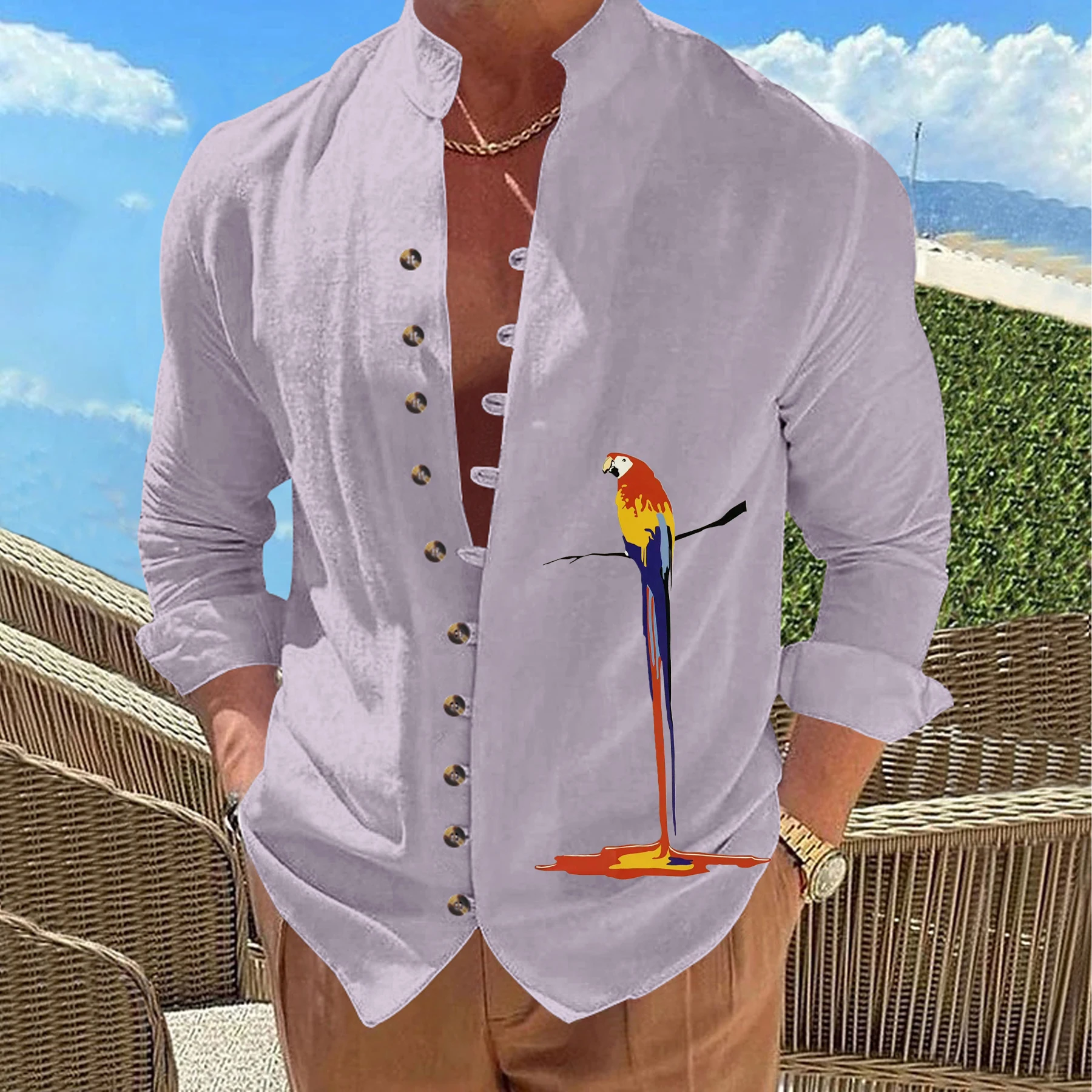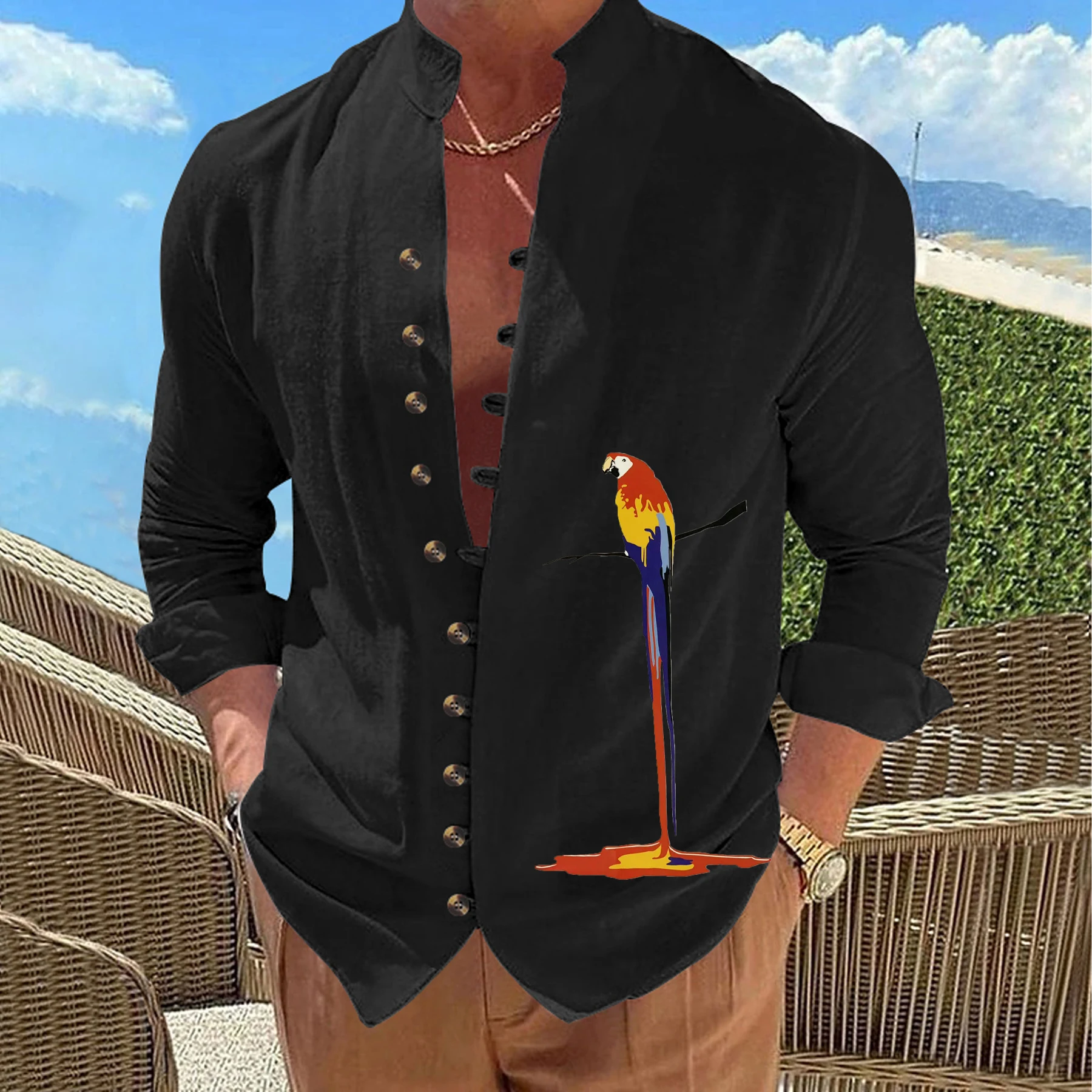 WIAOFELLAS - Men's Retro Style Long-Sleeved Shirt Stand-Up Collar Button up Parrot 3D Print Spring Autumn Fashionable Casual Shirt