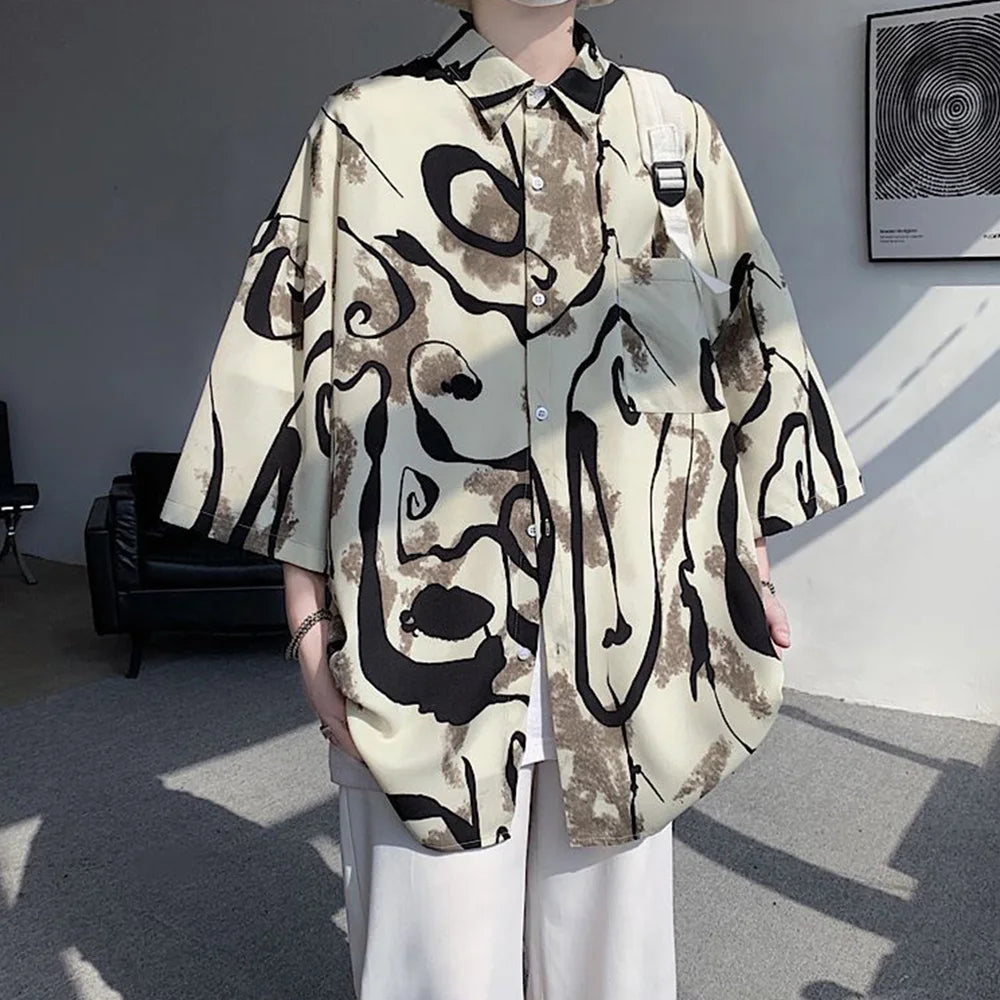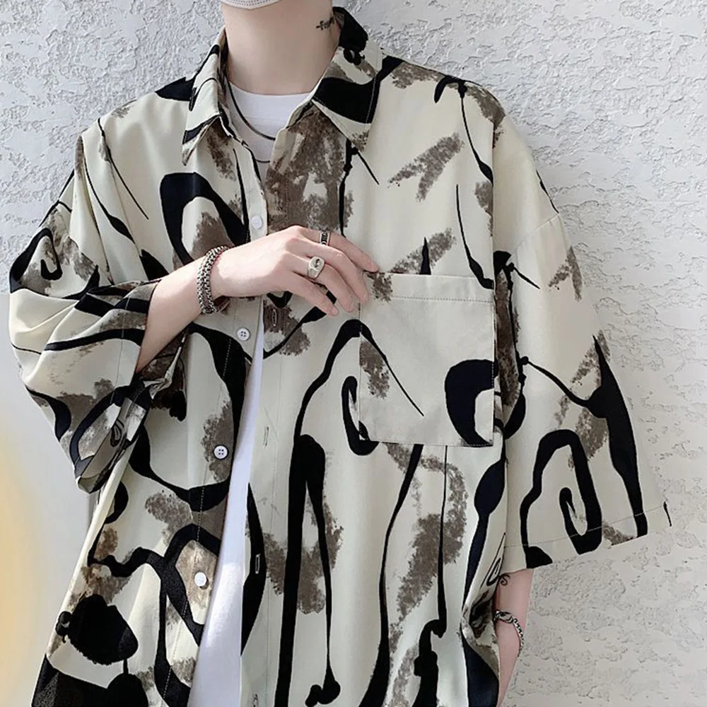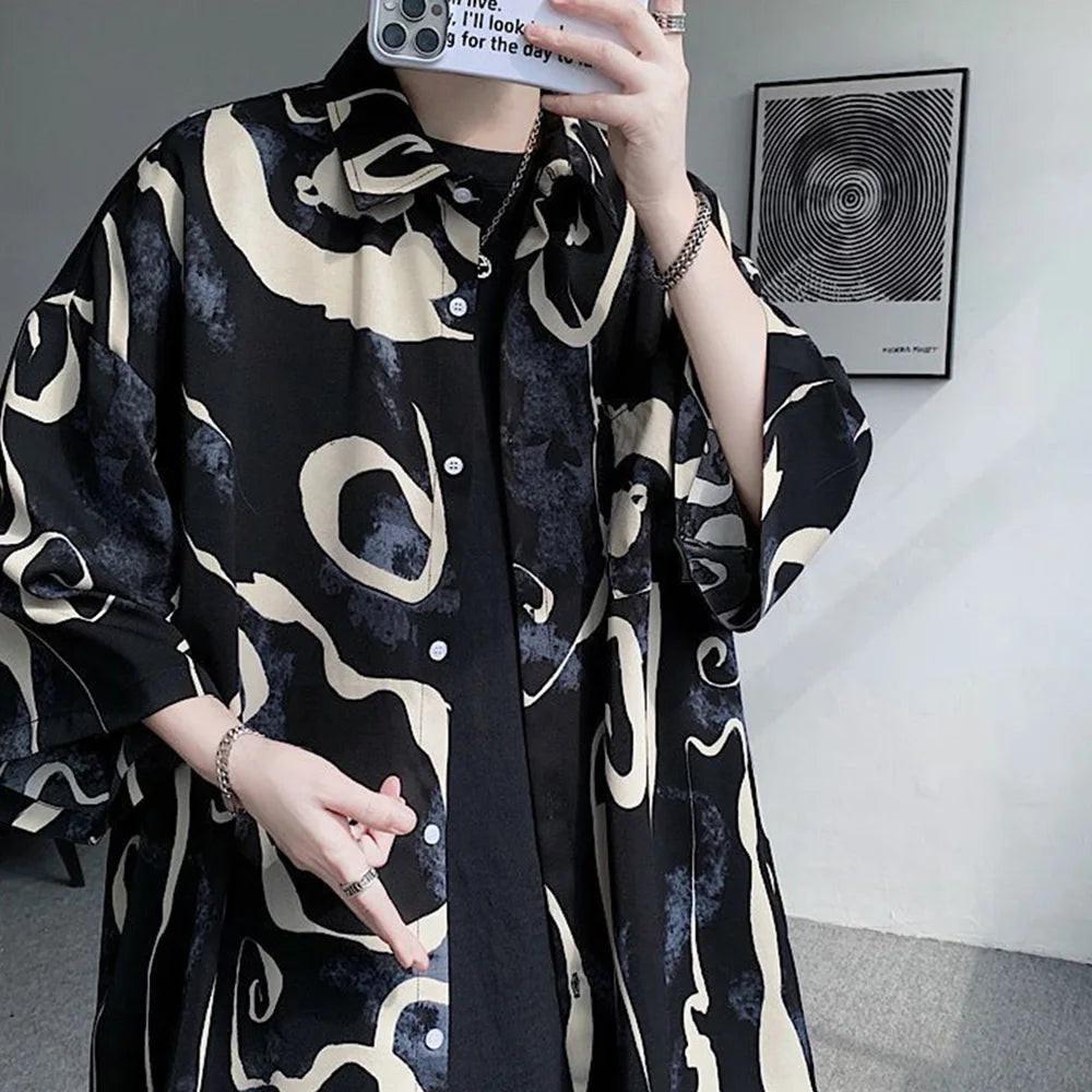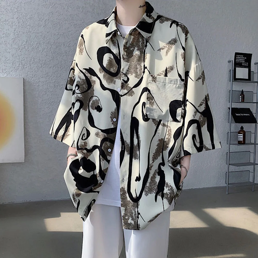 WIAOFELLAS - Mens Short Sleeve Shirts Contrast Y2K Harajuku Trendy Personality Print Short Sleeve Loose Handsome Youthful Chic Tops Summer