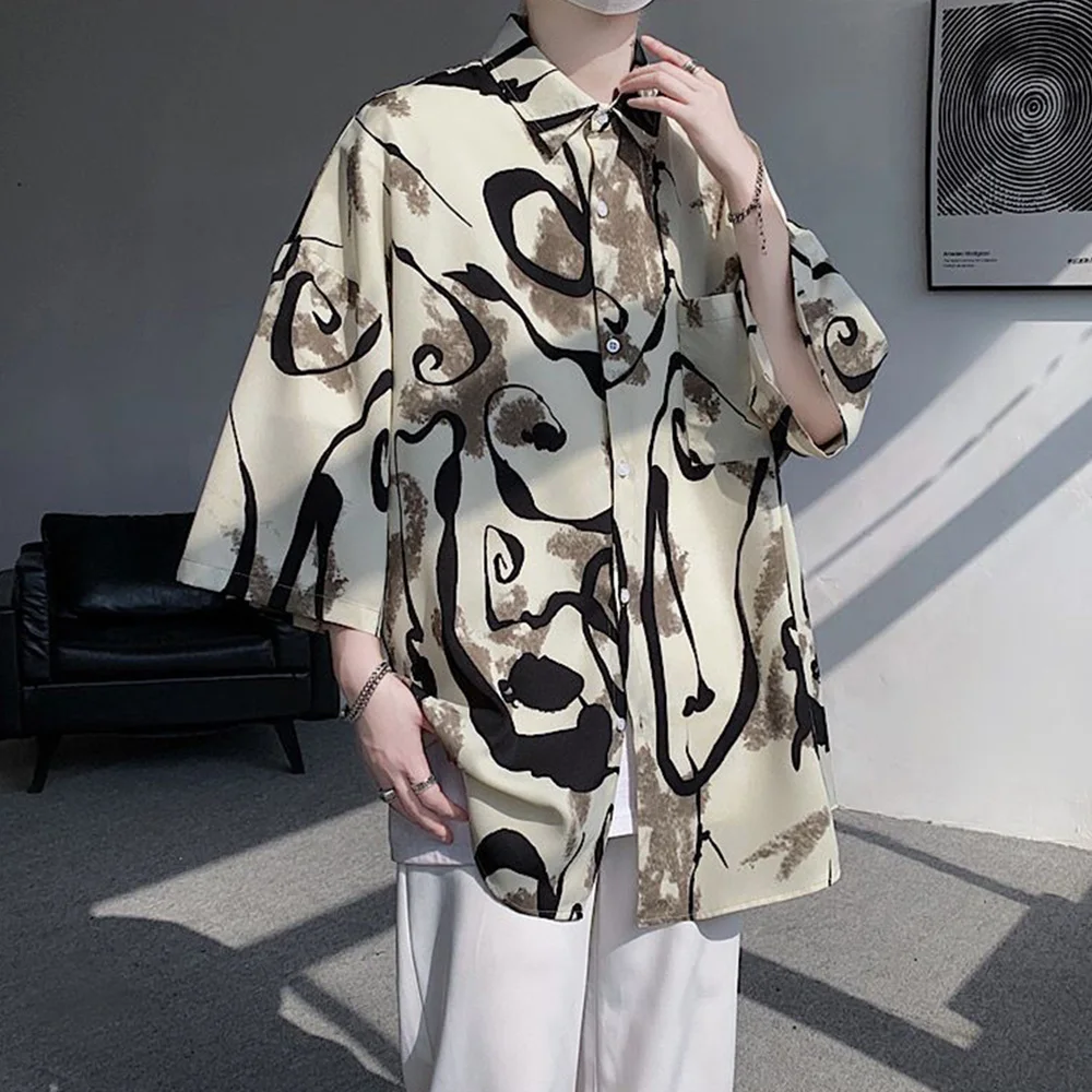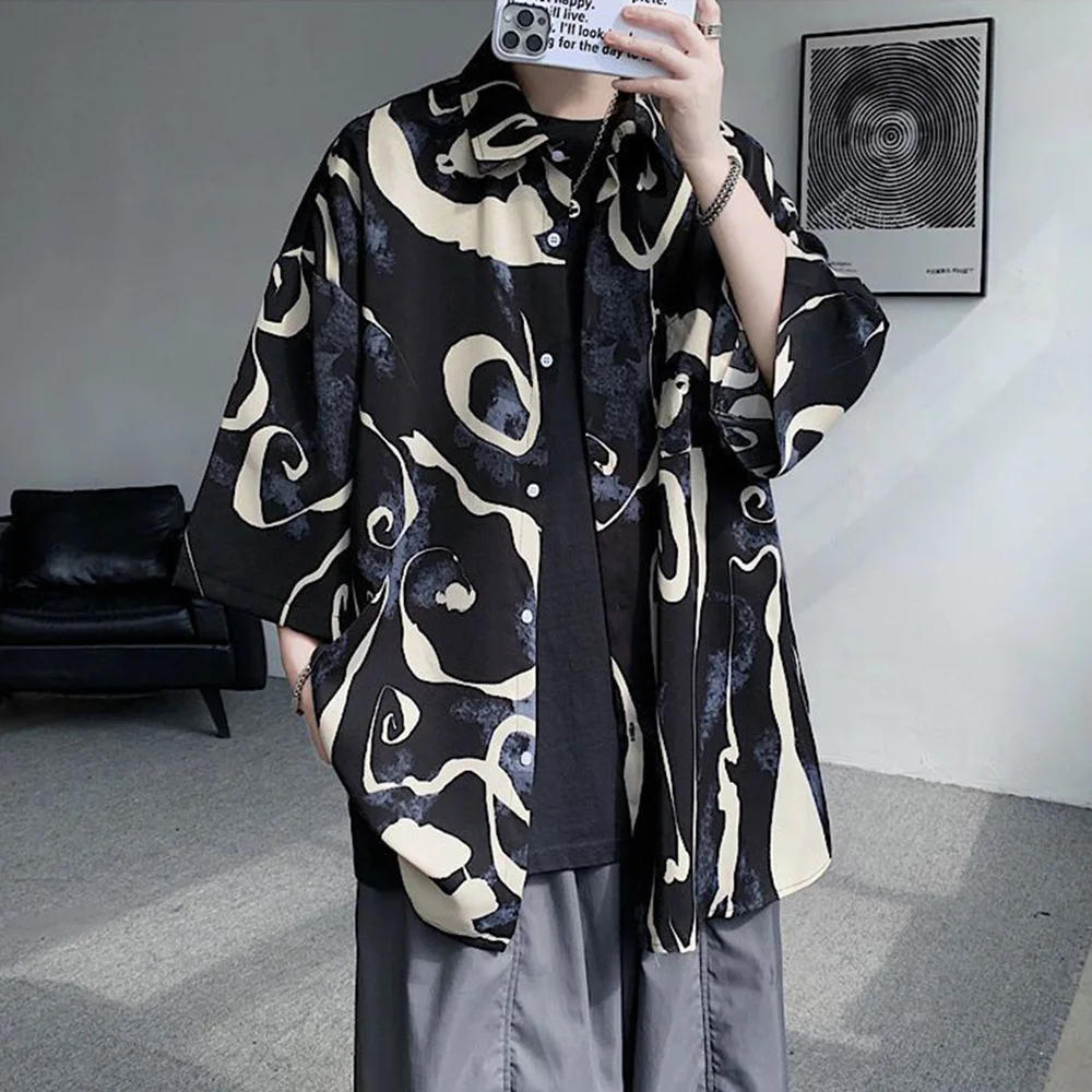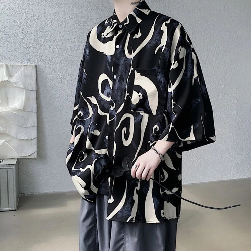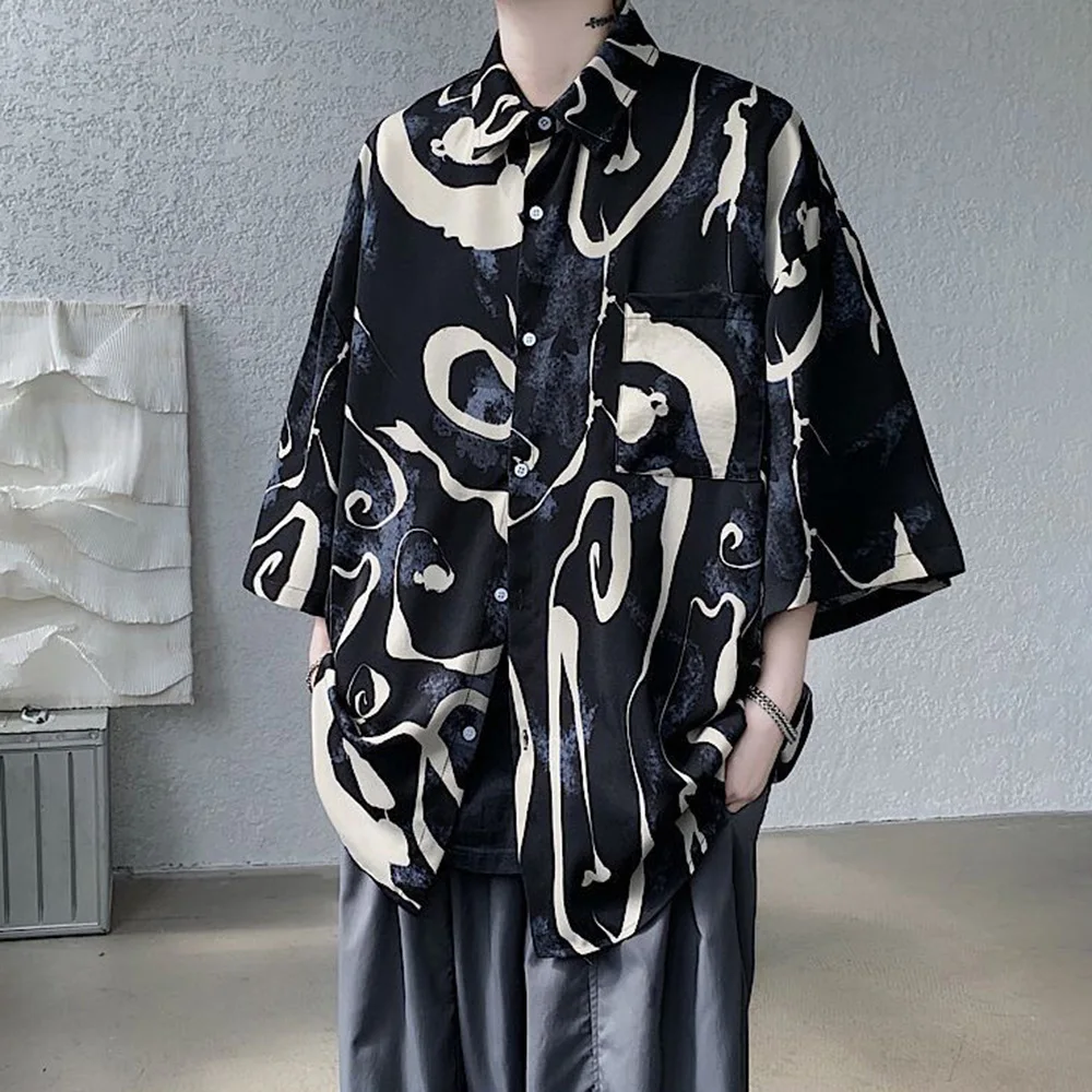WIAOFELLAS - Mens Short Sleeve Shirts Contrast Y2K Harajuku Trendy Personality Print Short Sleeve Loose Handsome Youthful Chic Tops Summer