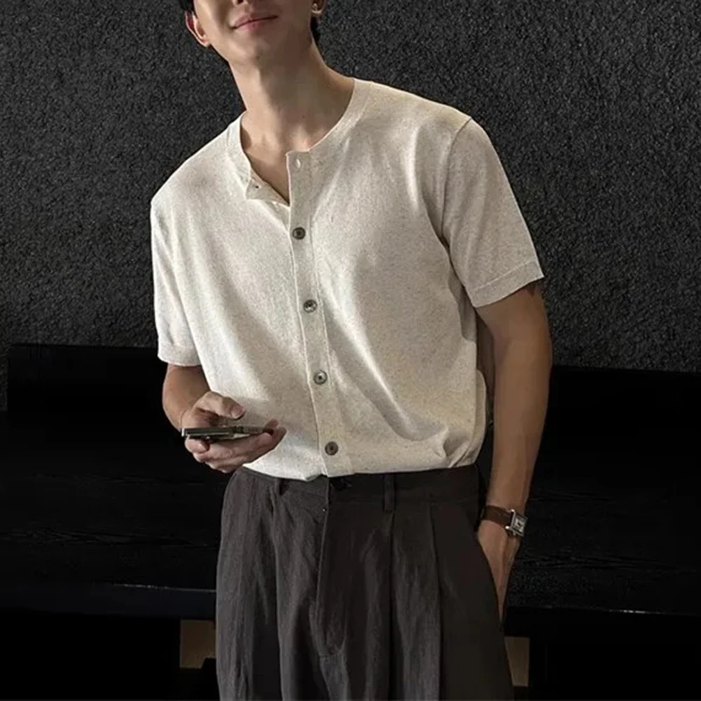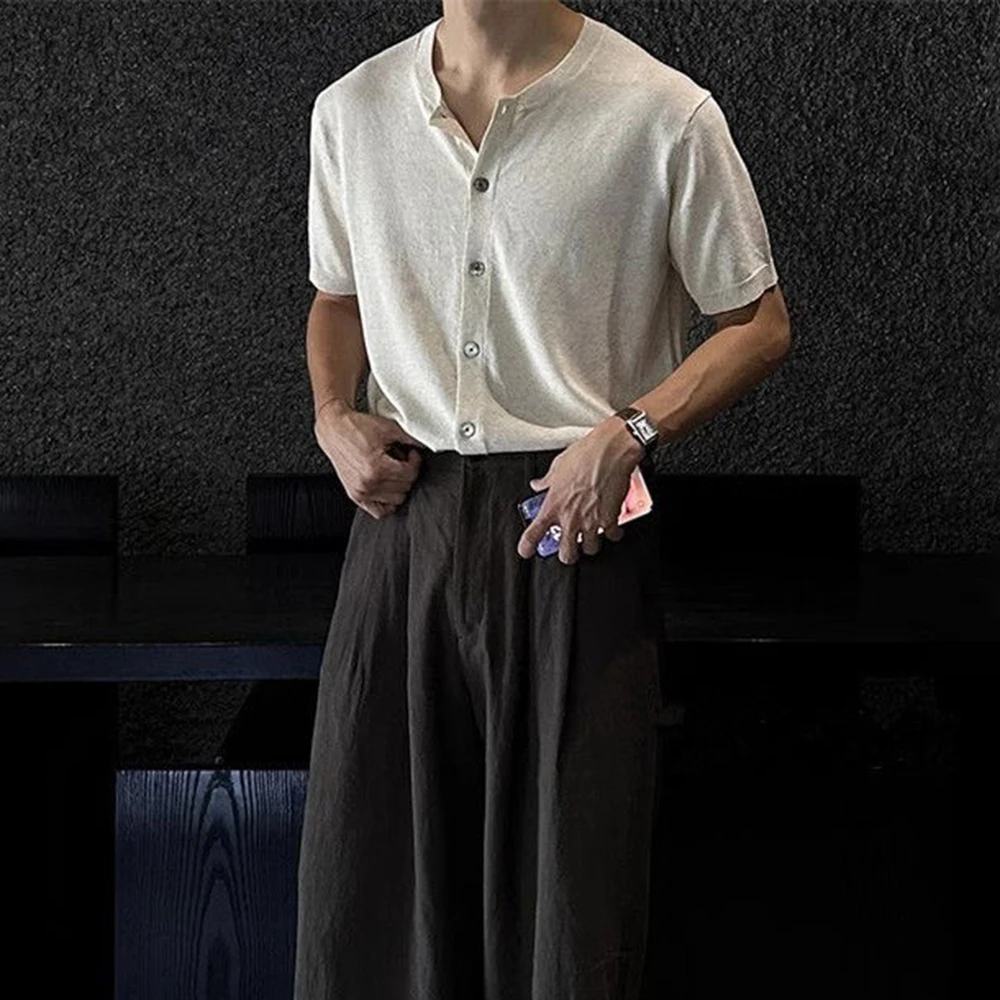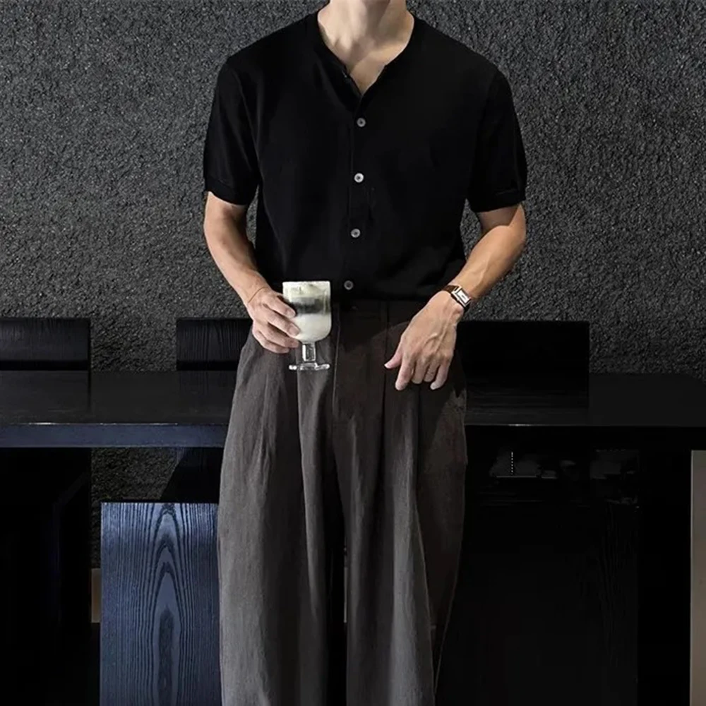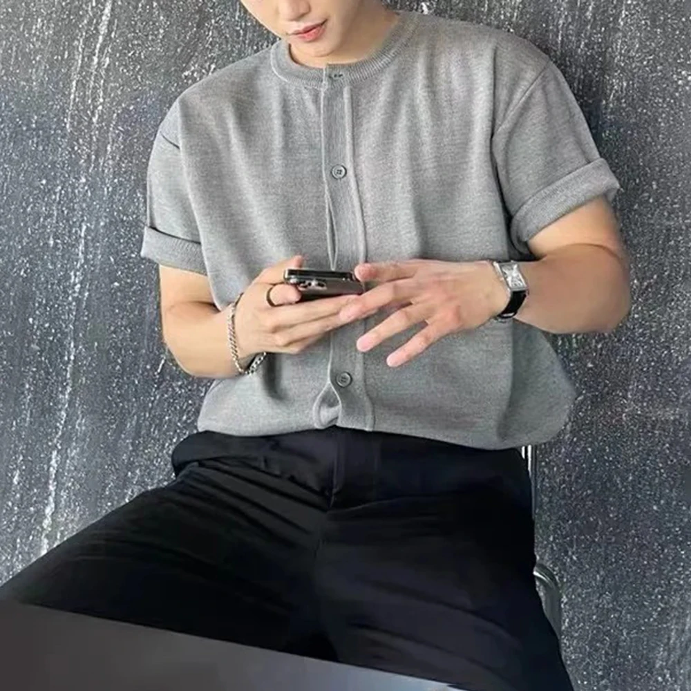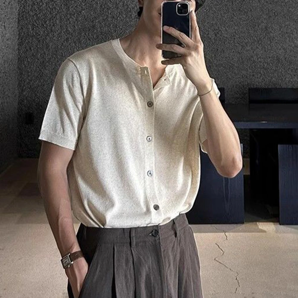 WIAOFELLAS - Men's Solid Color Knitted Cardigan Short-Sleeved Shirt American Retro Fashion Trend Street Loose Breathable Niche Men's Tops
