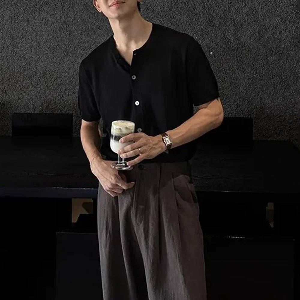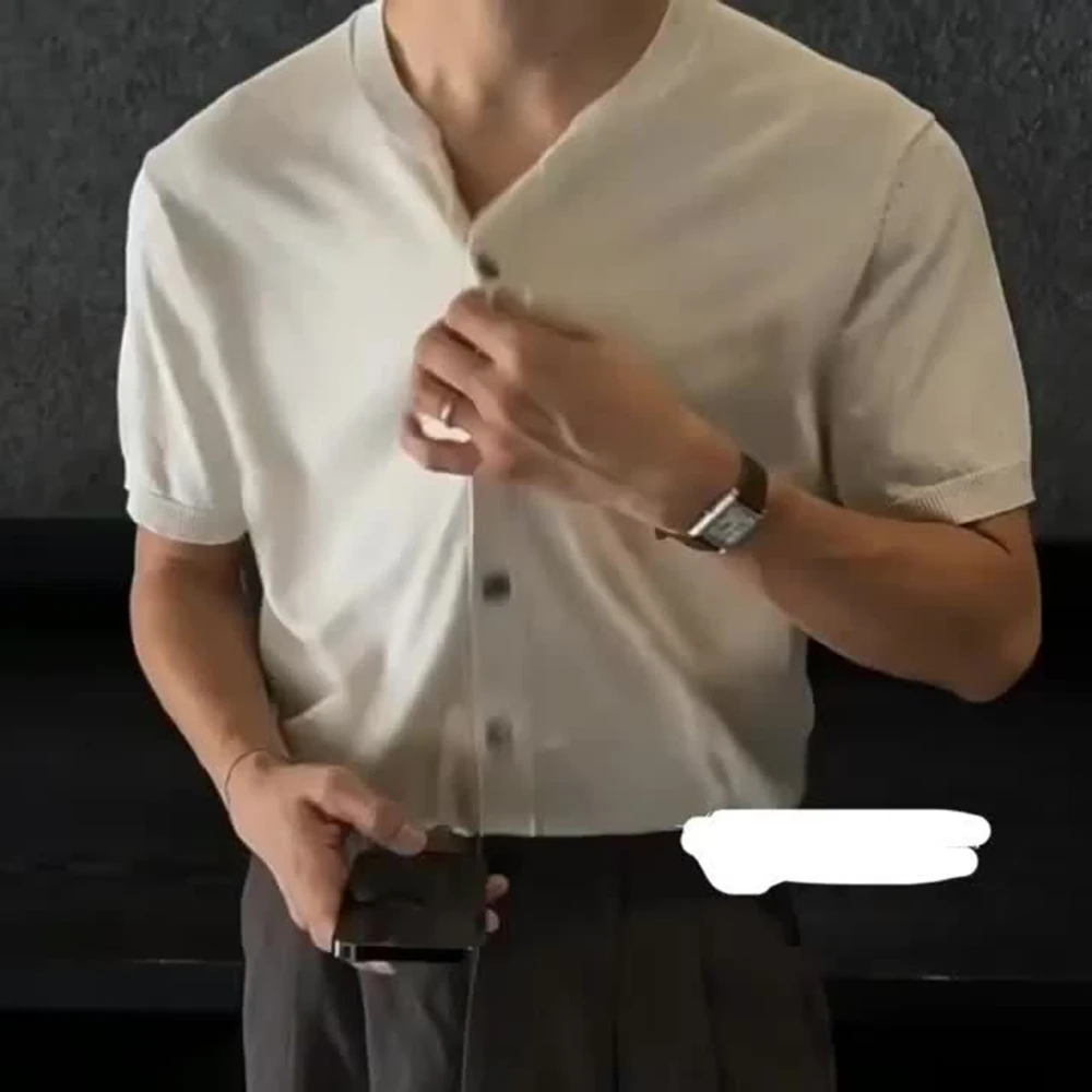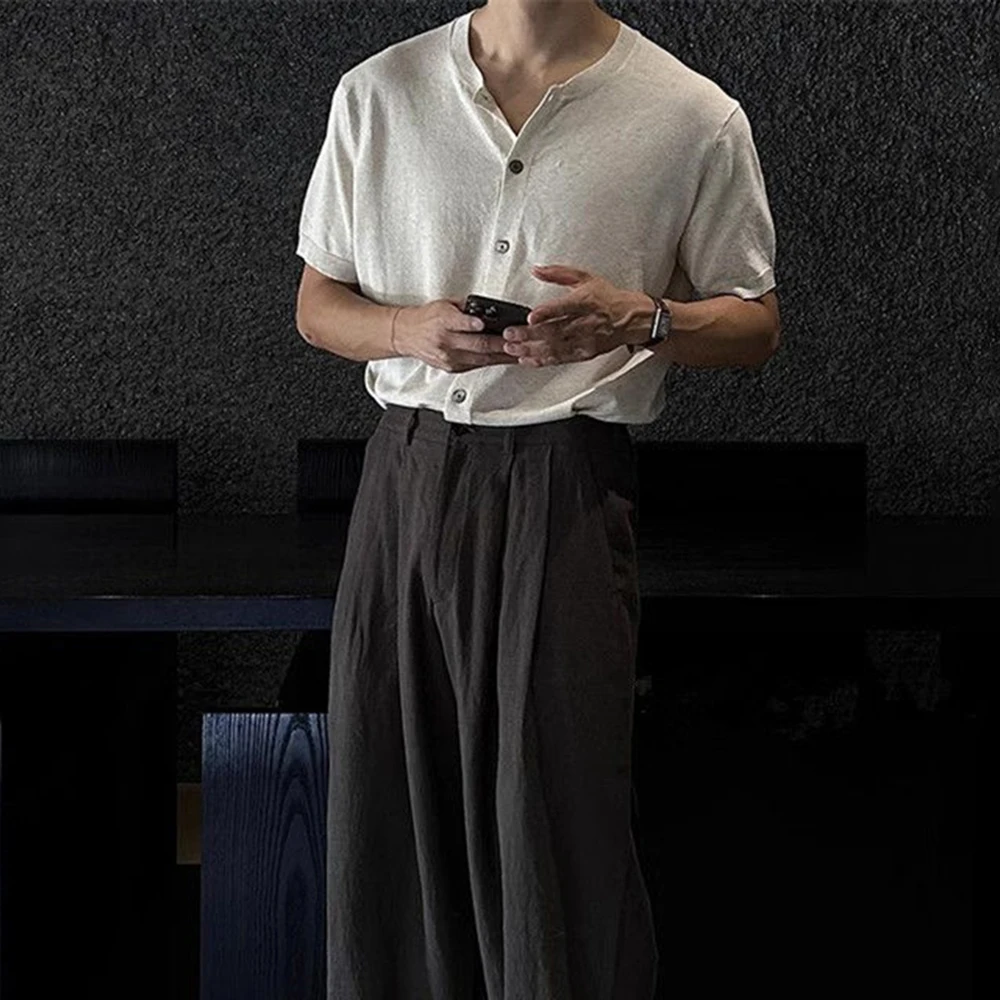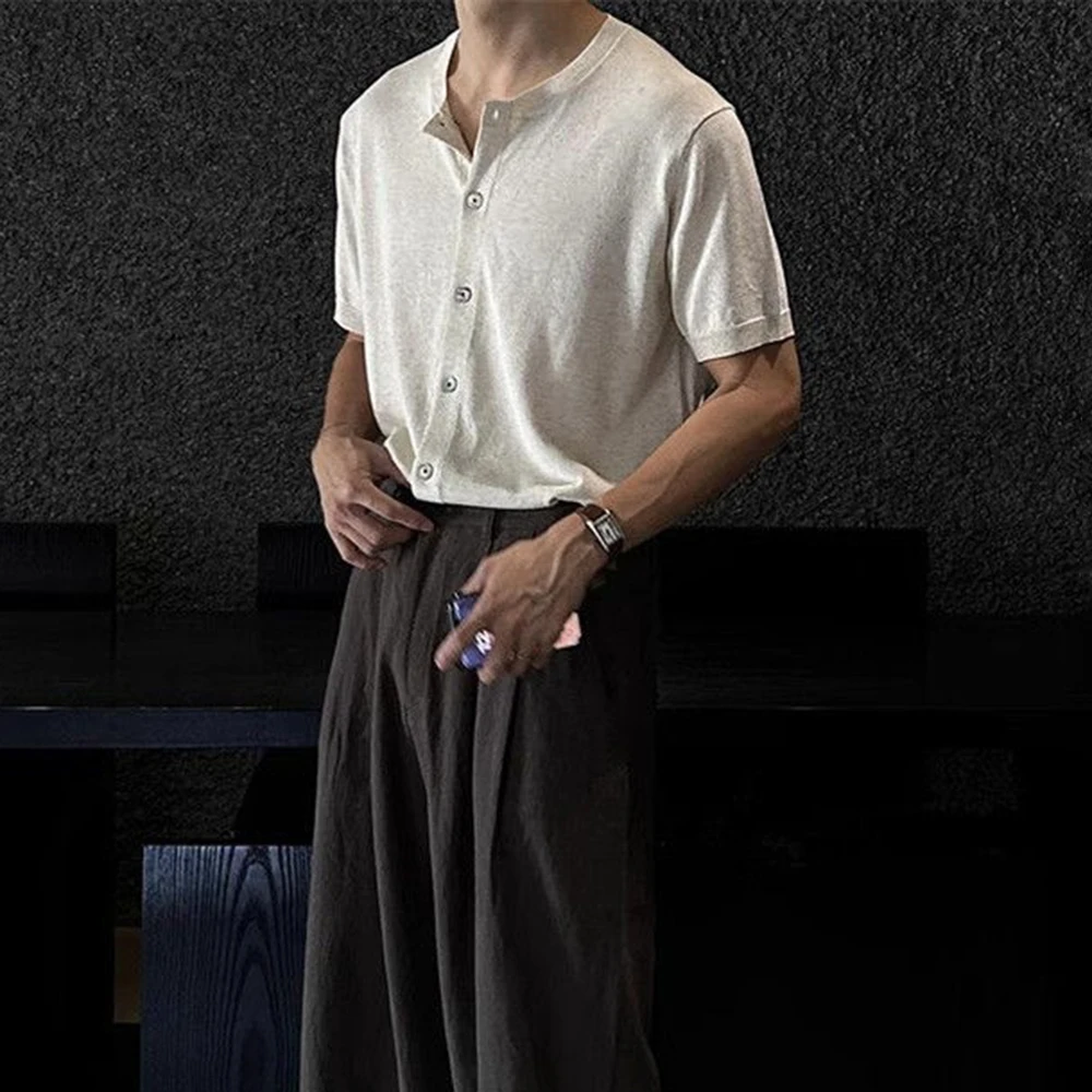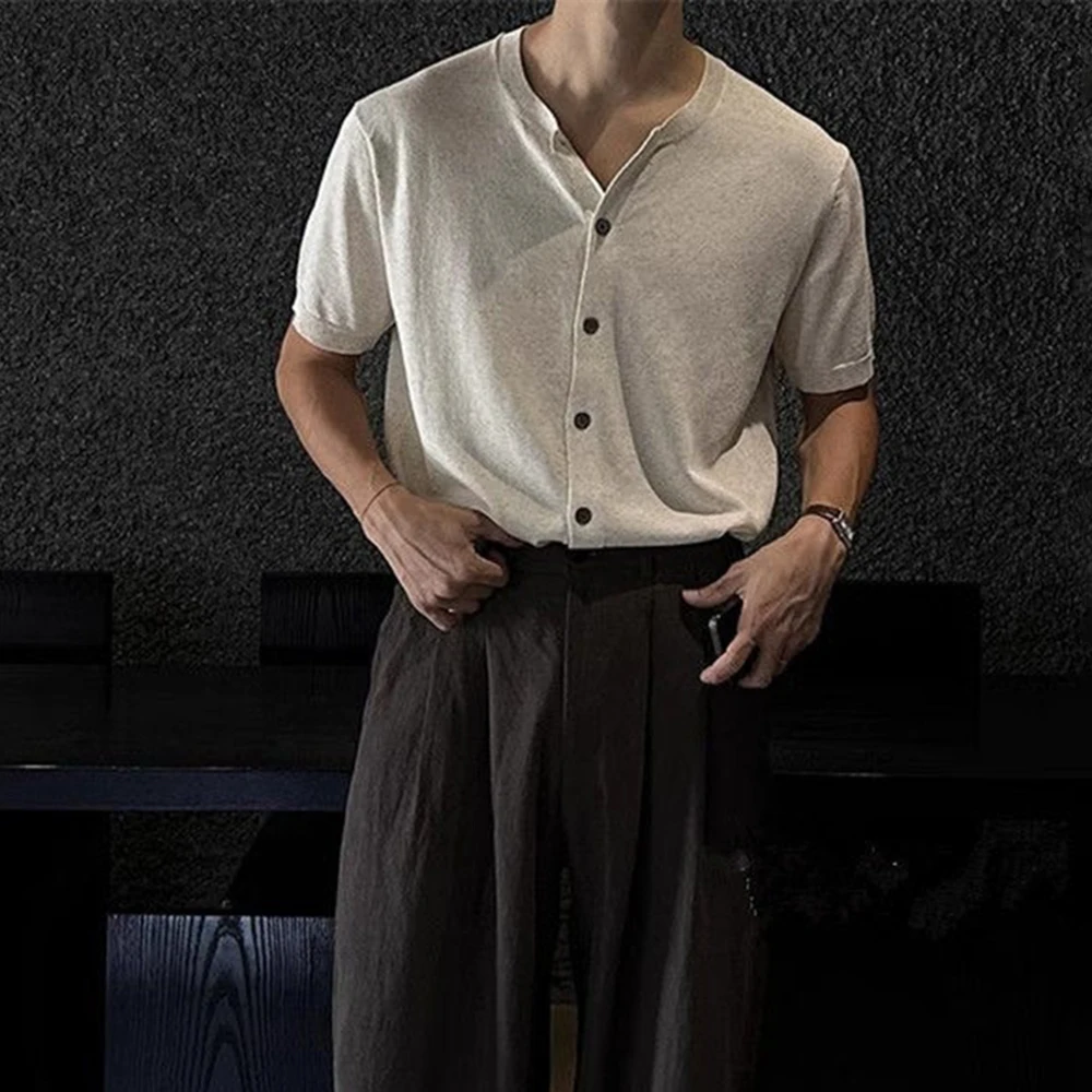 WIAOFELLAS - Men's Solid Color Knitted Cardigan Short-Sleeved Shirt American Retro Fashion Trend Street Loose Breathable Niche Men's Tops