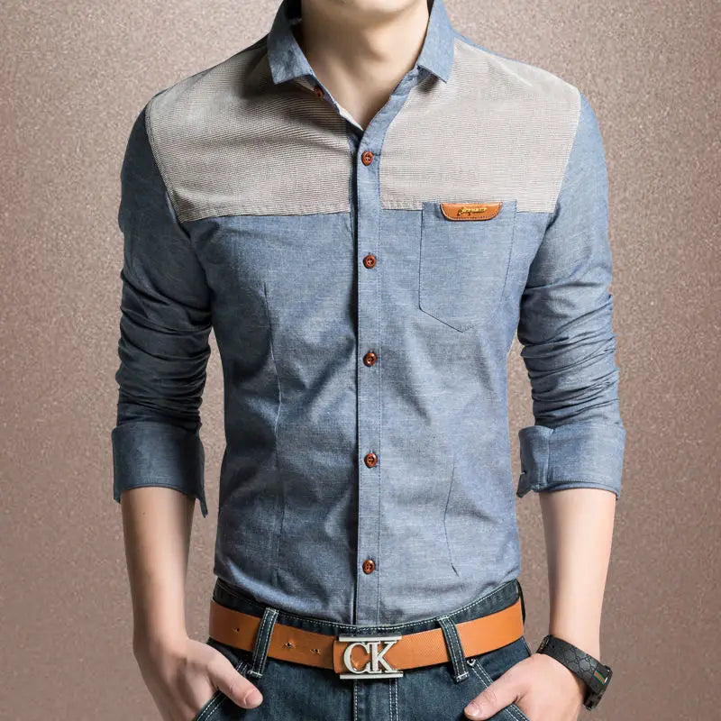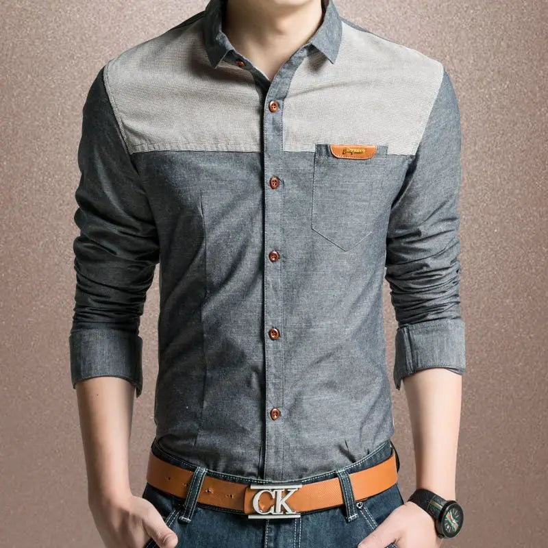 WIAOFELLAS - Men's Square Neck Long Sleeved Korean Slim Patchwork Pockets Denim Thick Autumn and Winter New Casual Cardigan Button Shirt Tops