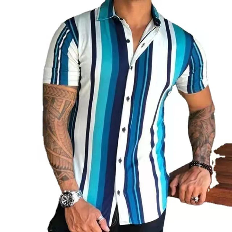 WIAOFELLAS  -  Men's Striped Casual Shirts Streetwear Slim Fit Shorts Sleeve Shirt Tops Men Silk Satin Digital Printed Blouse Male Clothing