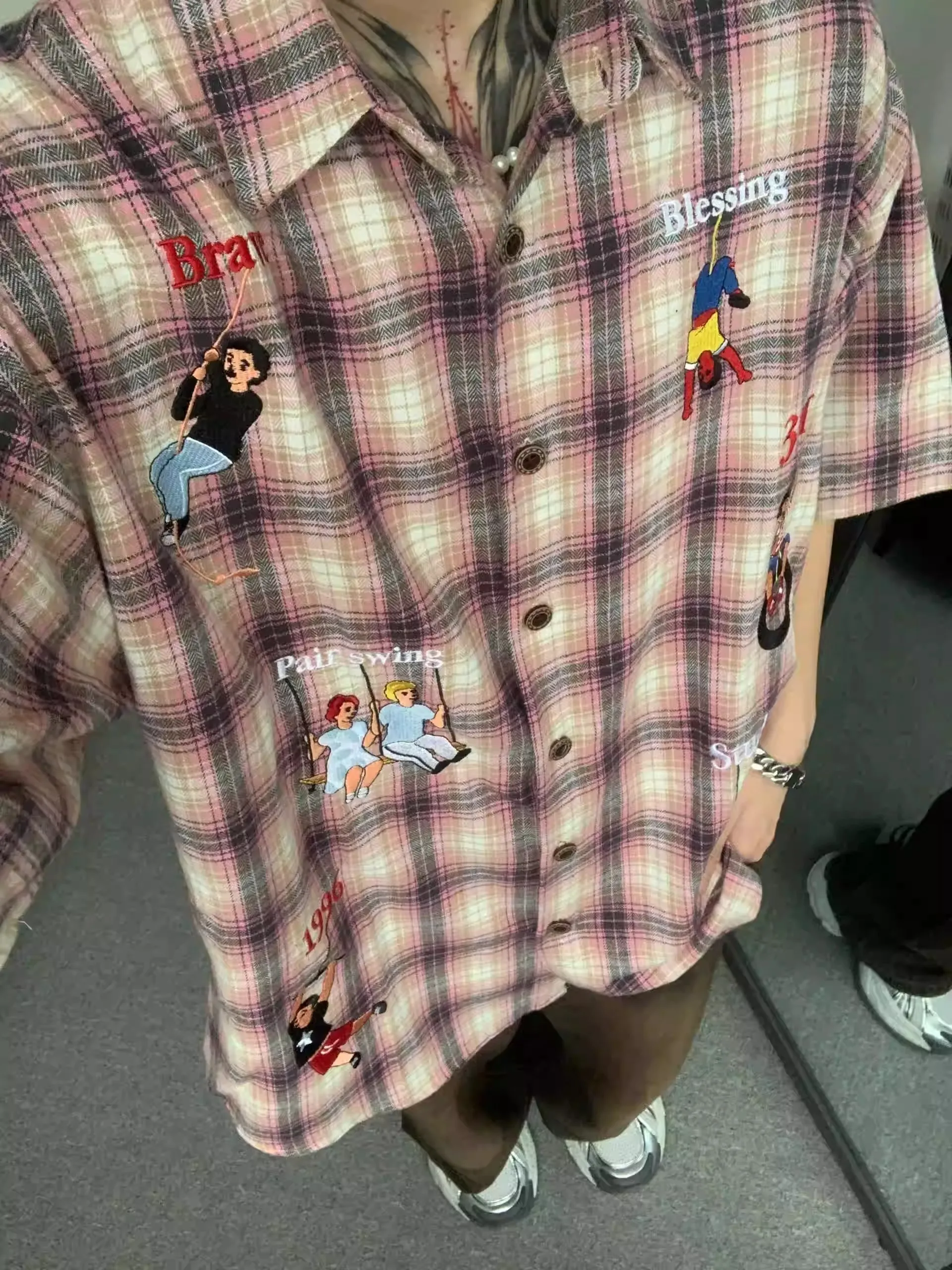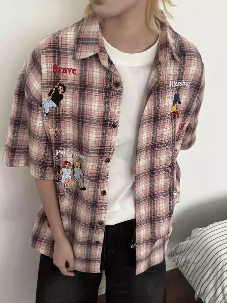 WIAOFELLAS  -  Men's Summer Thin Shirts Loose Comfort Embroidered Plaid Half Sleeve Shirt American Style Retro Short Sleeve Plaid Shirt