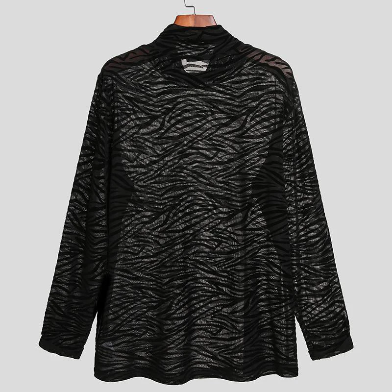 Wiaofellas - Mesh Shirt New Long Sleeve Turtleneck Night Club Elastic Sexy Tees Spring Fashion Zebra-striped Transparent Shirts For Men