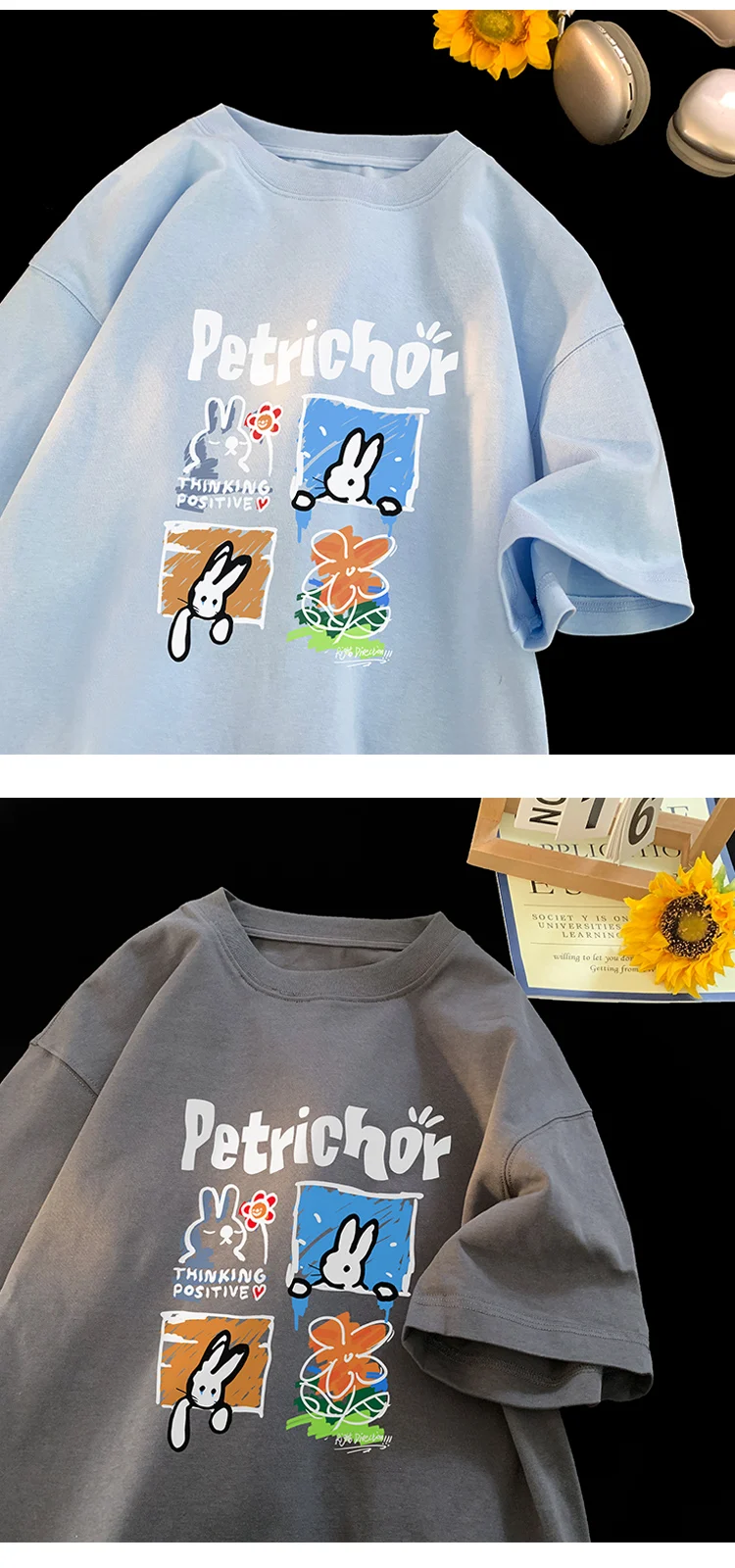 WIAOFELLAS - New Cute Cartoon T-shirt Rabbit Pattern Tops Unisex Round Neck Oversized T-Shirt Y2k Summer Tees Harajuku Sort Sleeve Tshirt