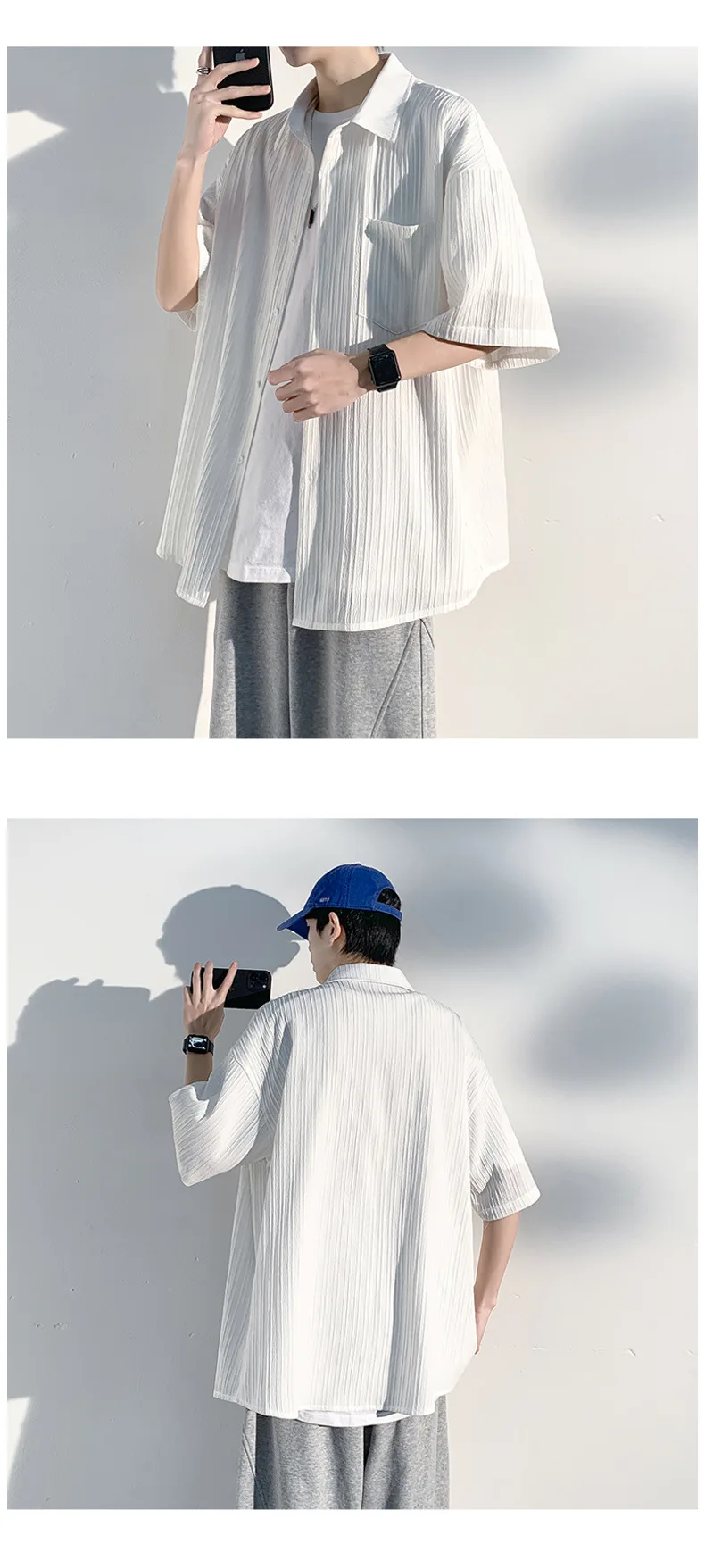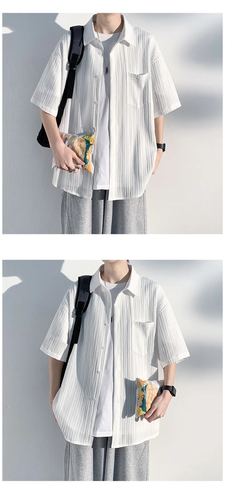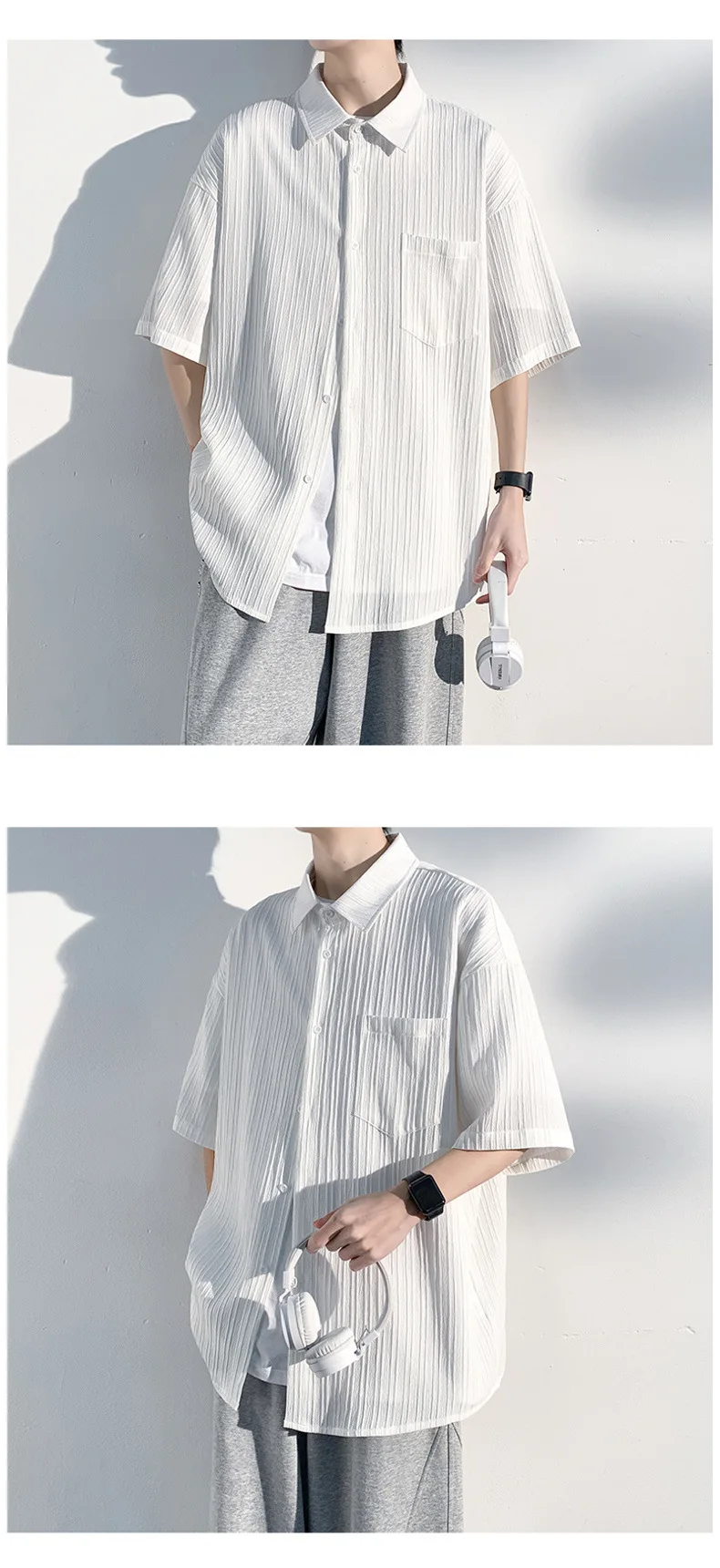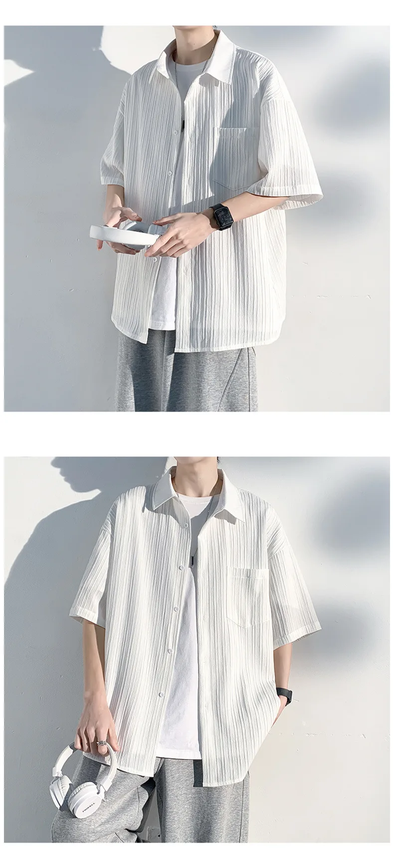 Wiaofellas - New Ice Silk Vertical Stripe Shirt Men's Summer Short Sleeve Lapel Male Shirts Blouse Top Loose Casual Men Clothing Camisas