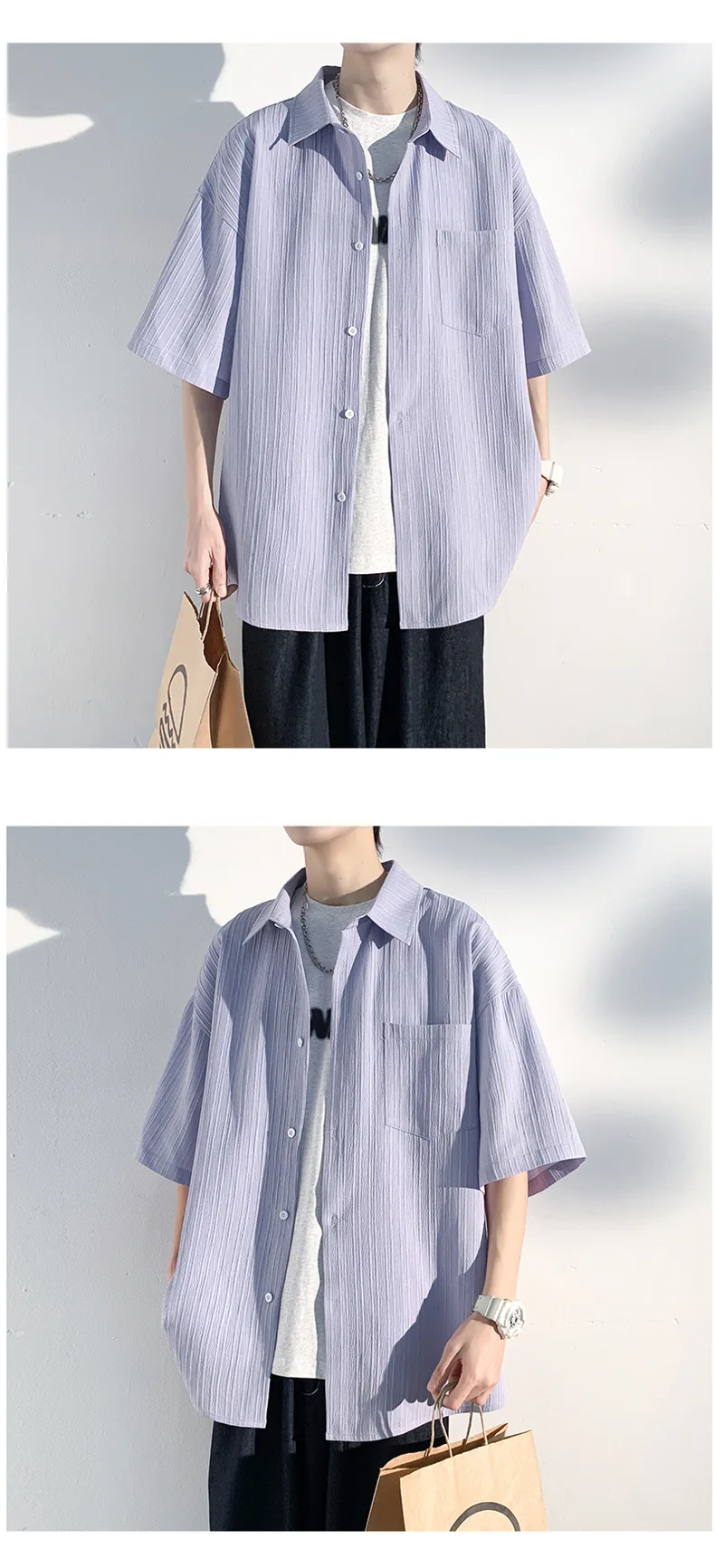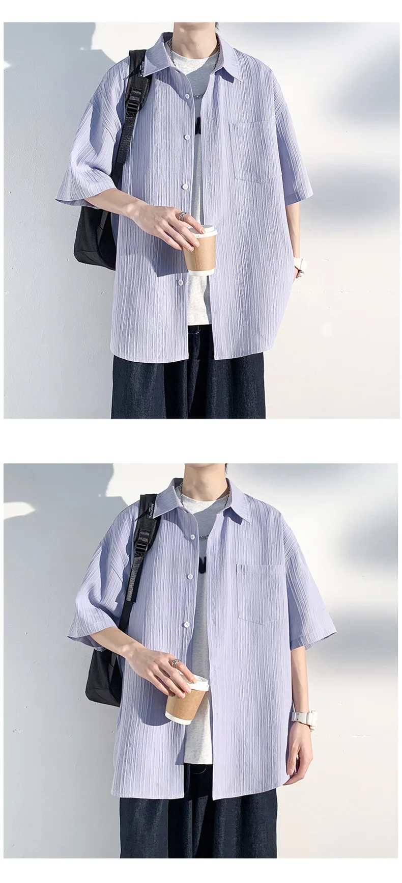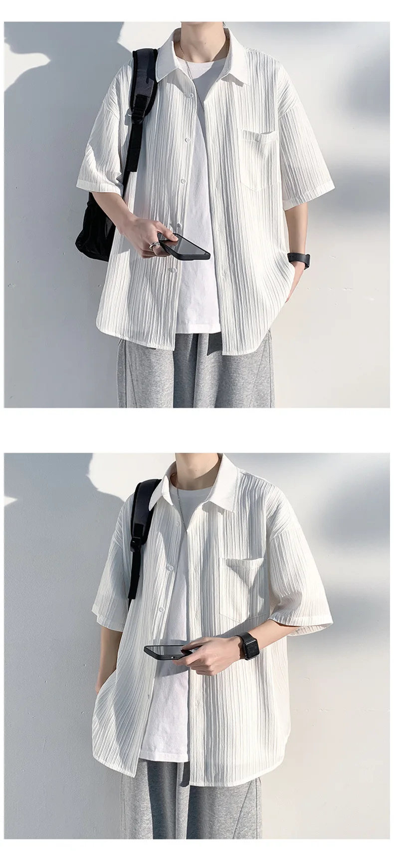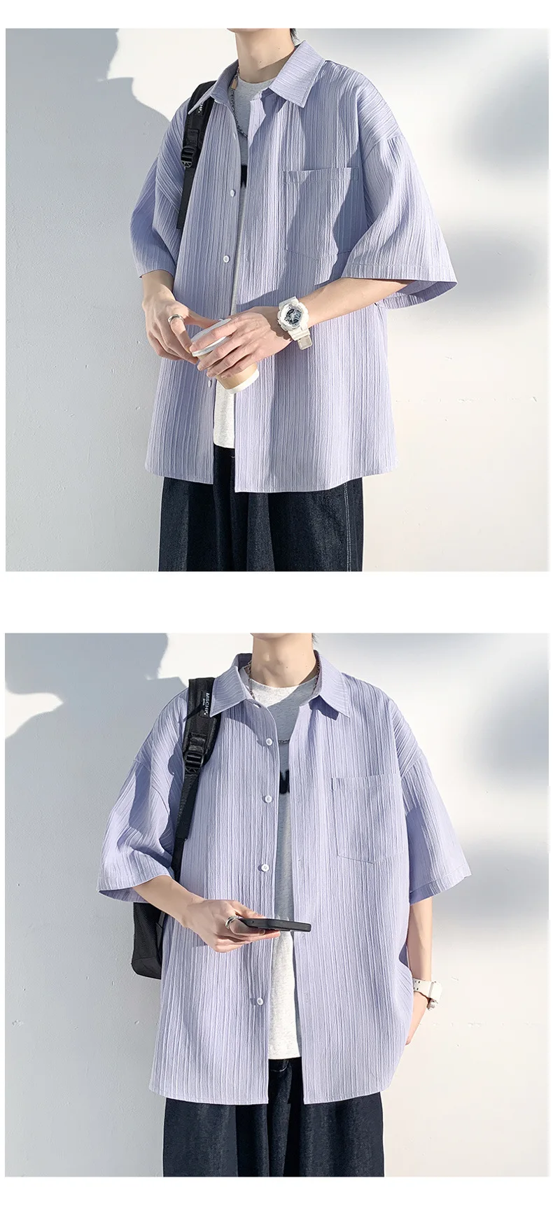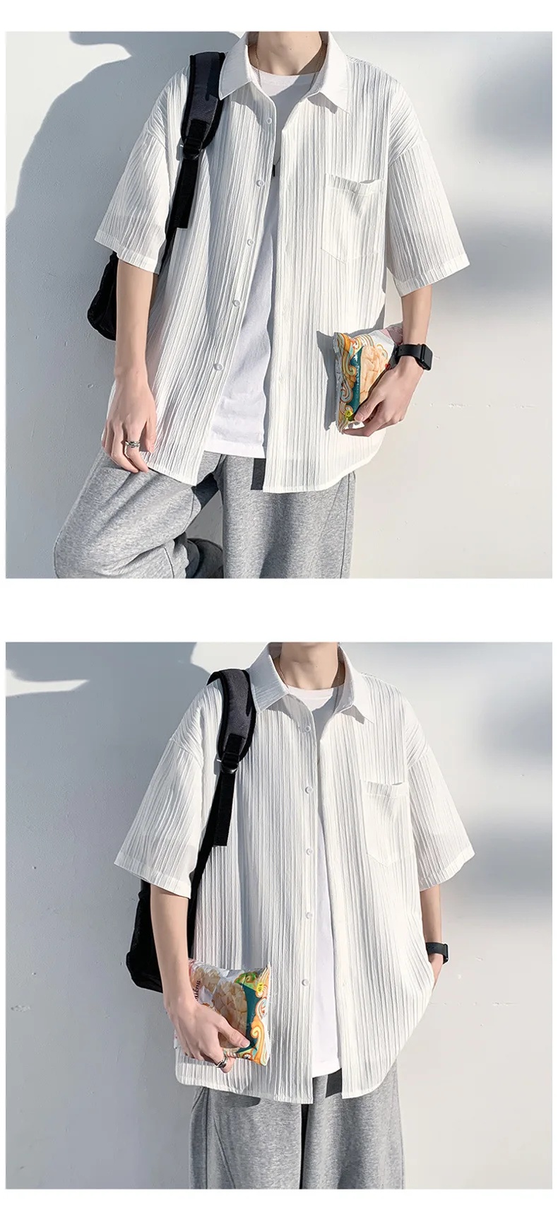 Wiaofellas - New Ice Silk Vertical Stripe Shirt Men's Summer Short Sleeve Lapel Male Shirts Blouse Top Loose Casual Men Clothing Camisas