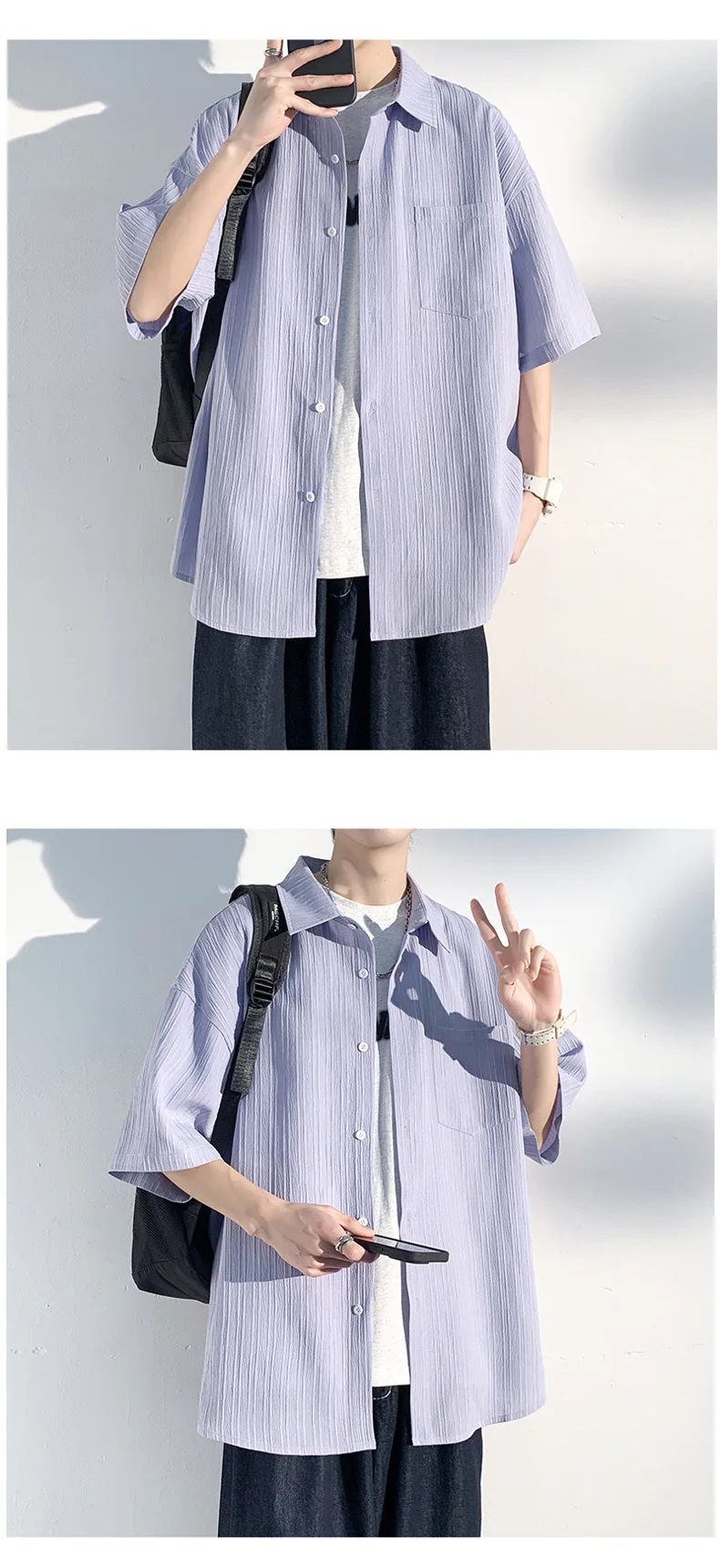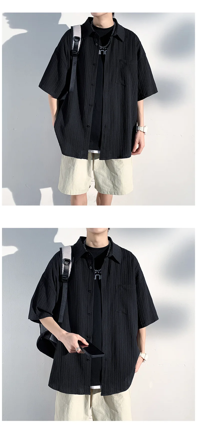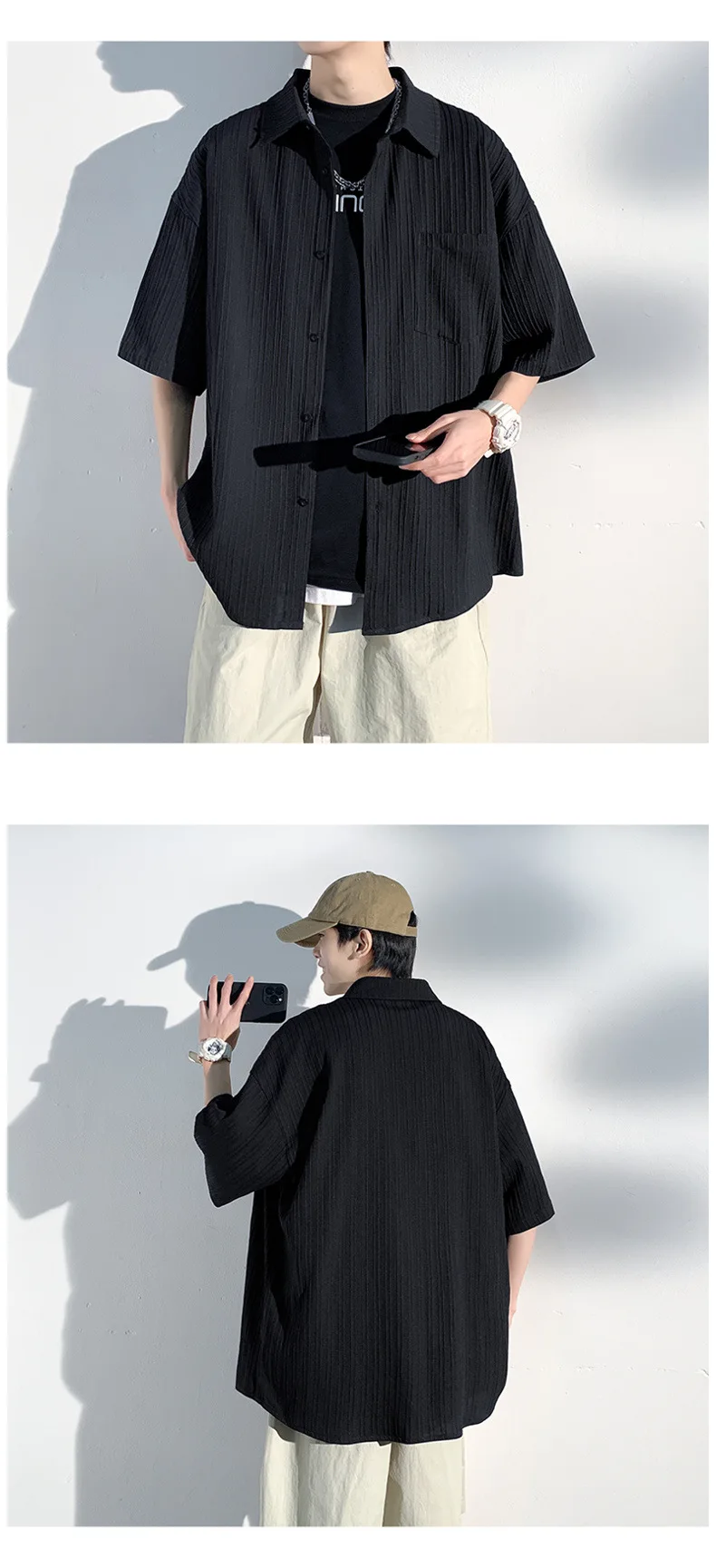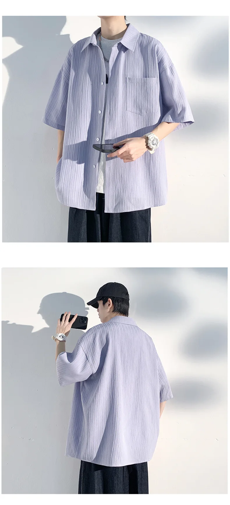 Wiaofellas - New Ice Silk Vertical Stripe Shirt Men's Summer Short Sleeve Lapel Male Shirts Blouse Top Loose Casual Men Clothing Camisas