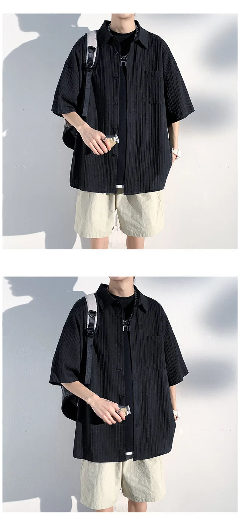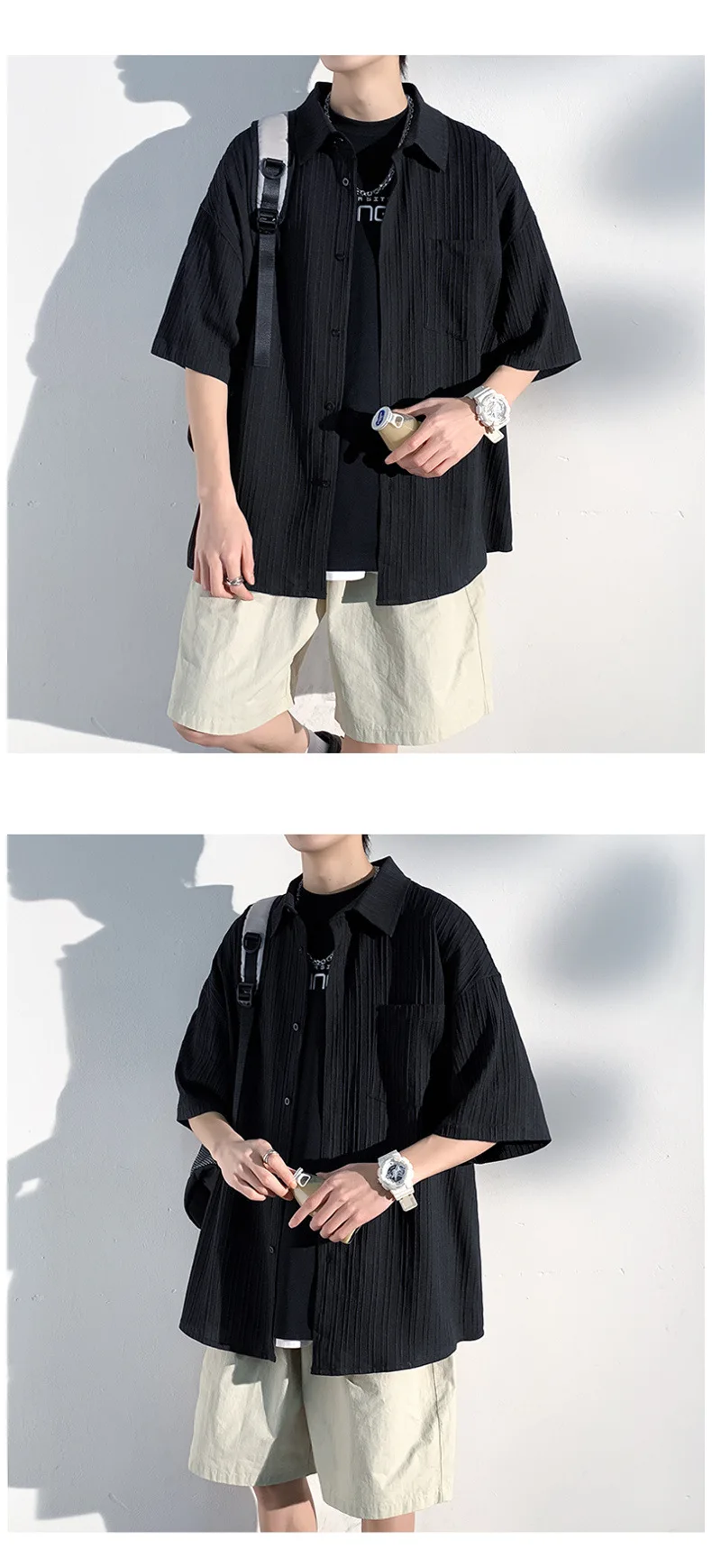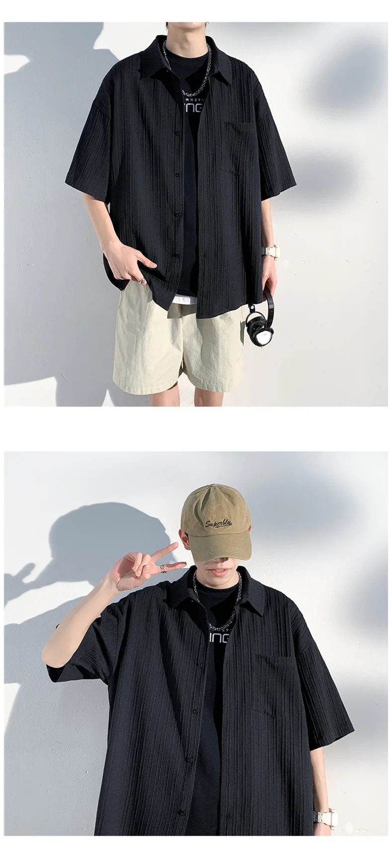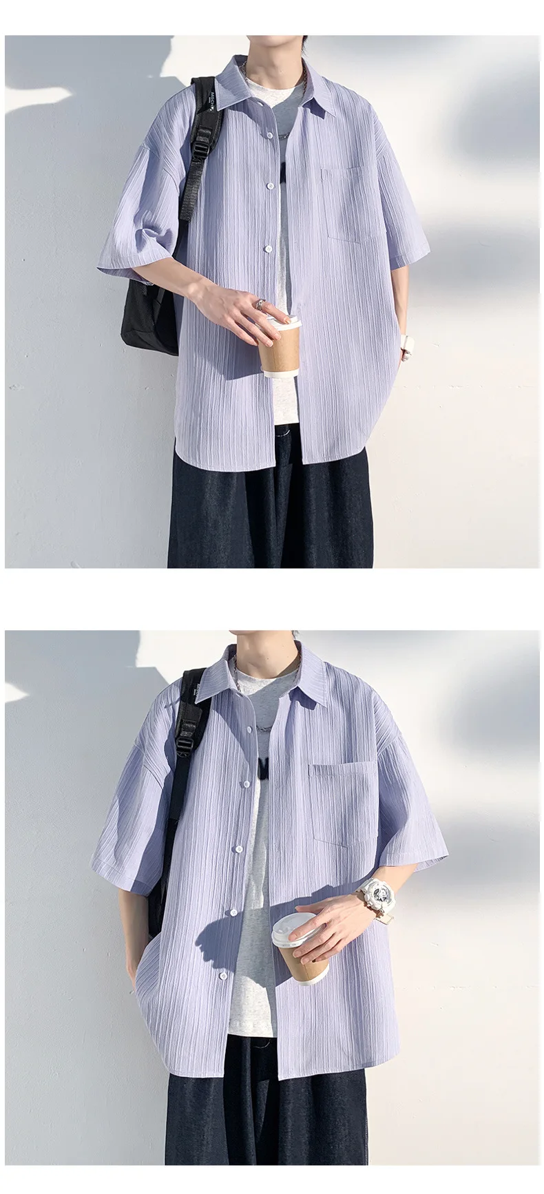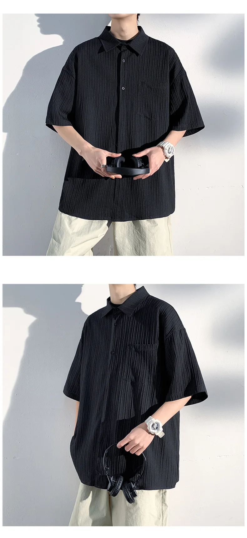 Wiaofellas - New Ice Silk Vertical Stripe Shirt Men's Summer Short Sleeve Lapel Male Shirts Blouse Top Loose Casual Men Clothing Camisas