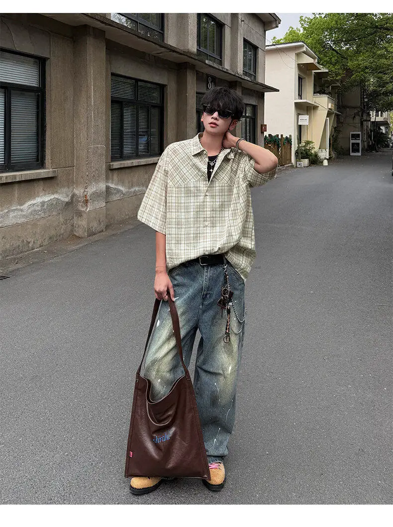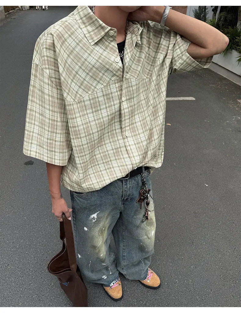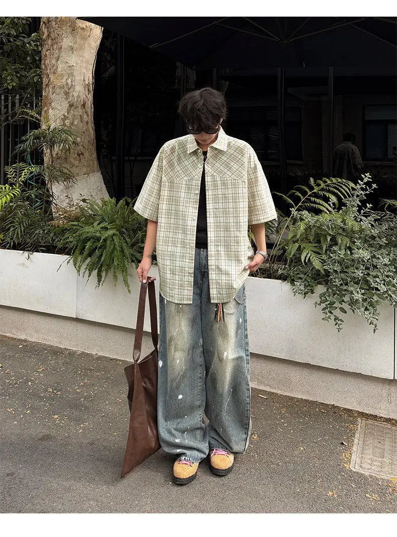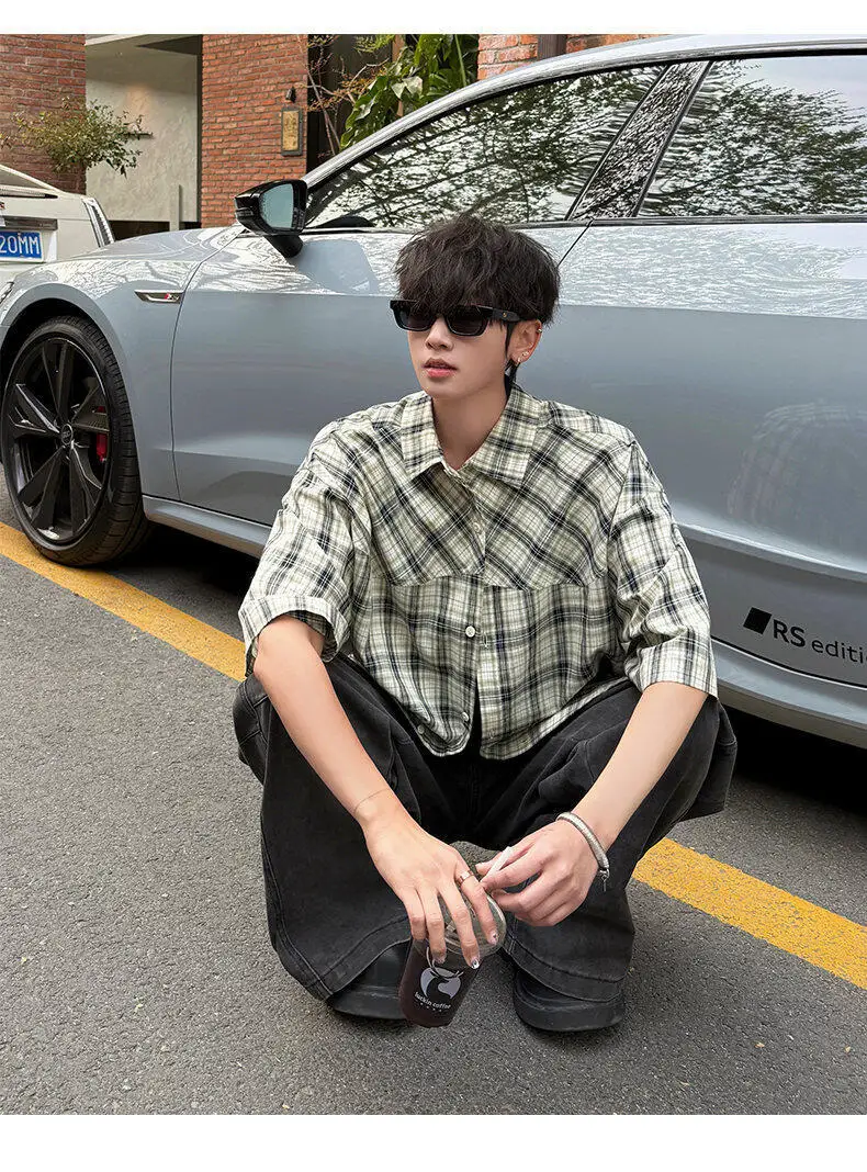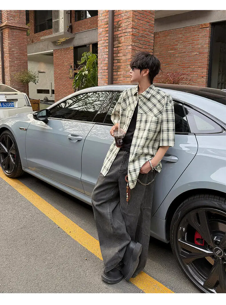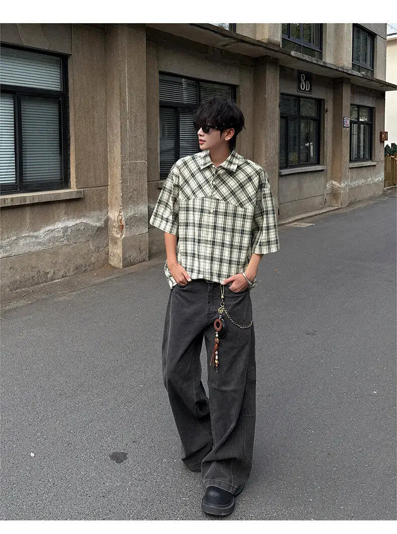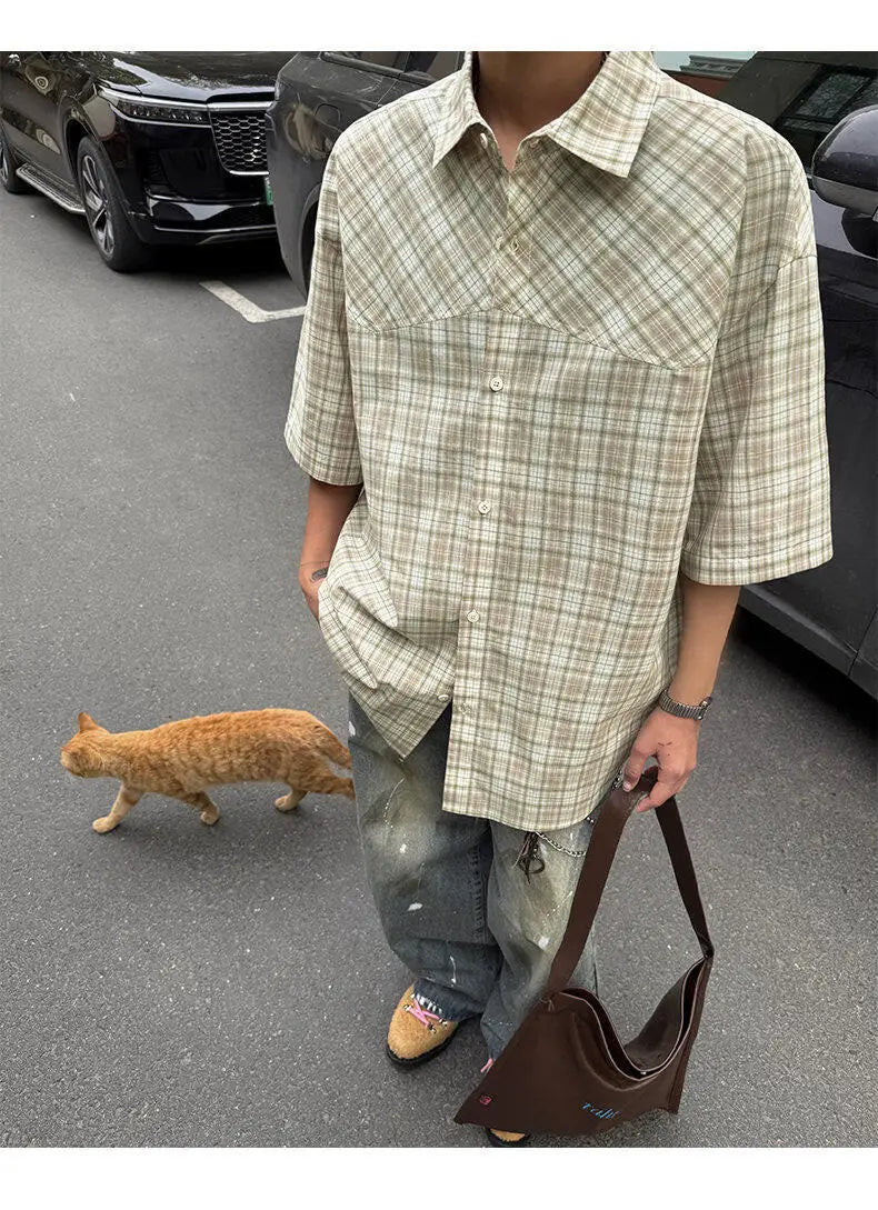 WIAOFELLAS - New Korean Style Men's Shirts Short Sleeve Plaid Design Lapel Summer Menswear Loose Single Breasted Male Tops 2025