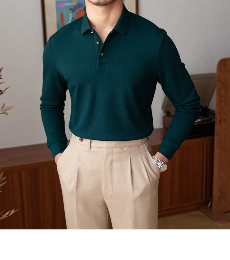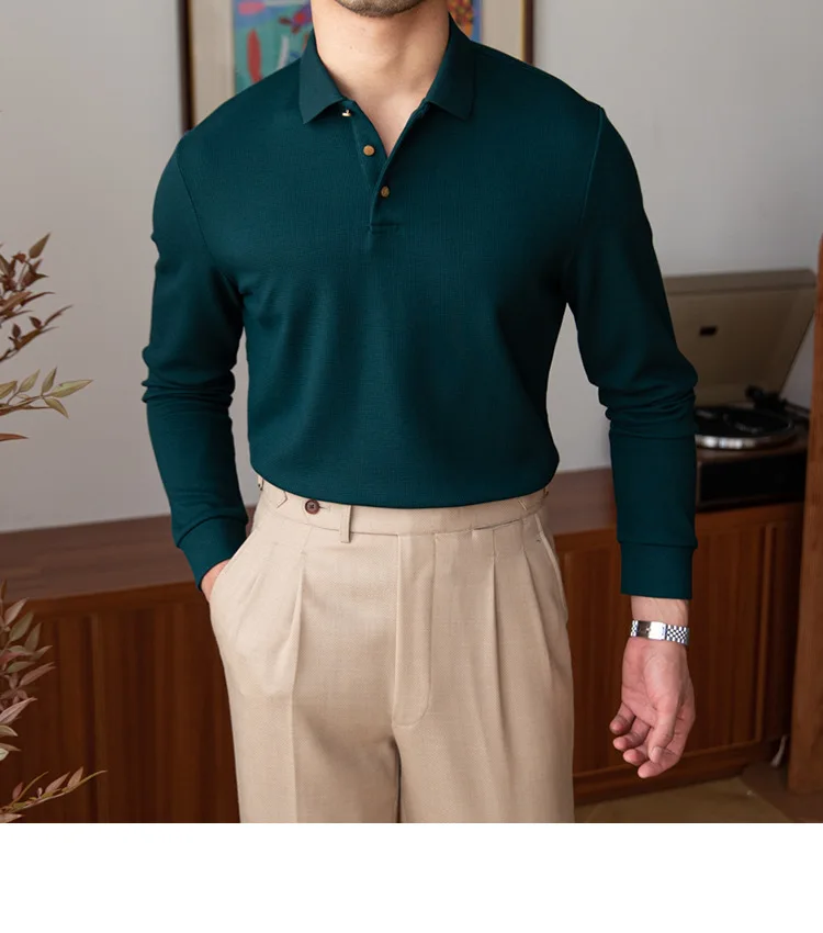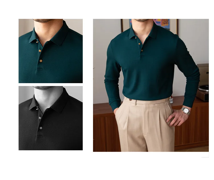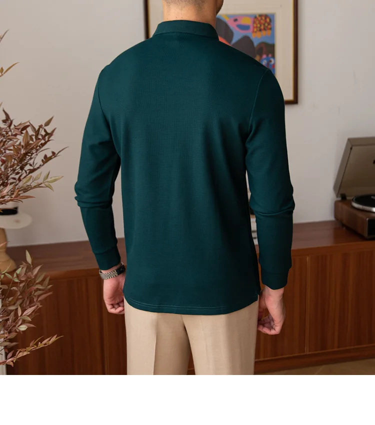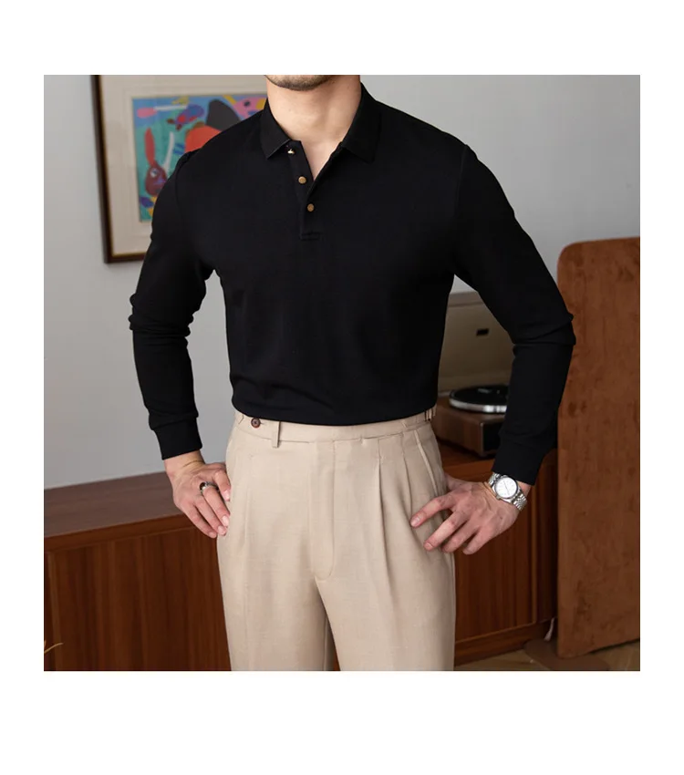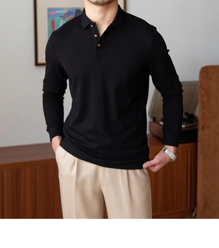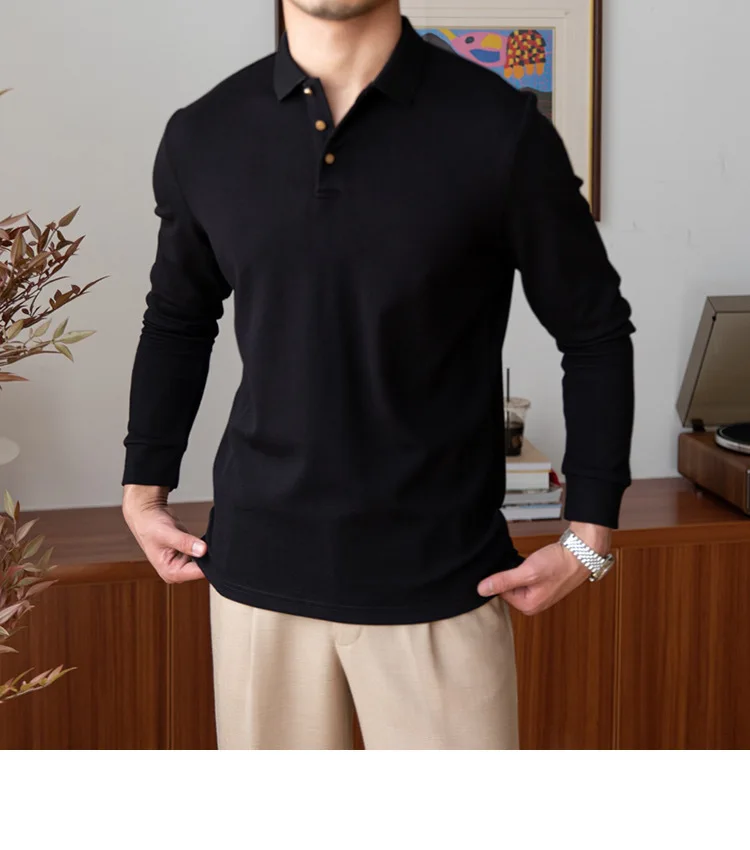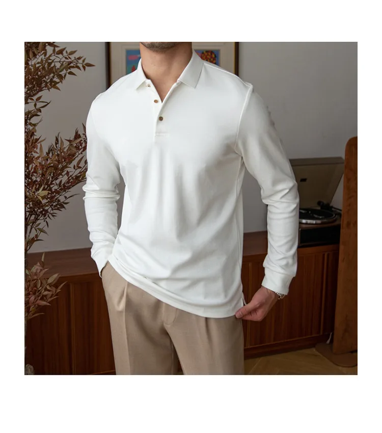 Wiaofellas - New solid color retro slim long-sleeved POLO shirt Korean style youth heavyweight versatile casual bottoming lapel trendy men
