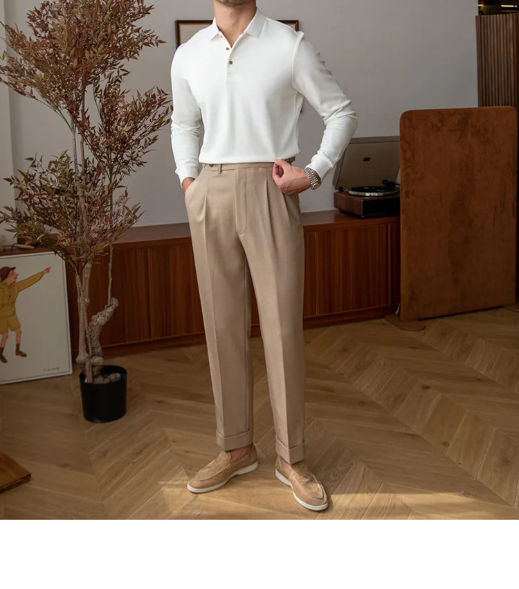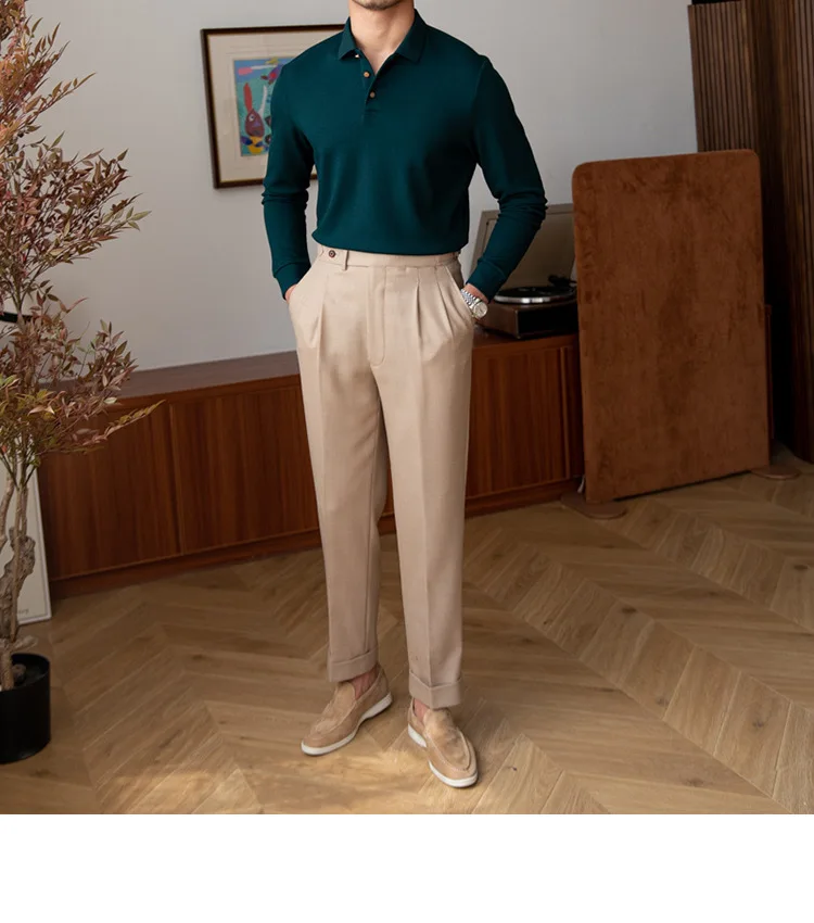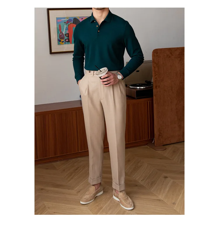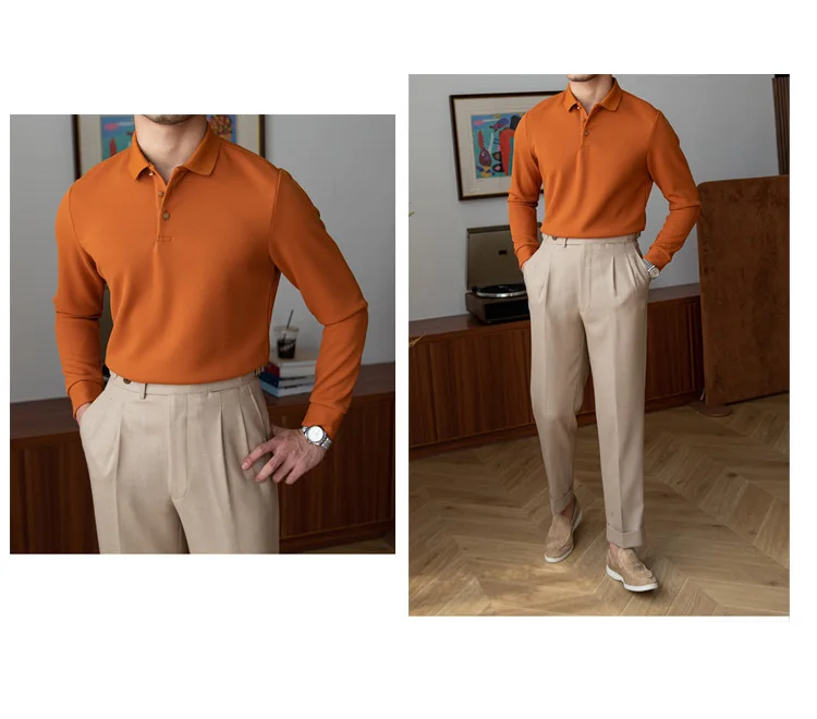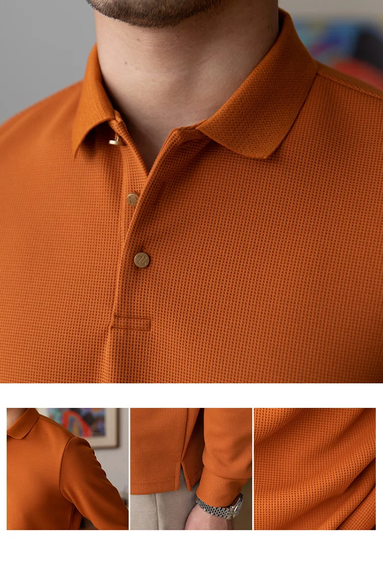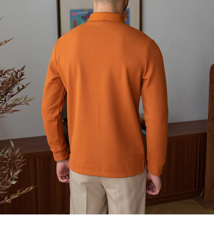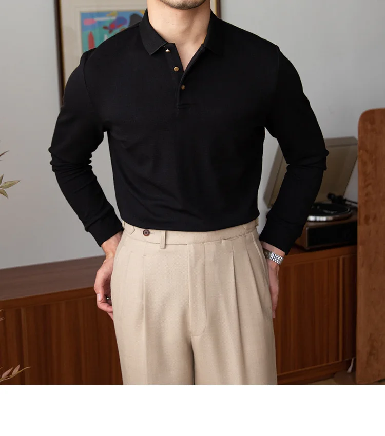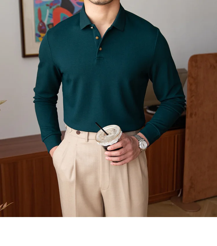 Wiaofellas - New solid color retro slim long-sleeved POLO shirt Korean style youth heavyweight versatile casual bottoming lapel trendy men