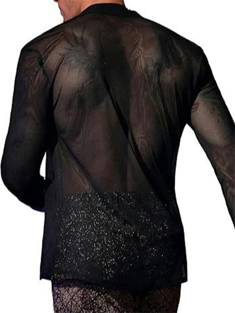 WIAOFELLAS - New Spring Sexy Mesh Shirts Men See Through Transparent Loose Mesh Tops Male Beach Fashion Deep V Neck Button Long Sleeve Shirt