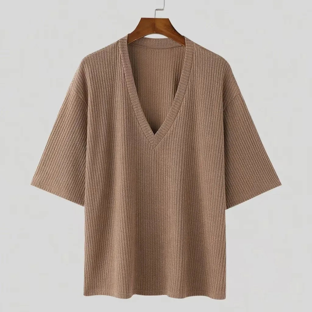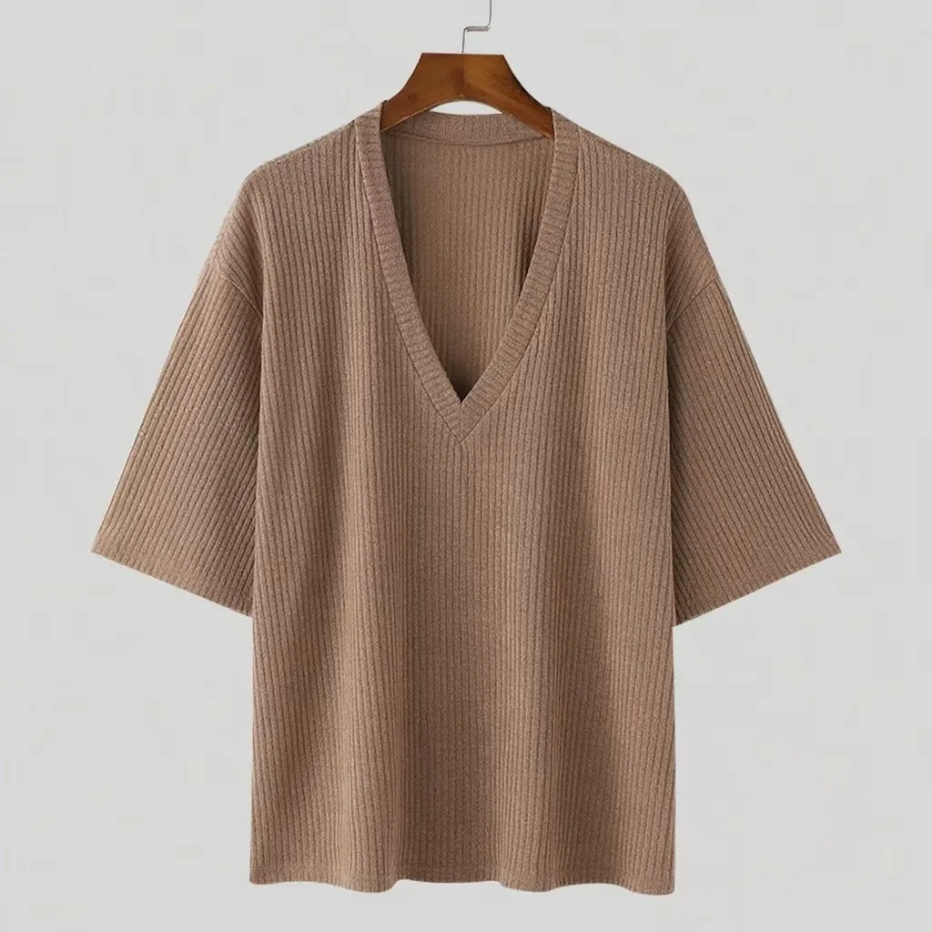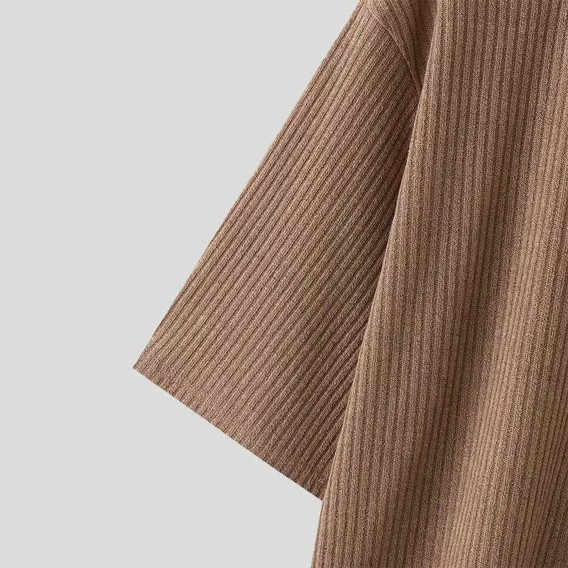 WIAOFELLAS - New Summer Men's Vintage Solid Ribbed T-Shirts Trendy V-Neck Knitted Loose Elasticity T-shirt Fashion Men Half Sleeve Tees