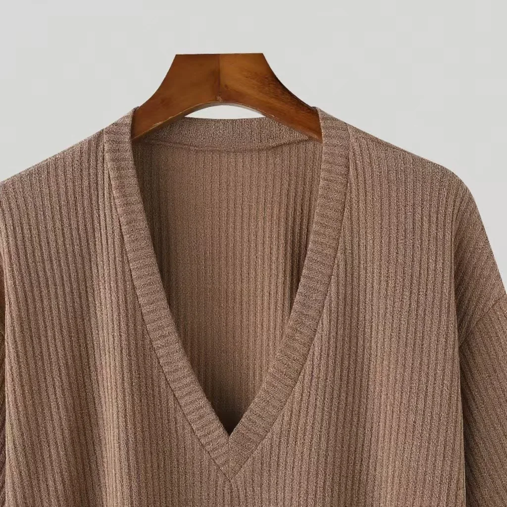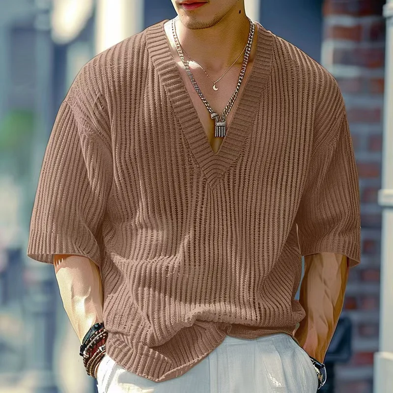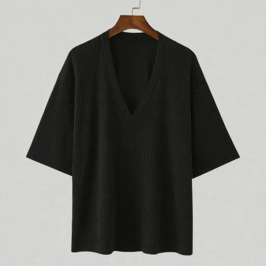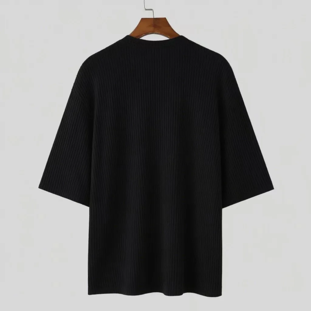 WIAOFELLAS - New Summer Men's Vintage Solid Ribbed T-Shirts Trendy V-Neck Knitted Loose Elasticity T-shirt Fashion Men Half Sleeve Tees