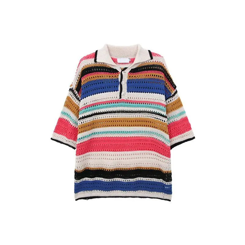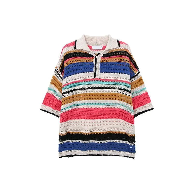 WIAOFELLAS - New Summer Youthful Vitality Hip-hop Fashion Niche Lapel Hollowed Out Color Block Stripes Loose Casual Dopamine T Shirt Men