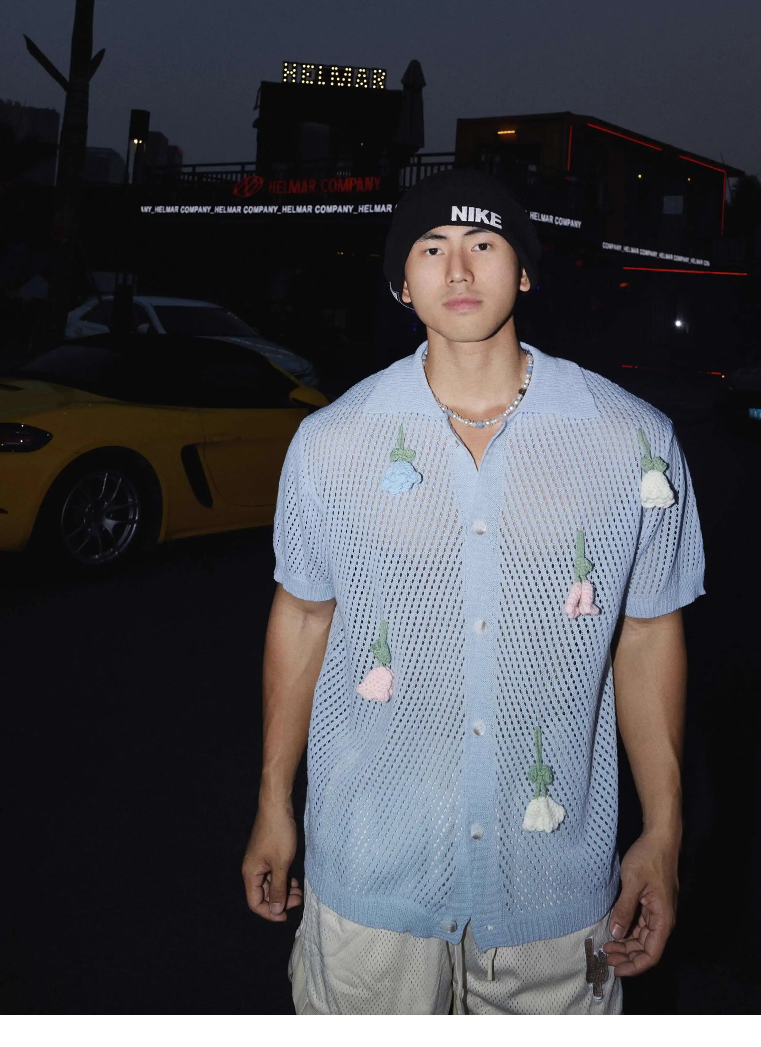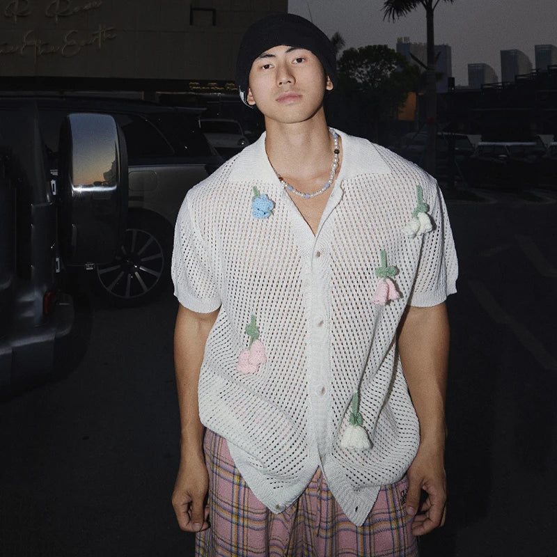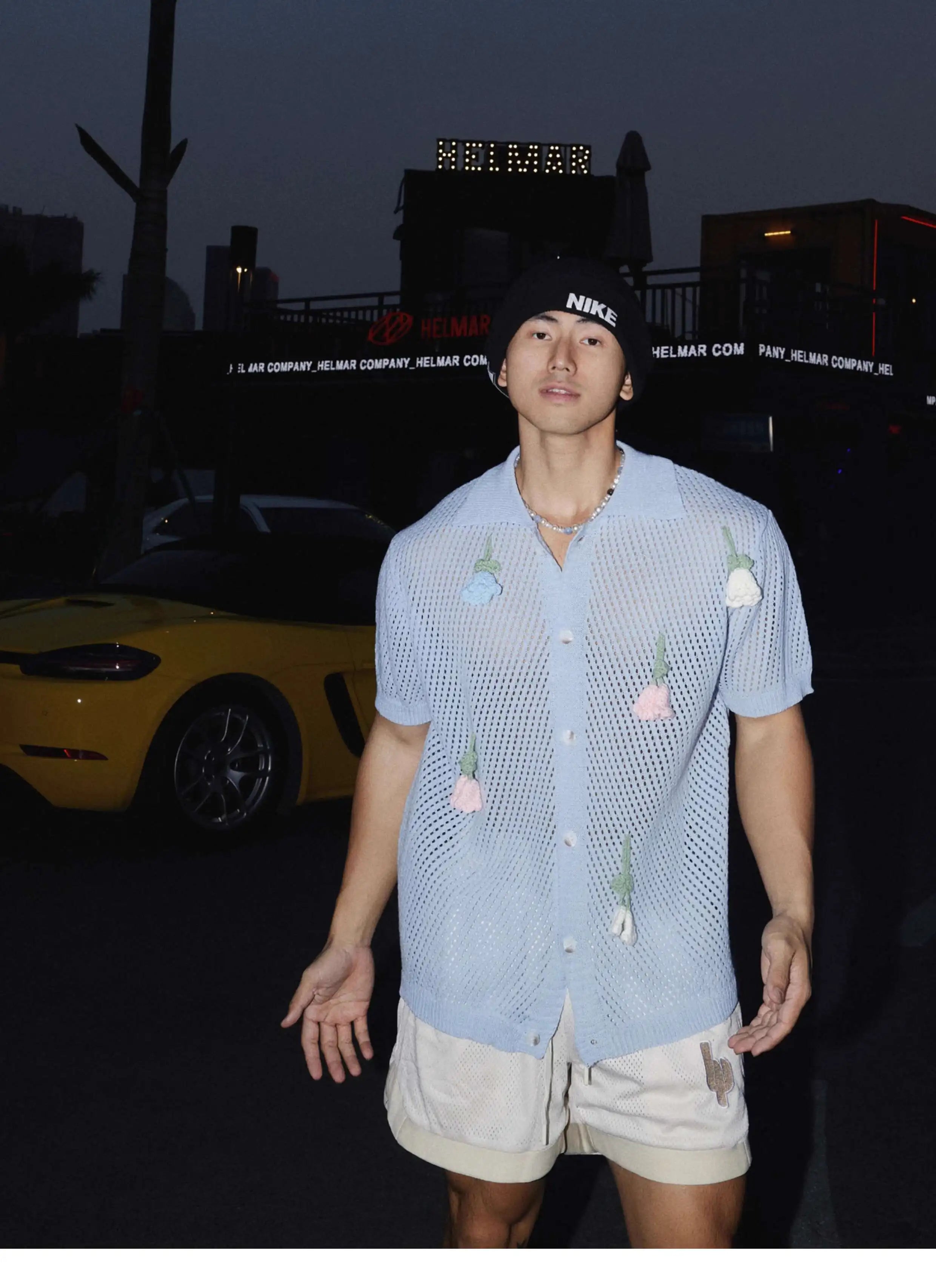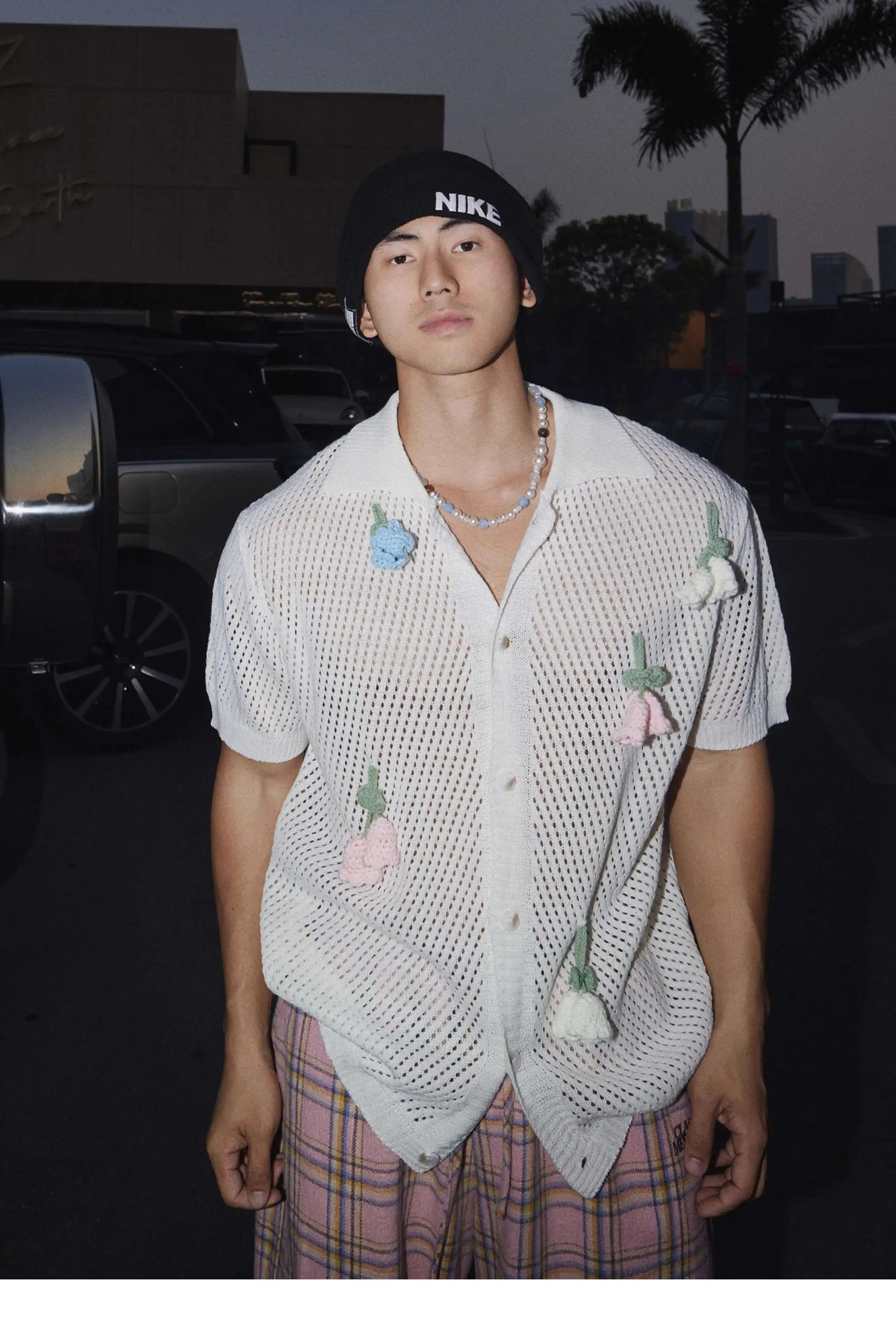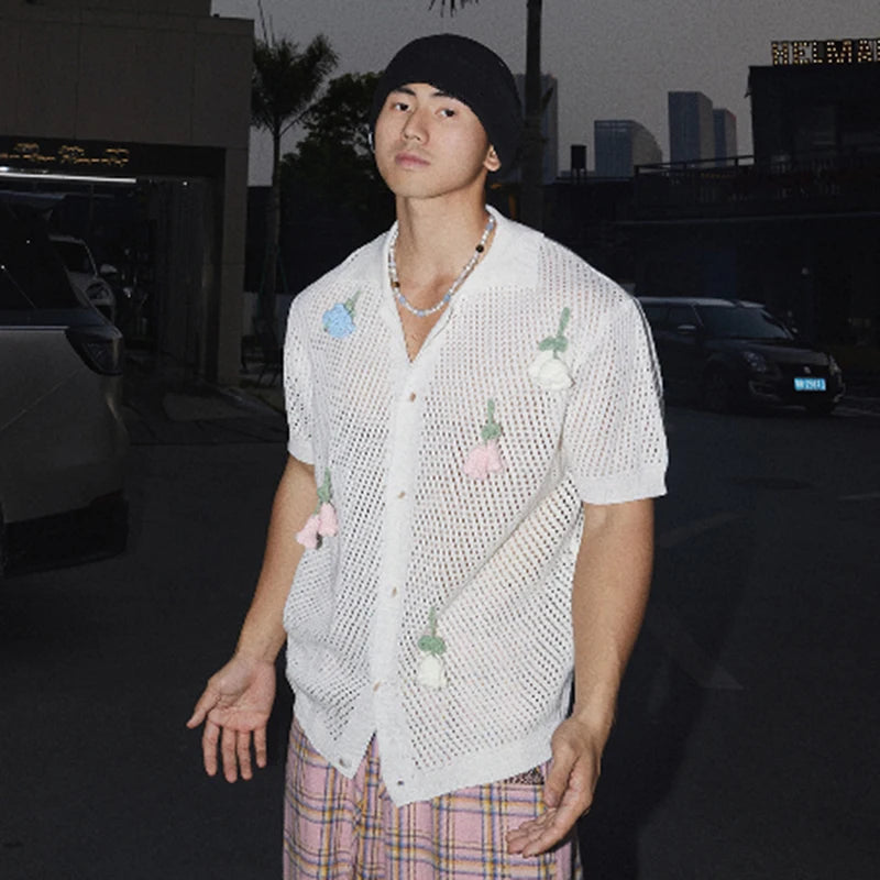 WIAOFELLAS - Niche Design Men's Shirts Three-dimensional Flowers Lapel Hollow Out Loose Short Sleeved Male Tops Single Breasted