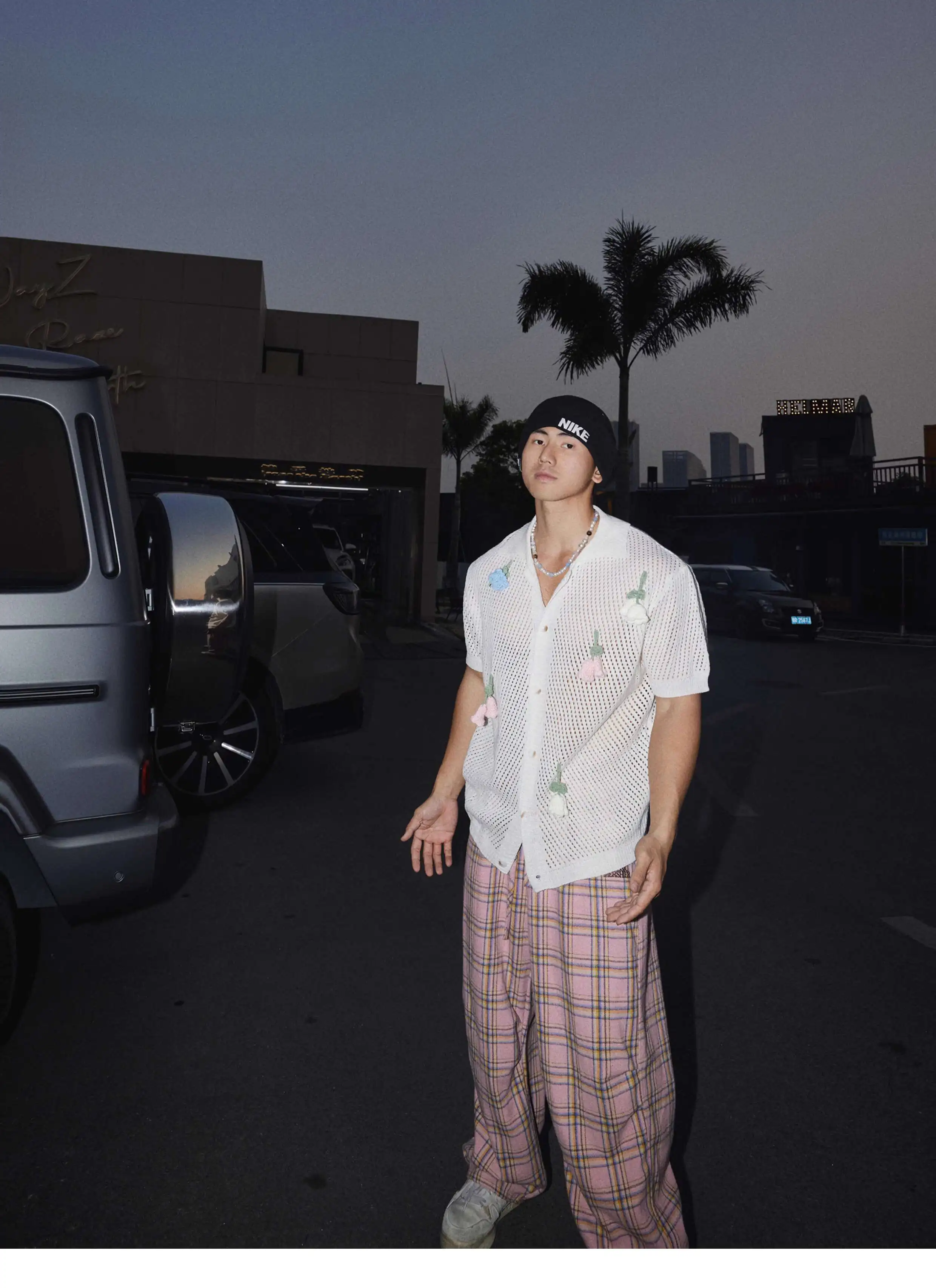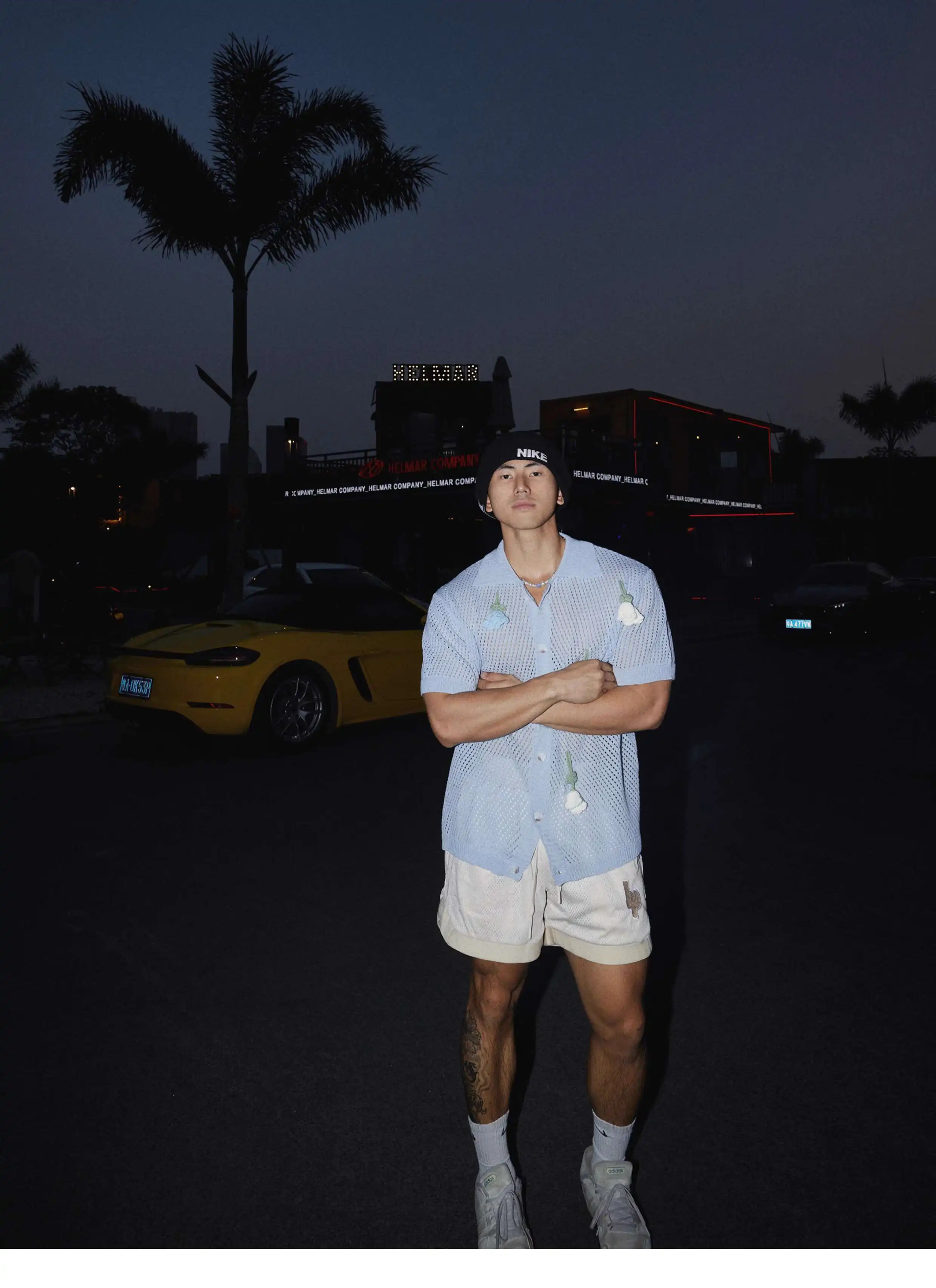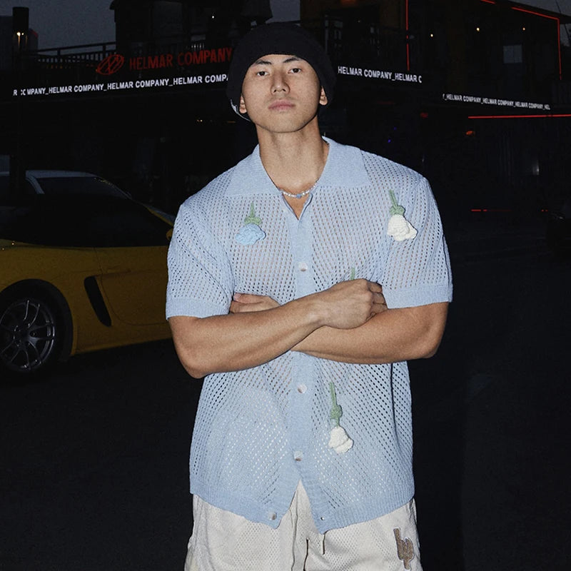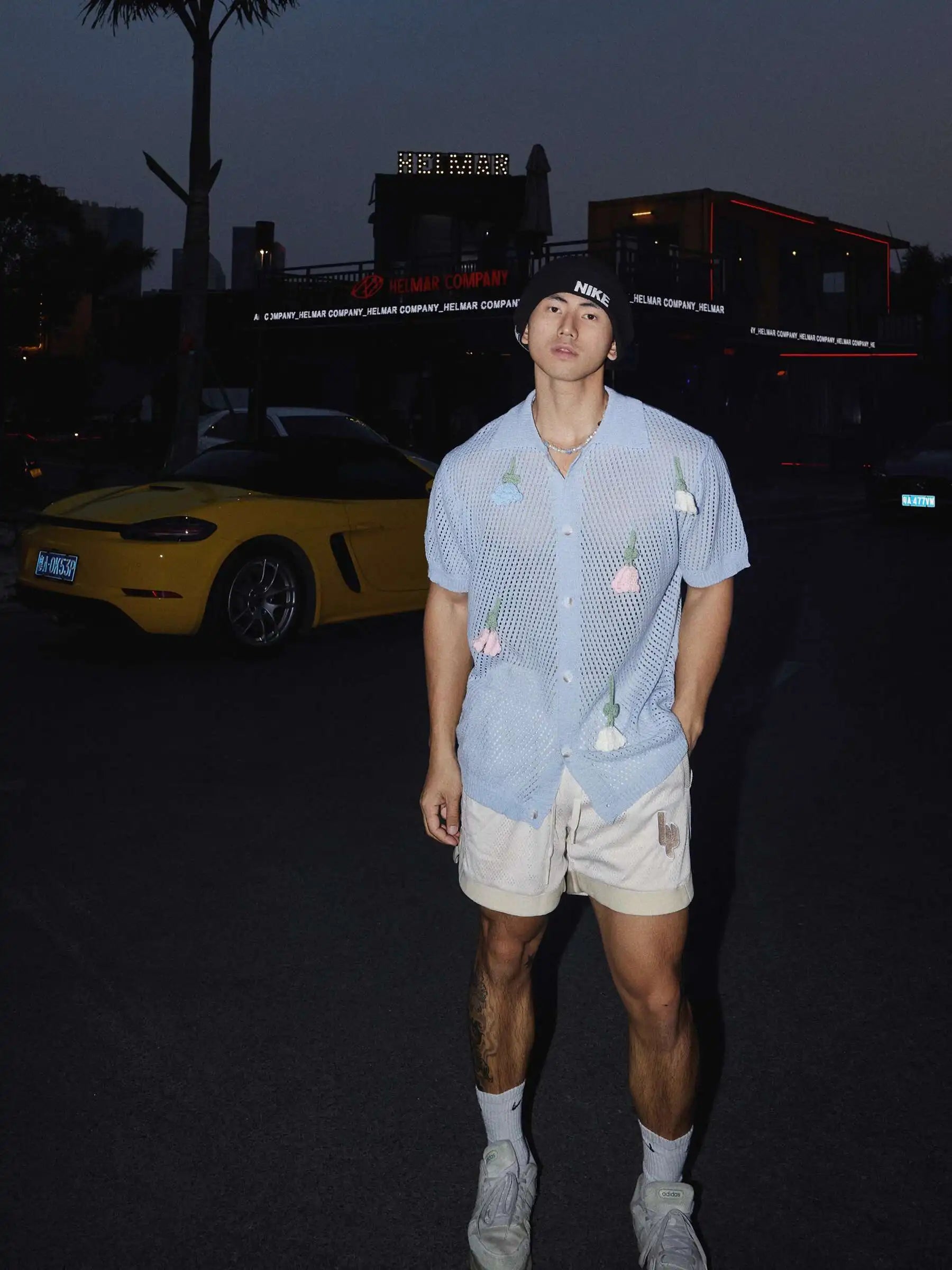 WIAOFELLAS - Niche Design Men's Shirts Three-dimensional Flowers Lapel Hollow Out Loose Short Sleeved Male Tops Single Breasted