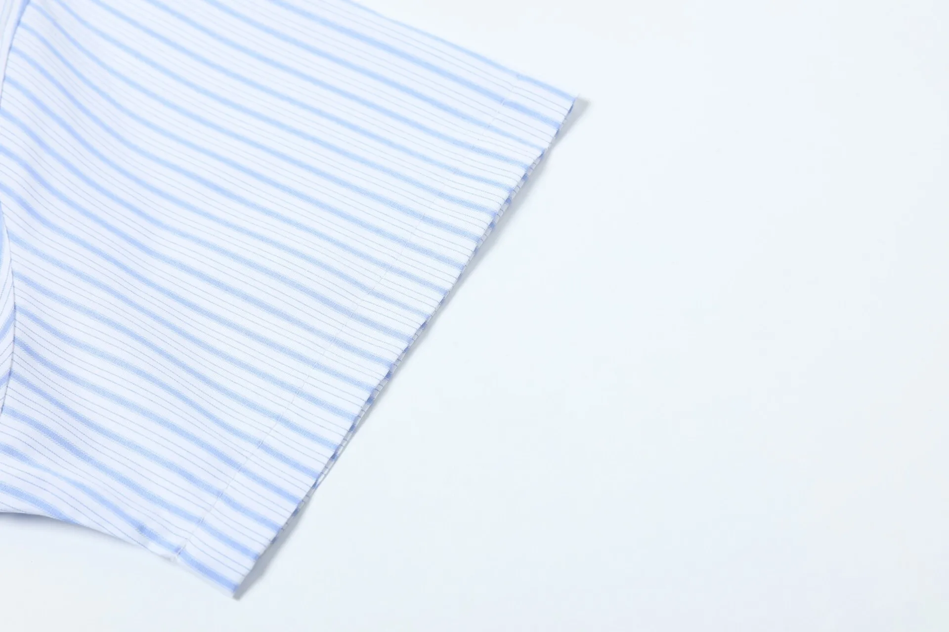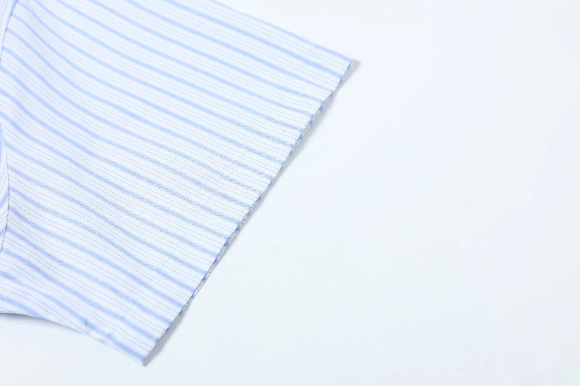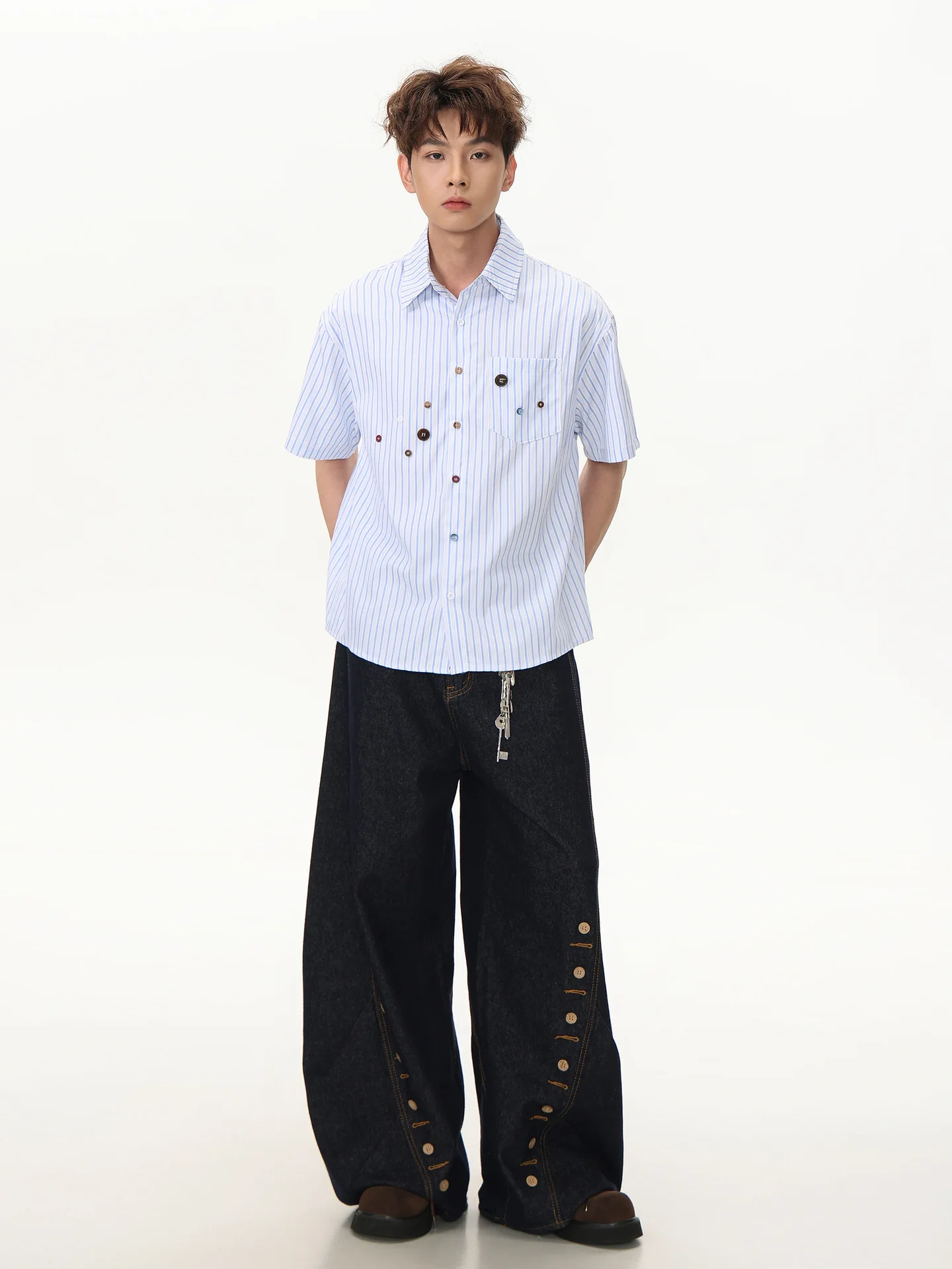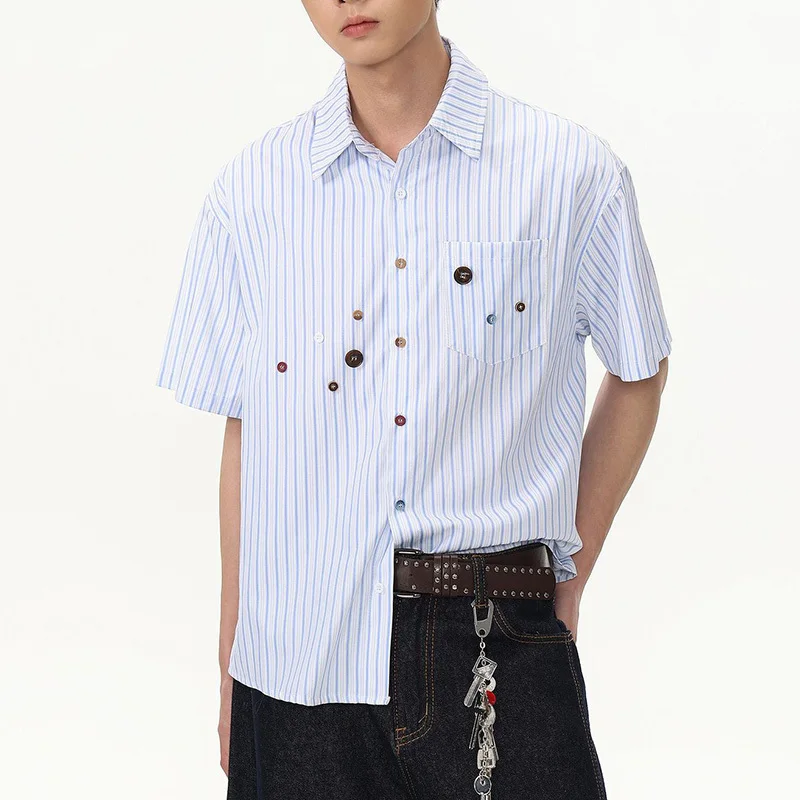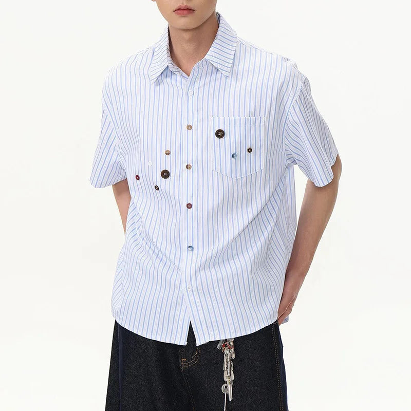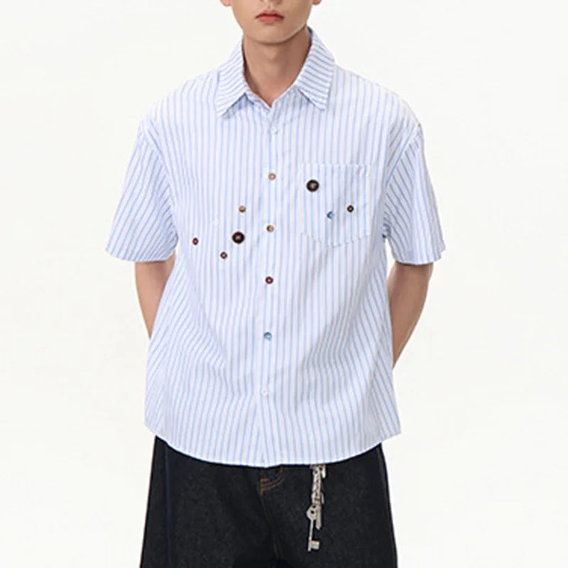 WIAOFELLAS - Niche Design Men's Shirts Turn-down Collar Vertical Stripe Single Breasted Button Decoration Short Sleeved Male Top
