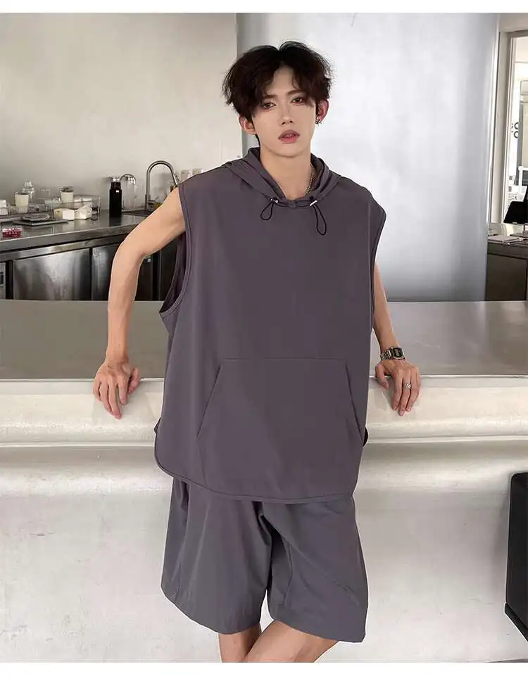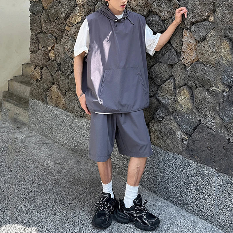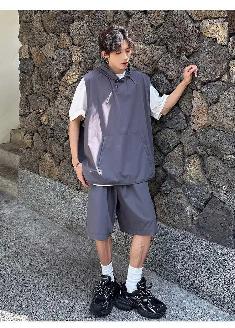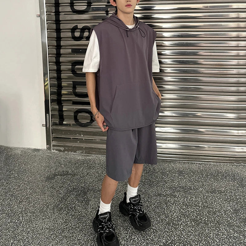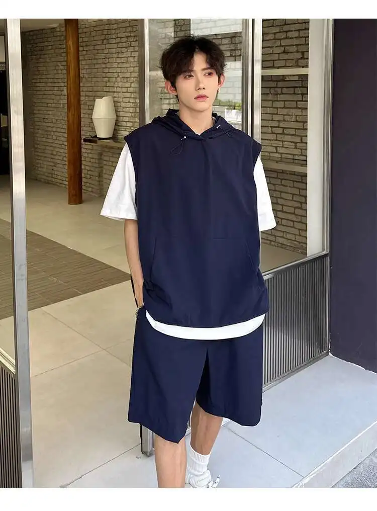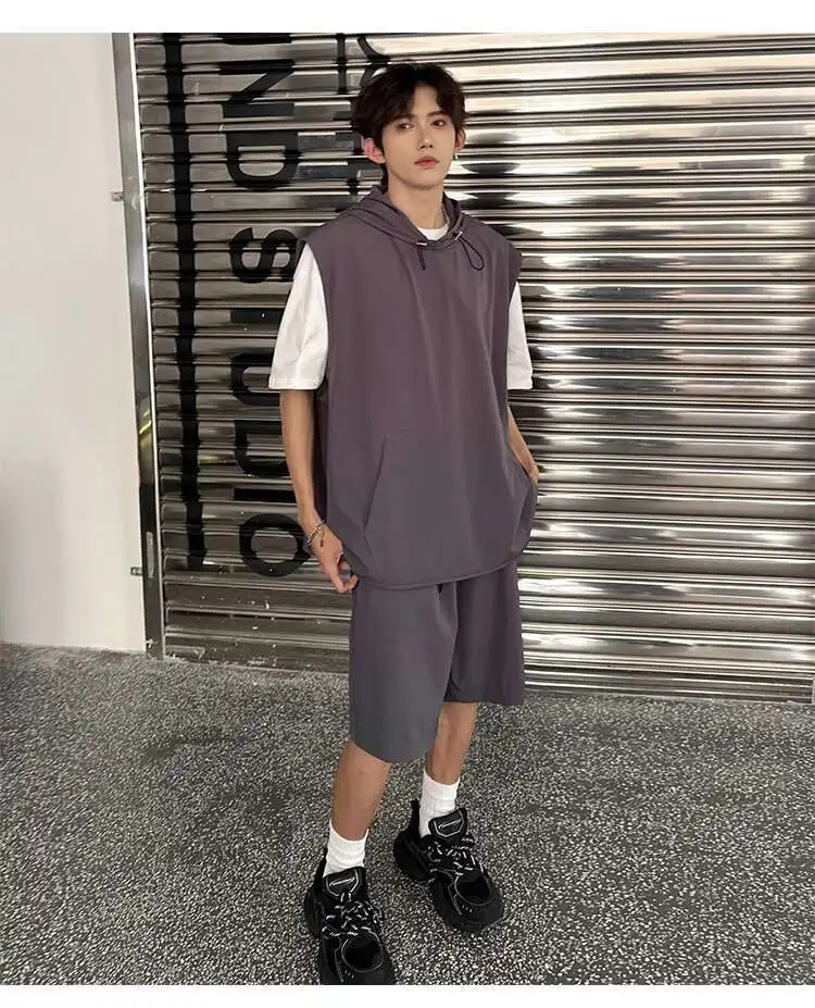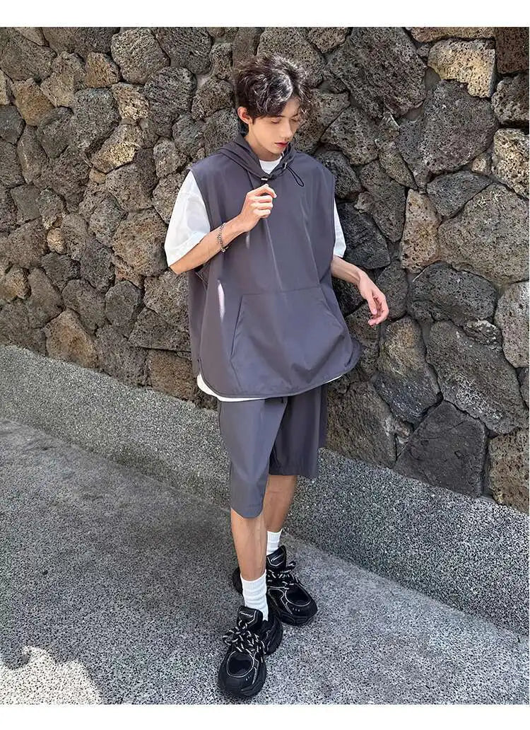 WIAOFELLAS - Niche Design Men's Two-piece Solid Color Drawstring Sleeved Hooded T-shirts Straight Wide Leg Loose Male Shorts