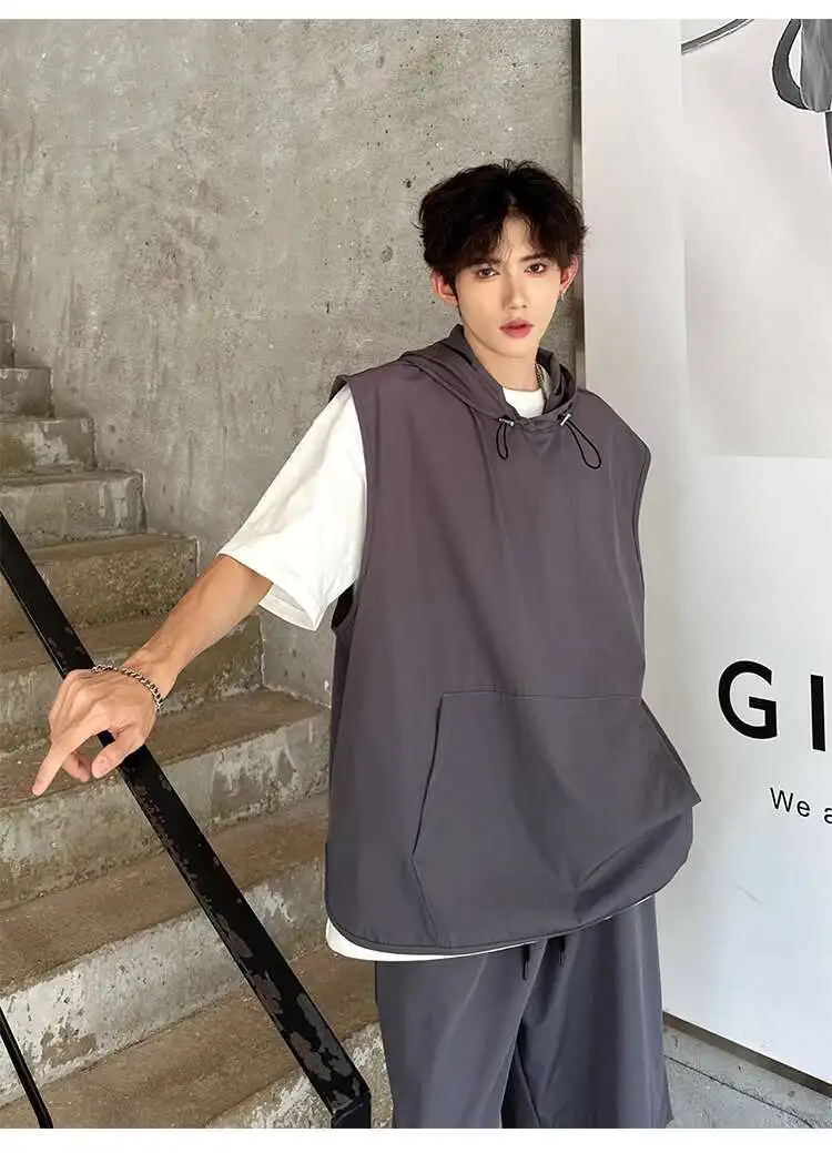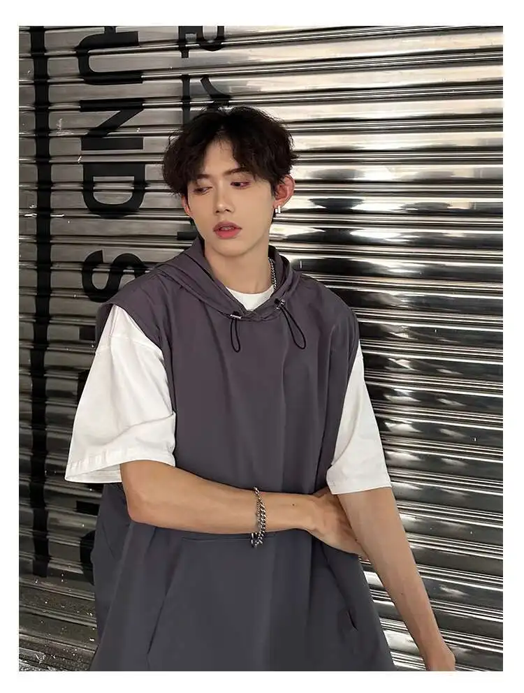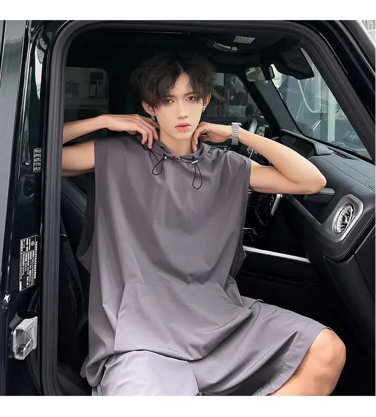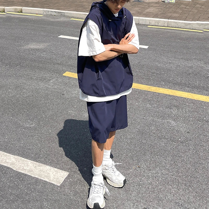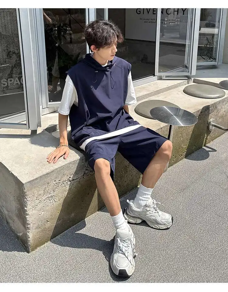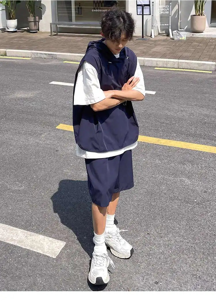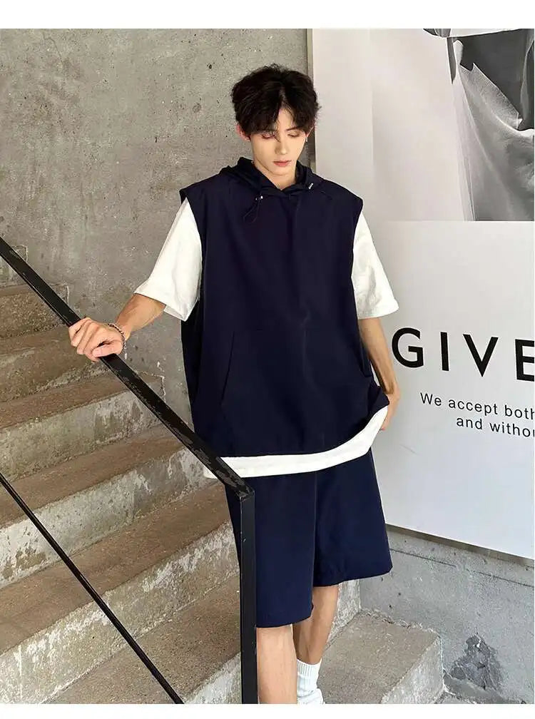 WIAOFELLAS - Niche Design Men's Two-piece Solid Color Drawstring Sleeved Hooded T-shirts Straight Wide Leg Loose Male Shorts
