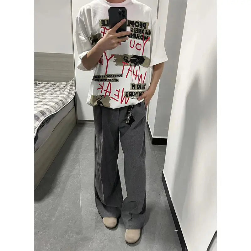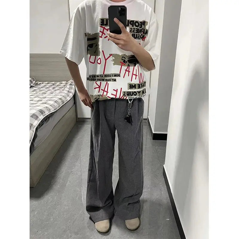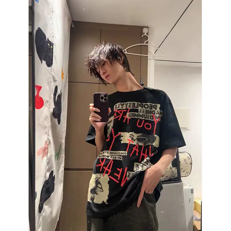 WIAOFELLAS - Oversized T Shirt for Men Summer New Cool Style High-end Designed Niche Temperature Fashionable Graffiti Print Short-sleeved Top