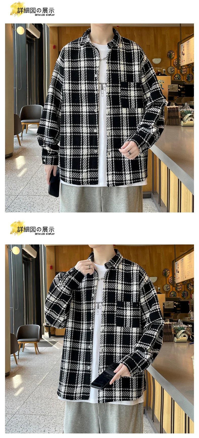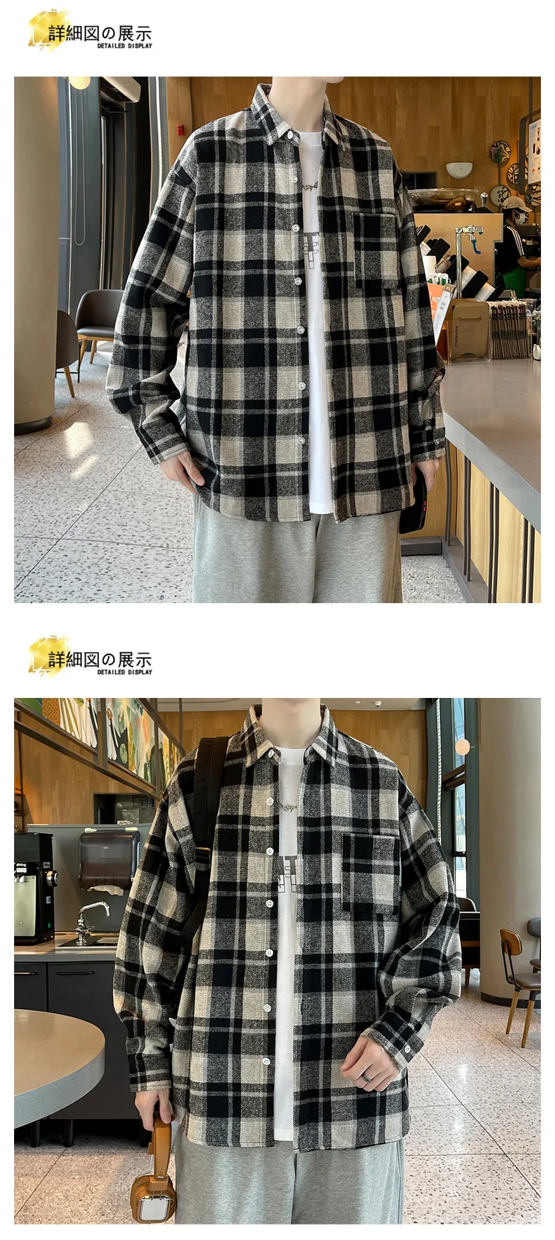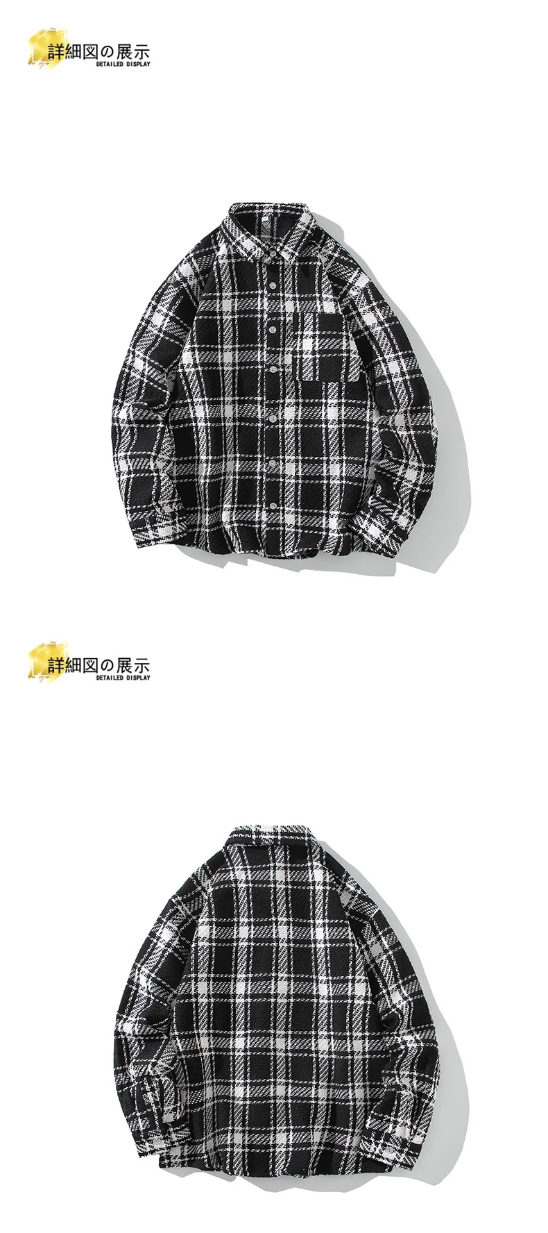 WIAOFELLAS - Plus Size Long Sleeved Thicken Woolen Shirts for Men Hip Hop Loose Men's Plaid Shirt Jackets Spring Autumn Trendy Mens Clothing