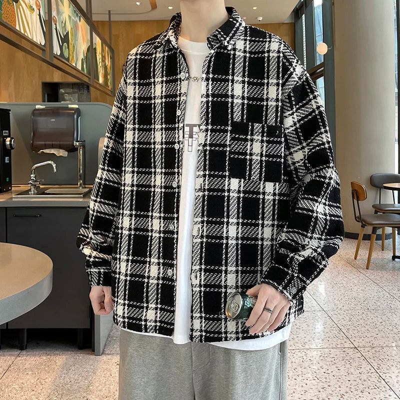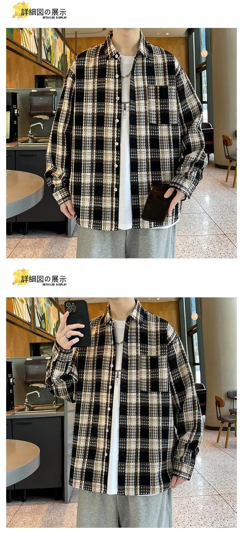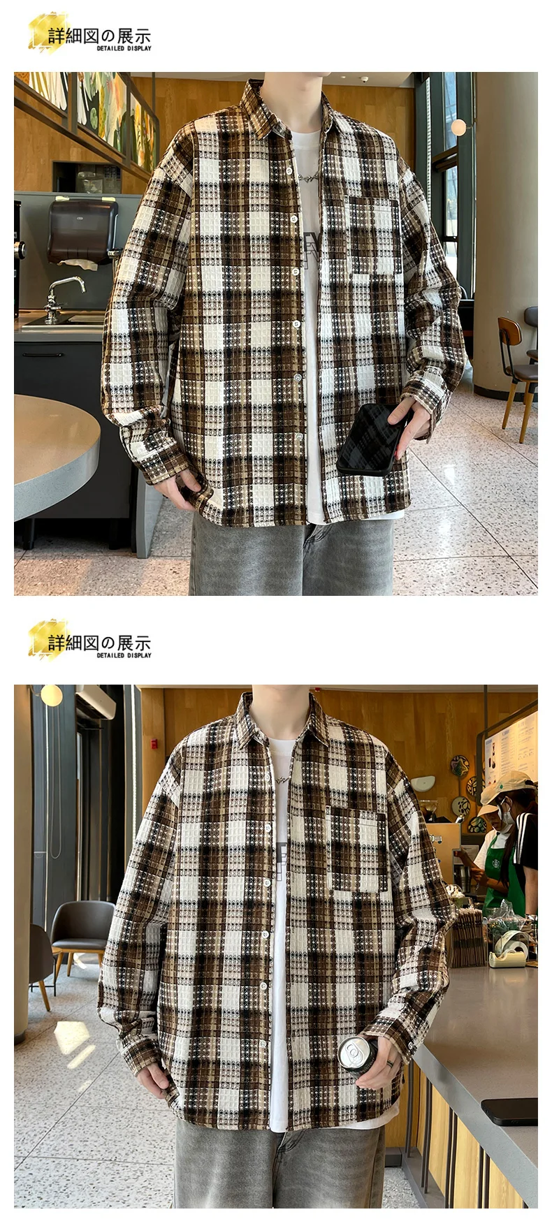 WIAOFELLAS - Plus Size Long Sleeved Thicken Woolen Shirts for Men Hip Hop Loose Men's Plaid Shirt Jackets Spring Autumn Trendy Mens Clothing