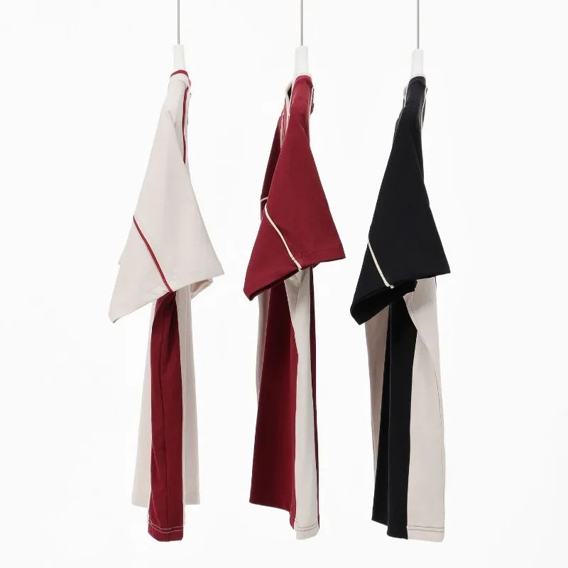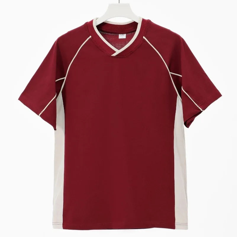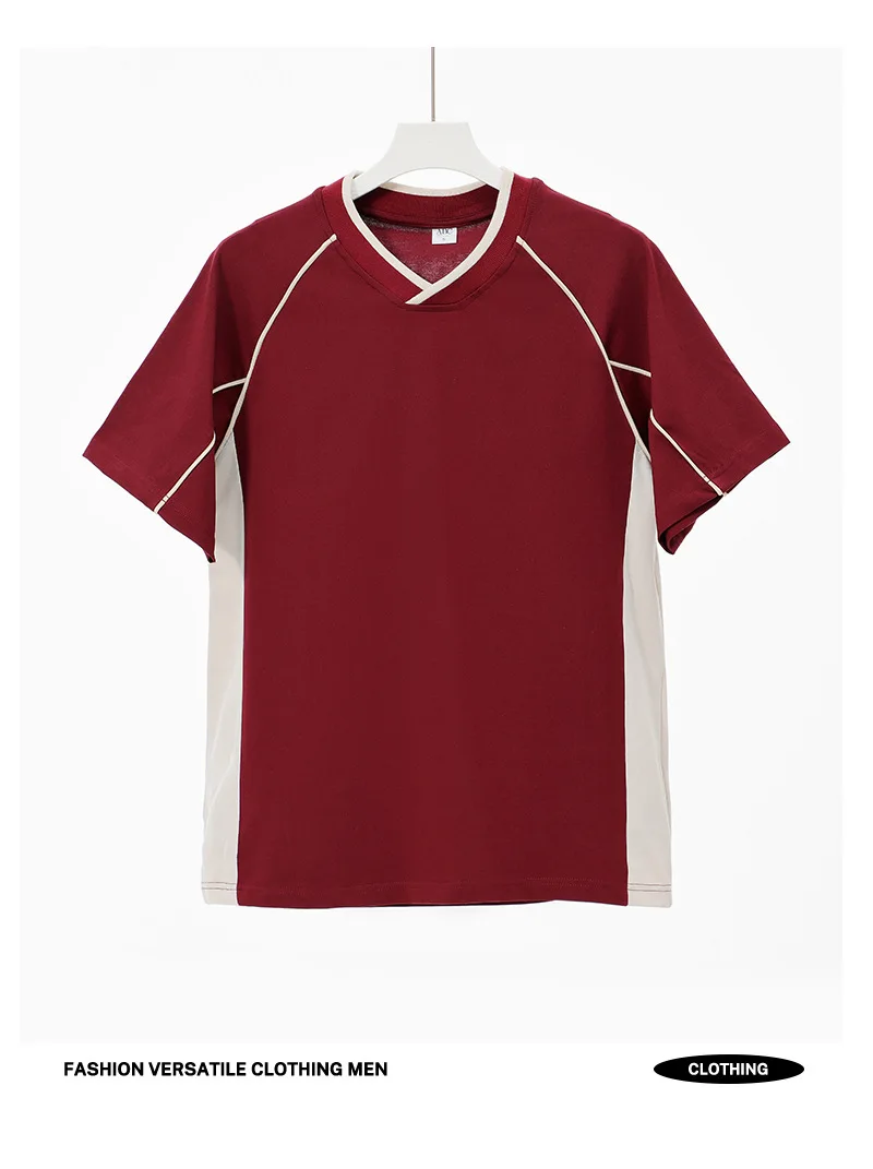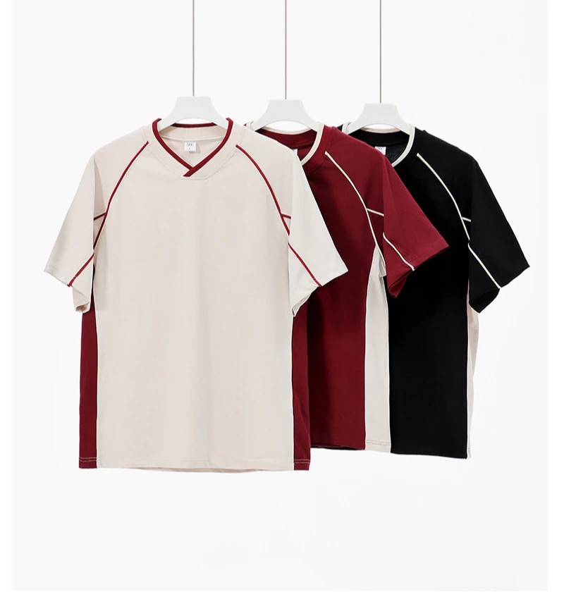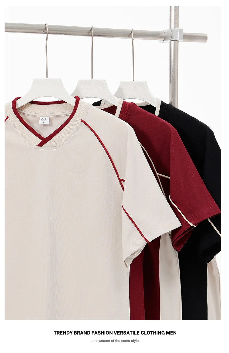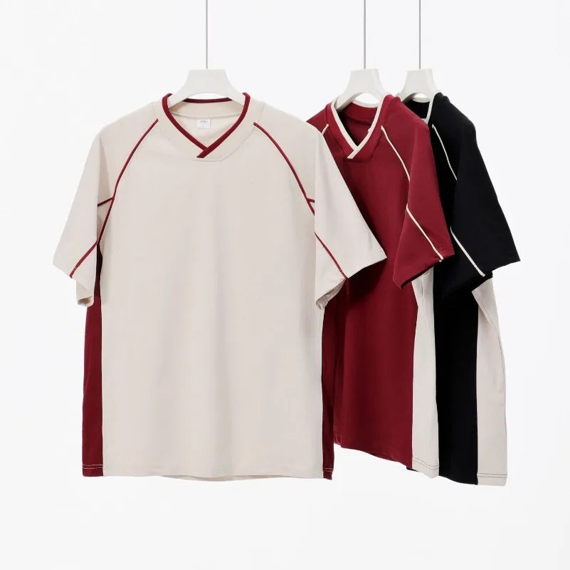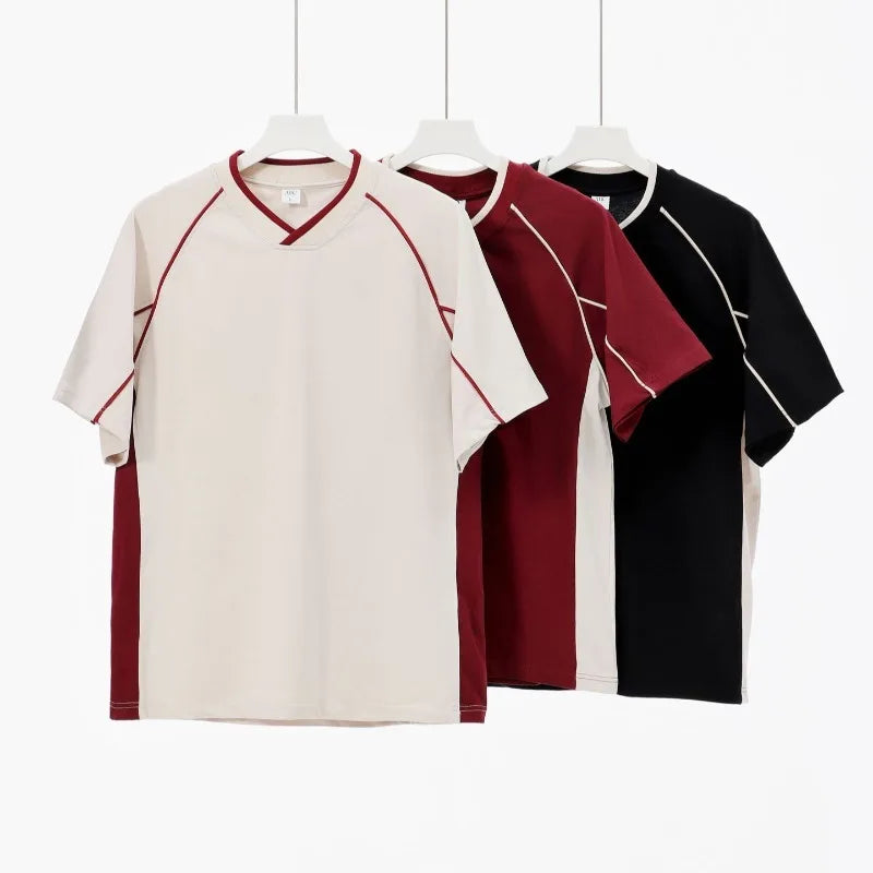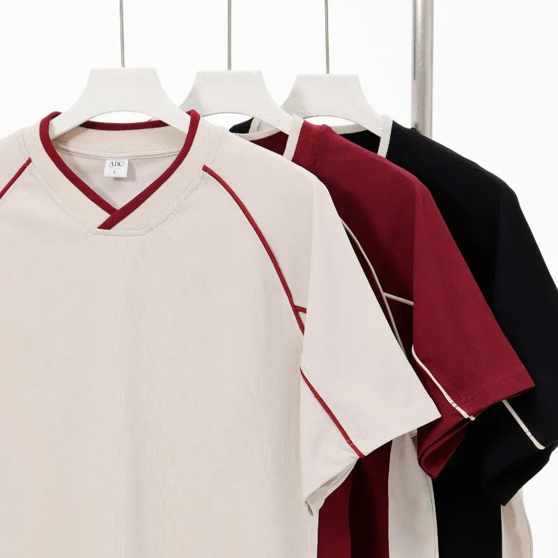 WIAOFELLAS  -  Retro 260g Contrasting Lines V-neck Short-sleeved T-shirt Men's Trendy Brand Loose Design T-shirt Top